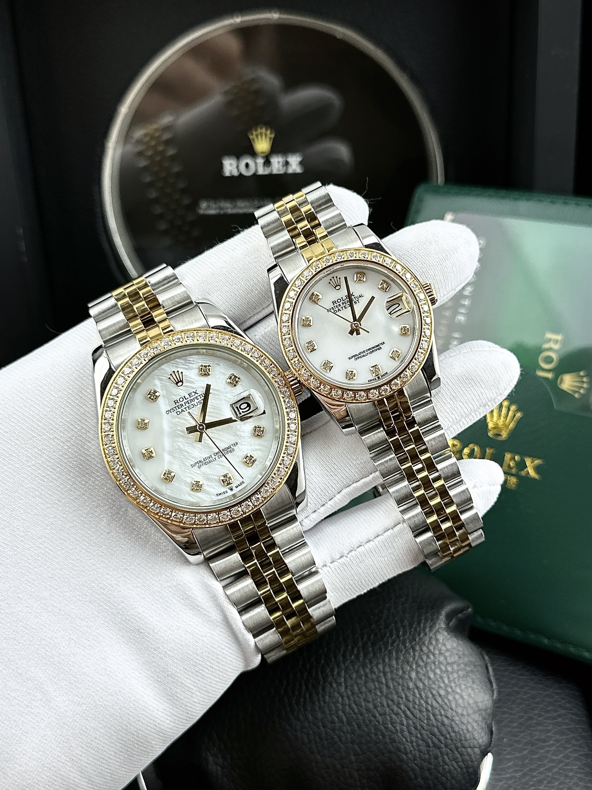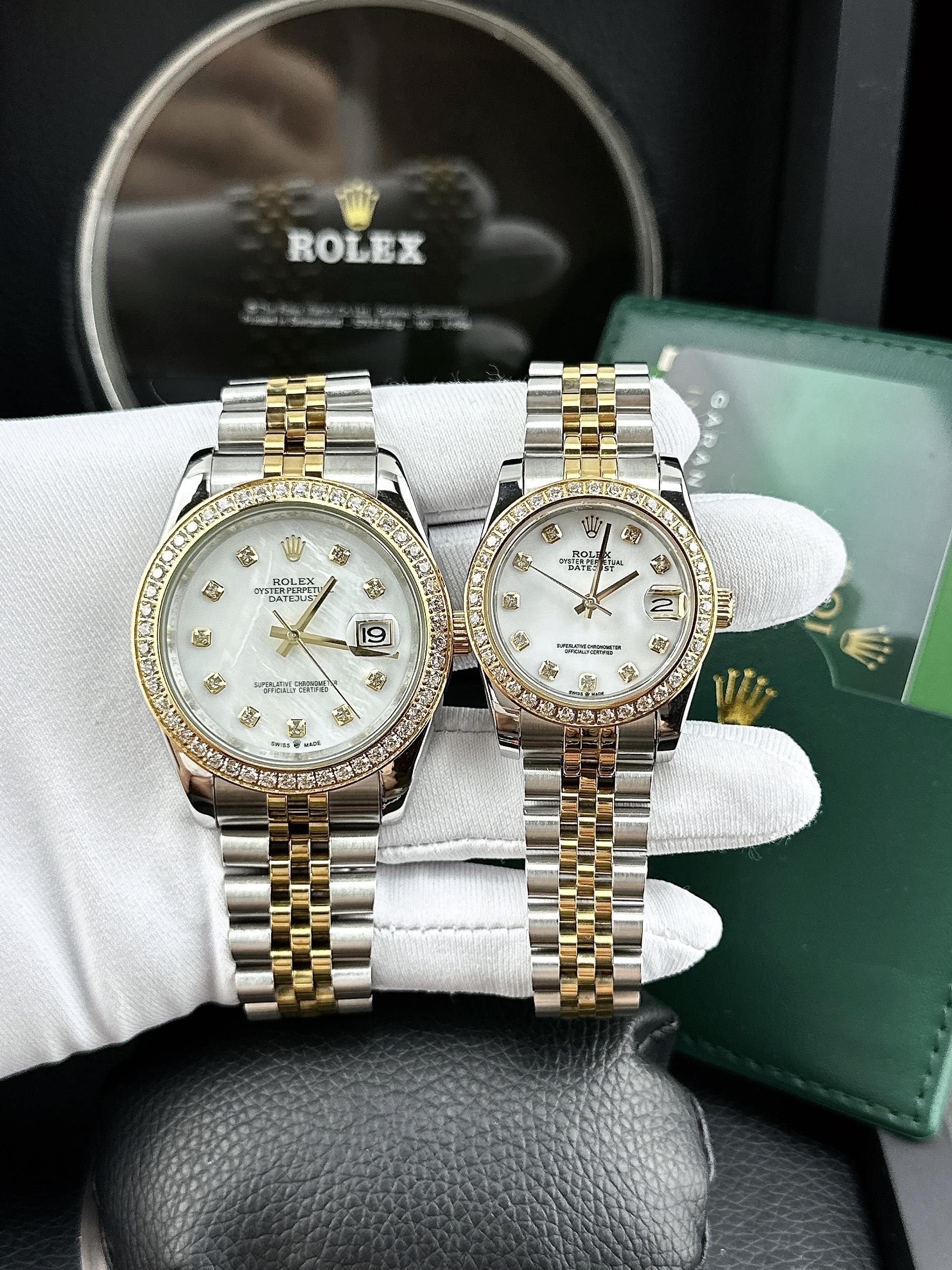 Đồng hồ cặp Rolex Datejust demi gold đính đá super fake 11 máy cơ