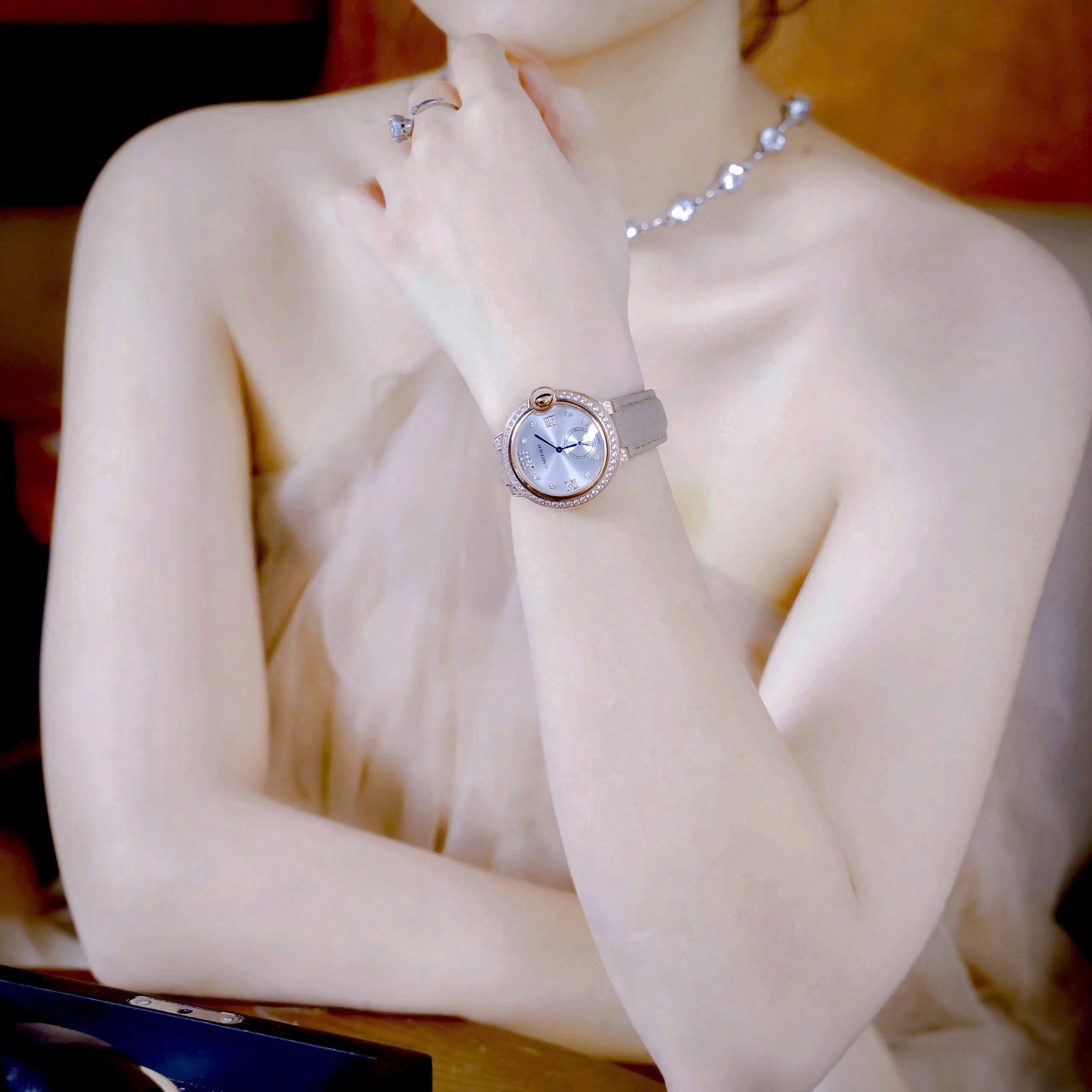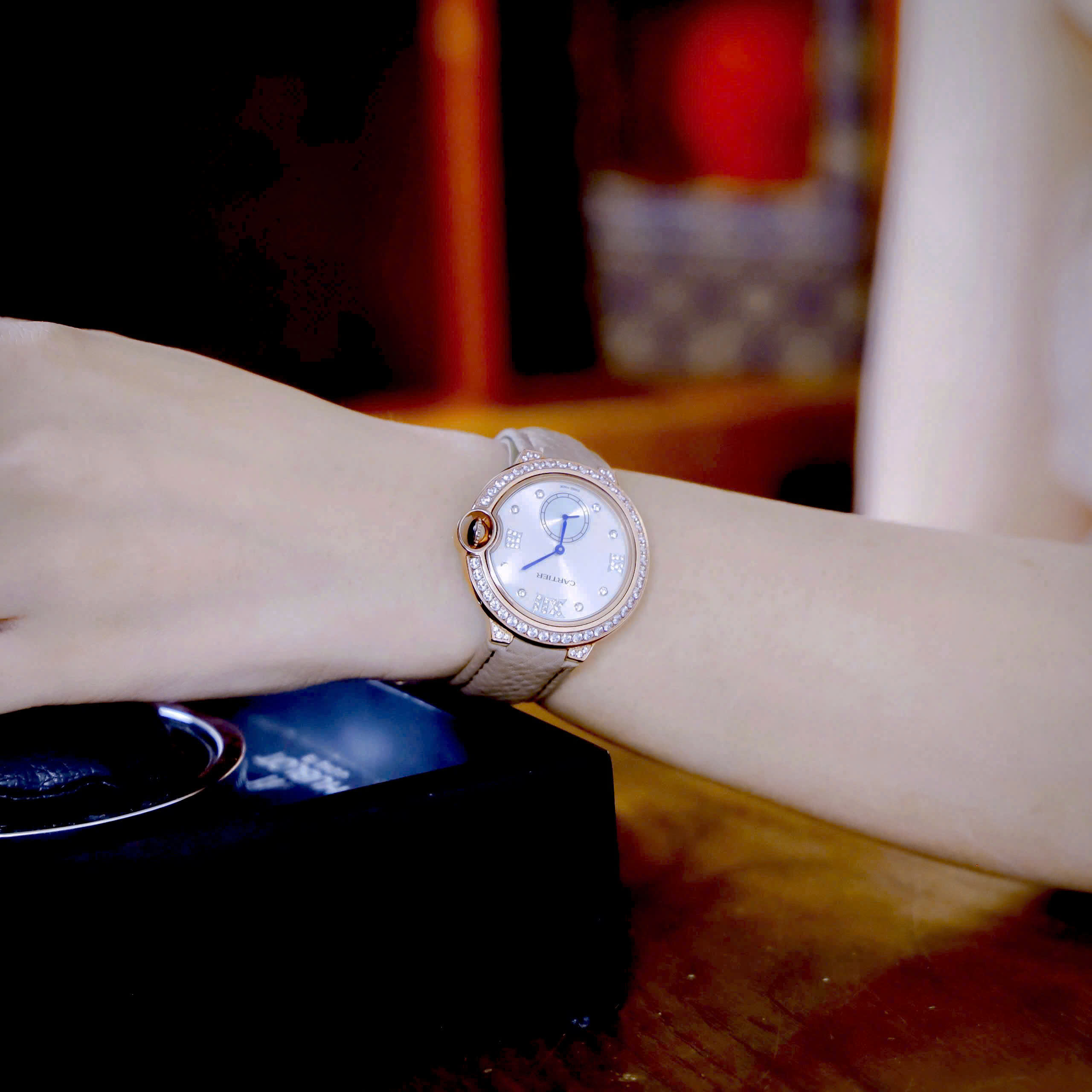 Đồng hồ Cartier Ballon Bleu đính đá mặt xà cừ dây da like auth 36mm
