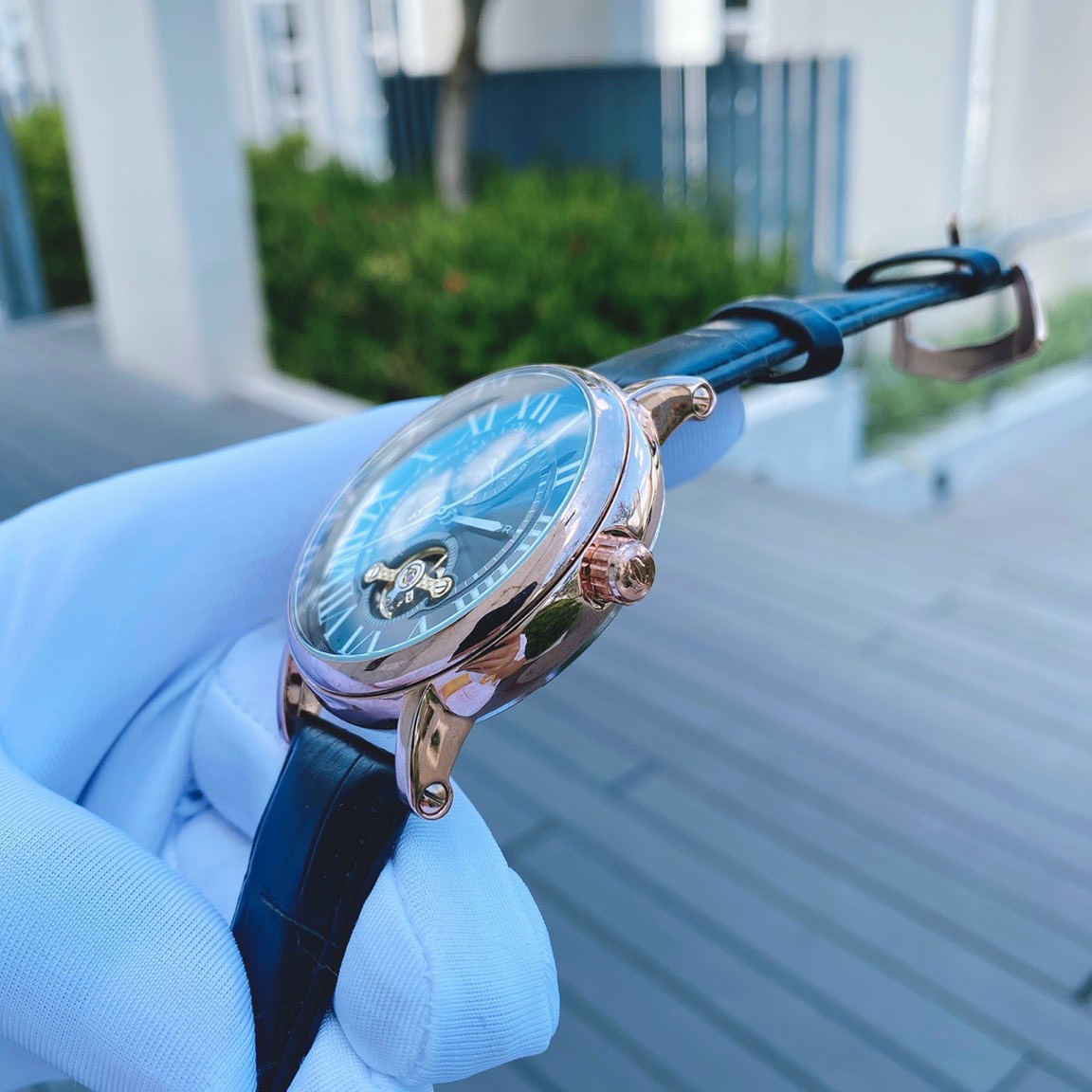 Đồng hồ Cartier nam dây da màu đen viền vàng hồng