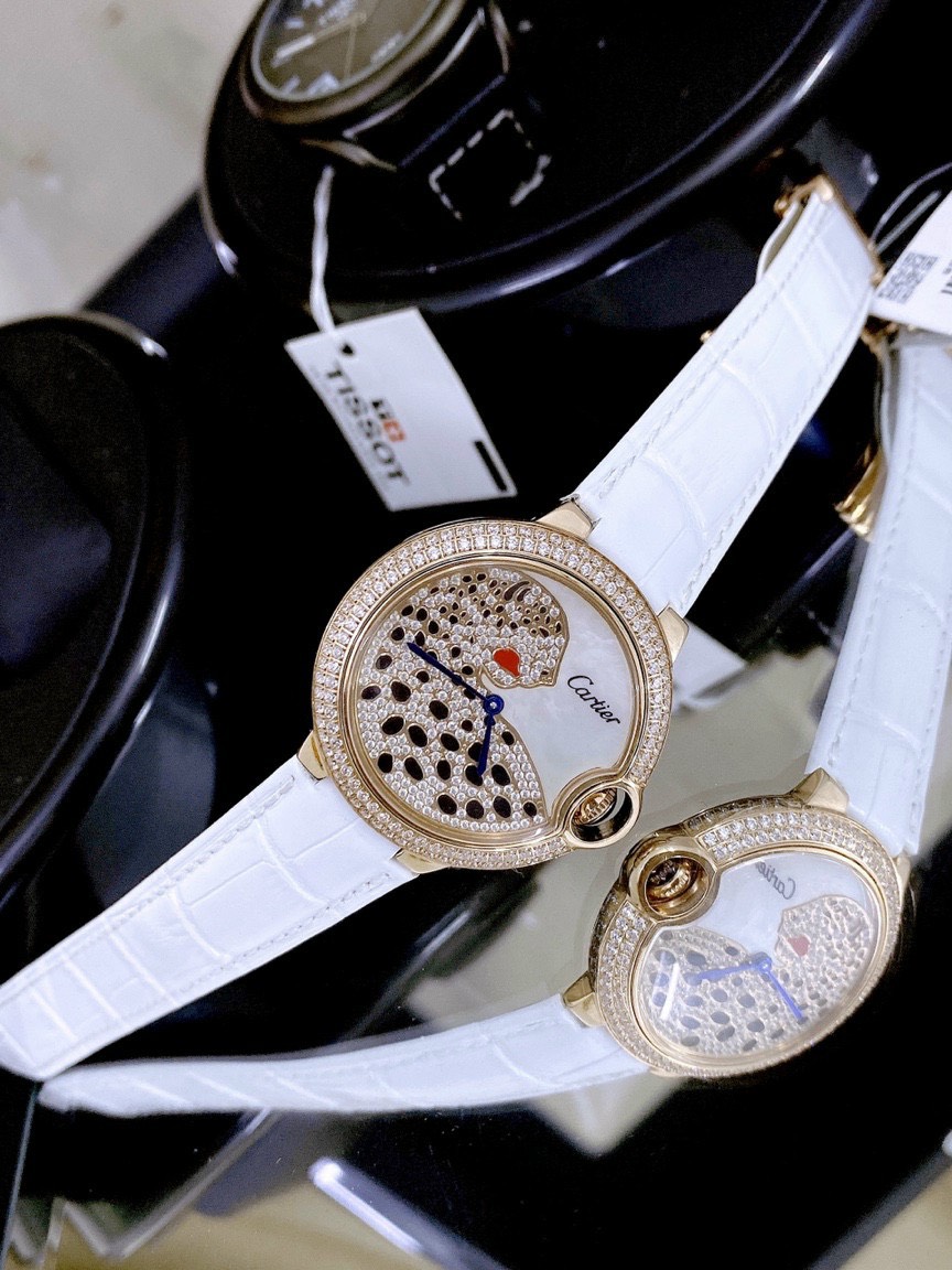 Đồng hồ Cartier nữ dây da màu trắng Cartier Jaguar đính đá Super Fake 1:1 36mm