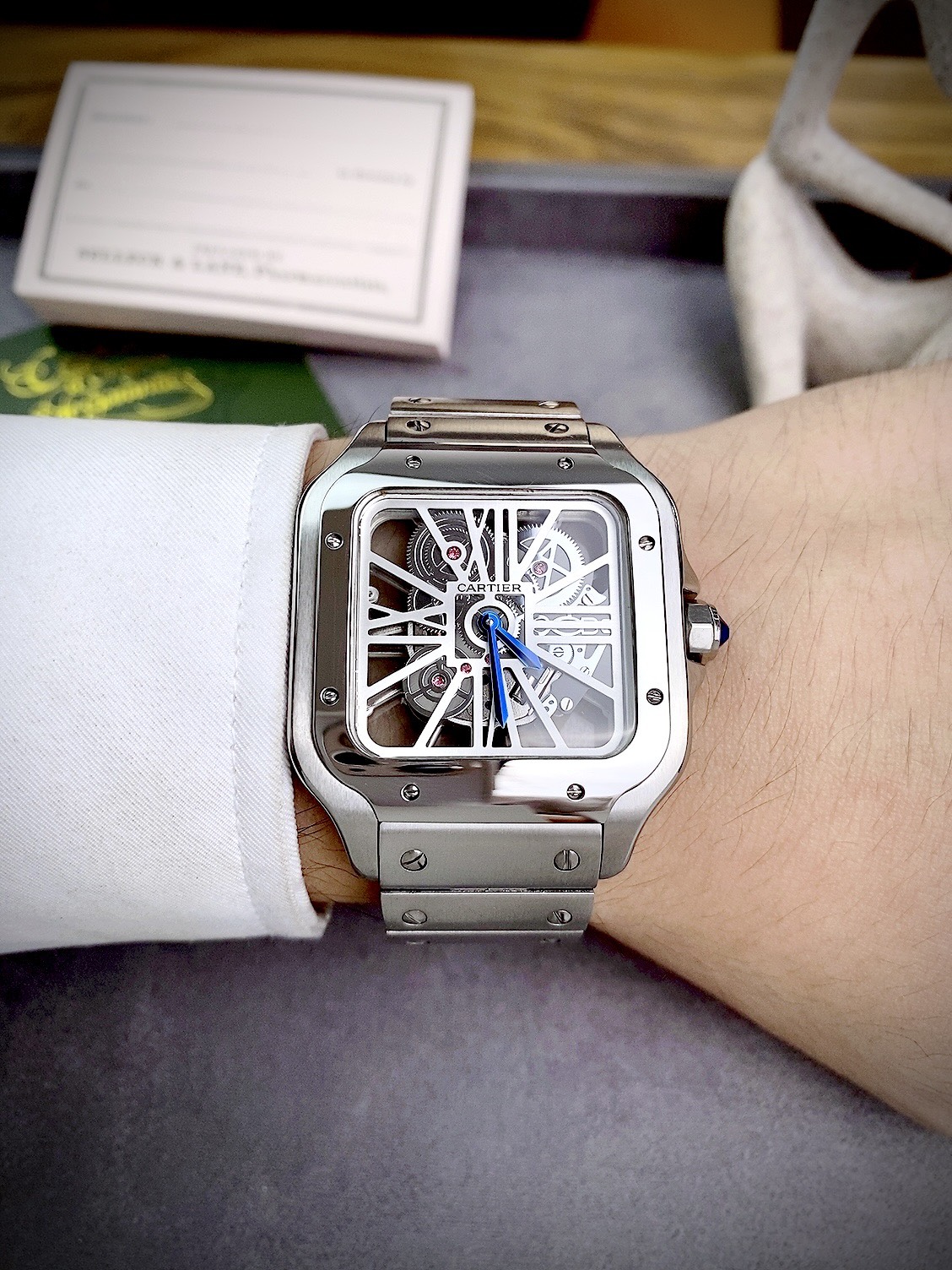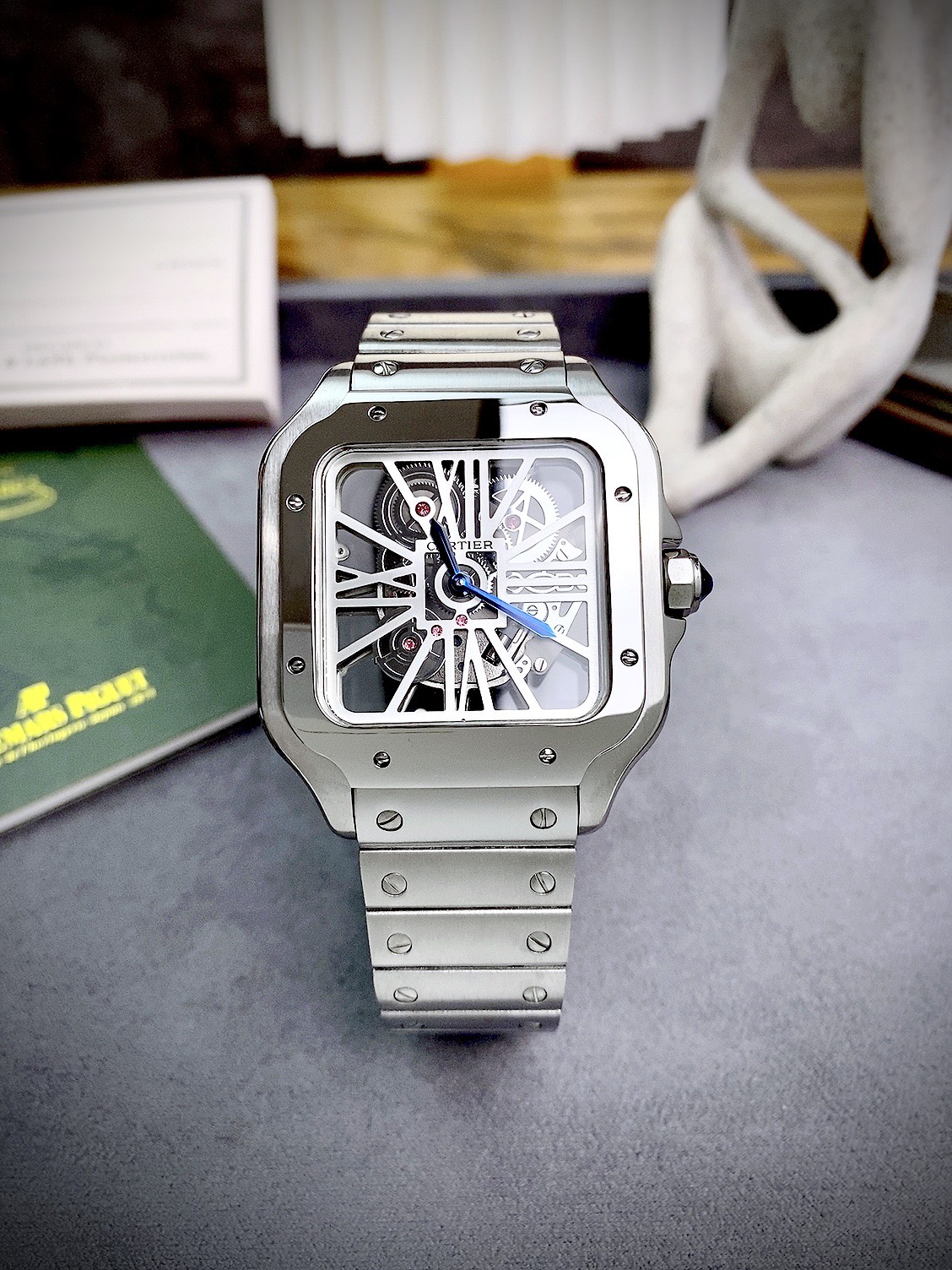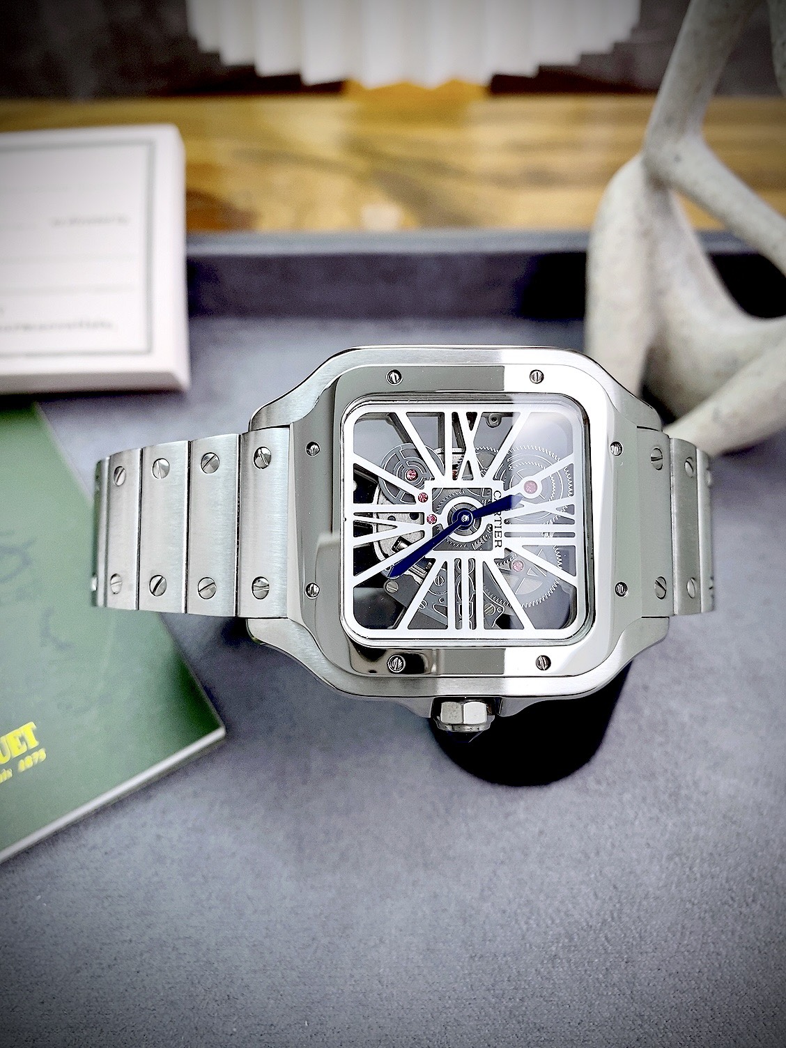 Đồng hồ Cartier Santos Skeleton lộ full máy dây kim loại nam 40mm