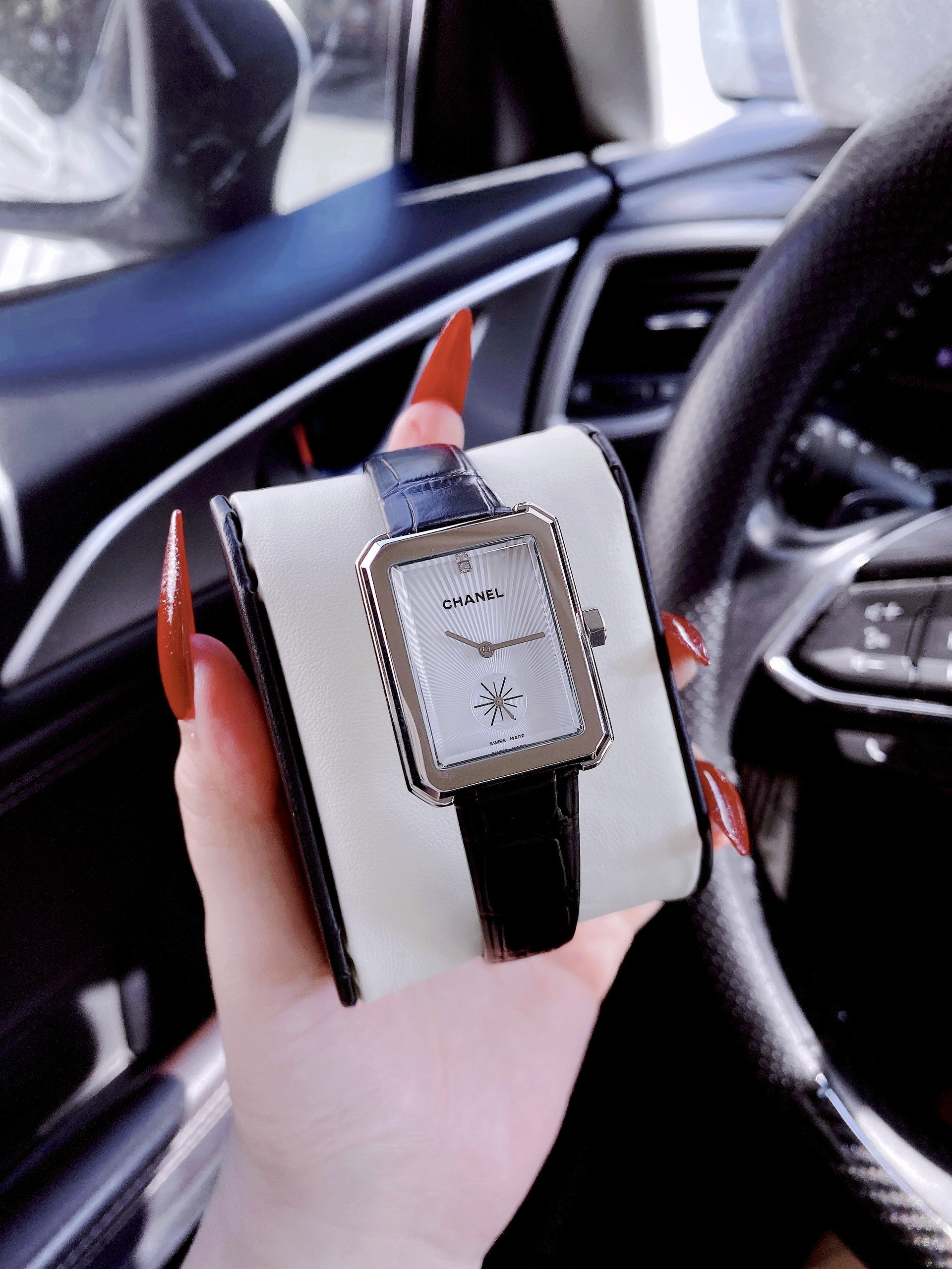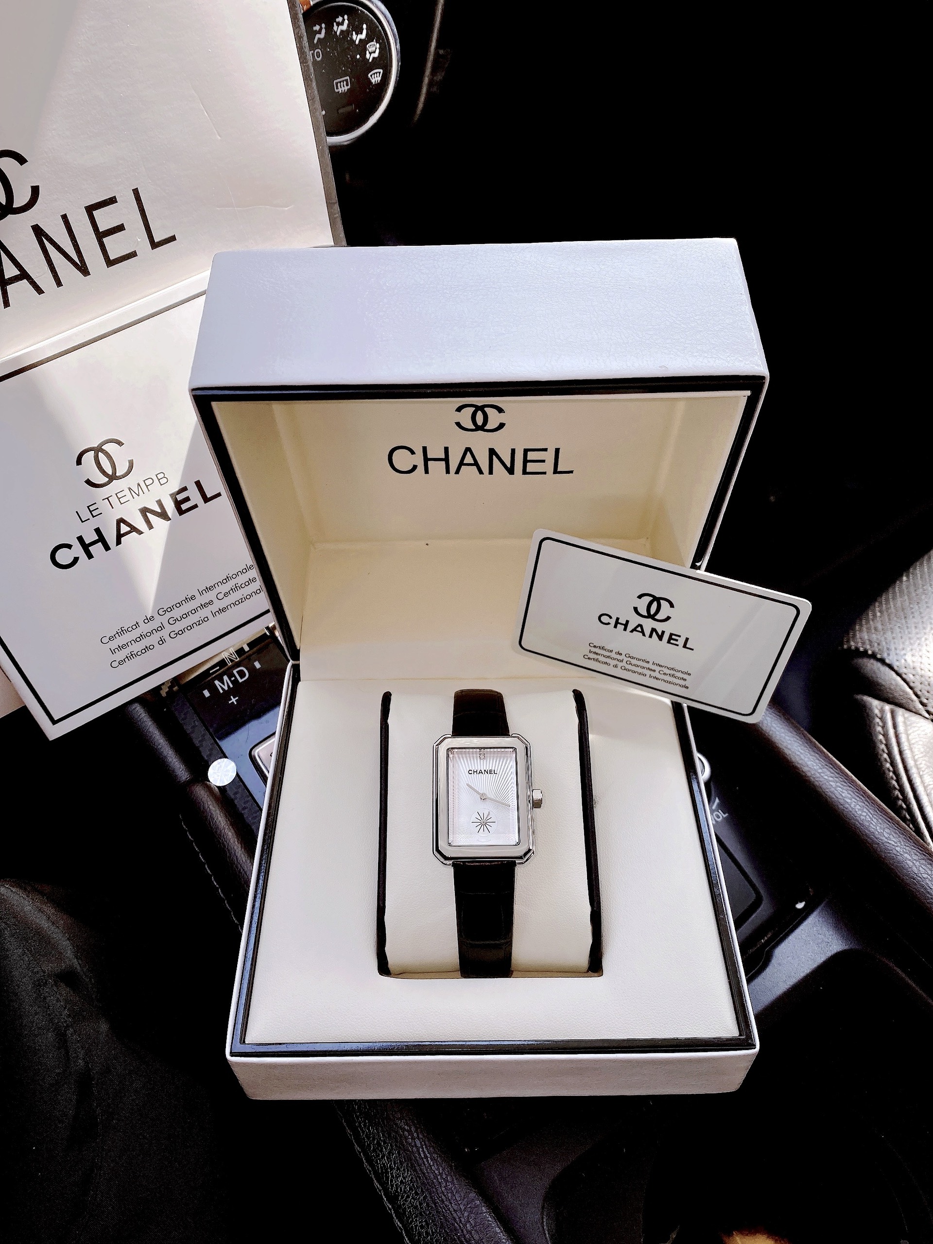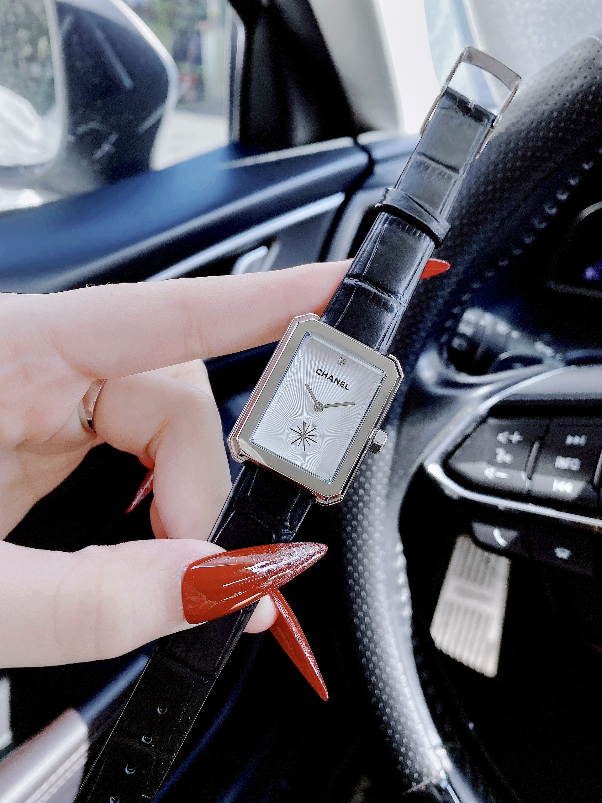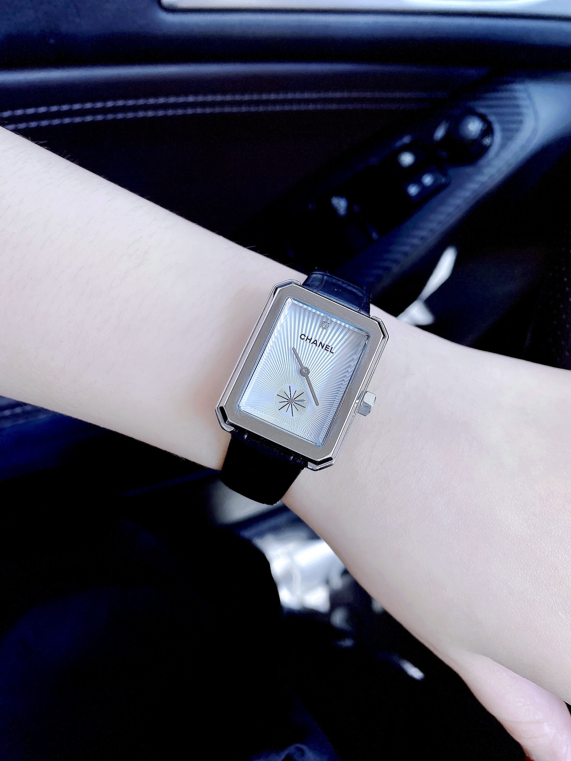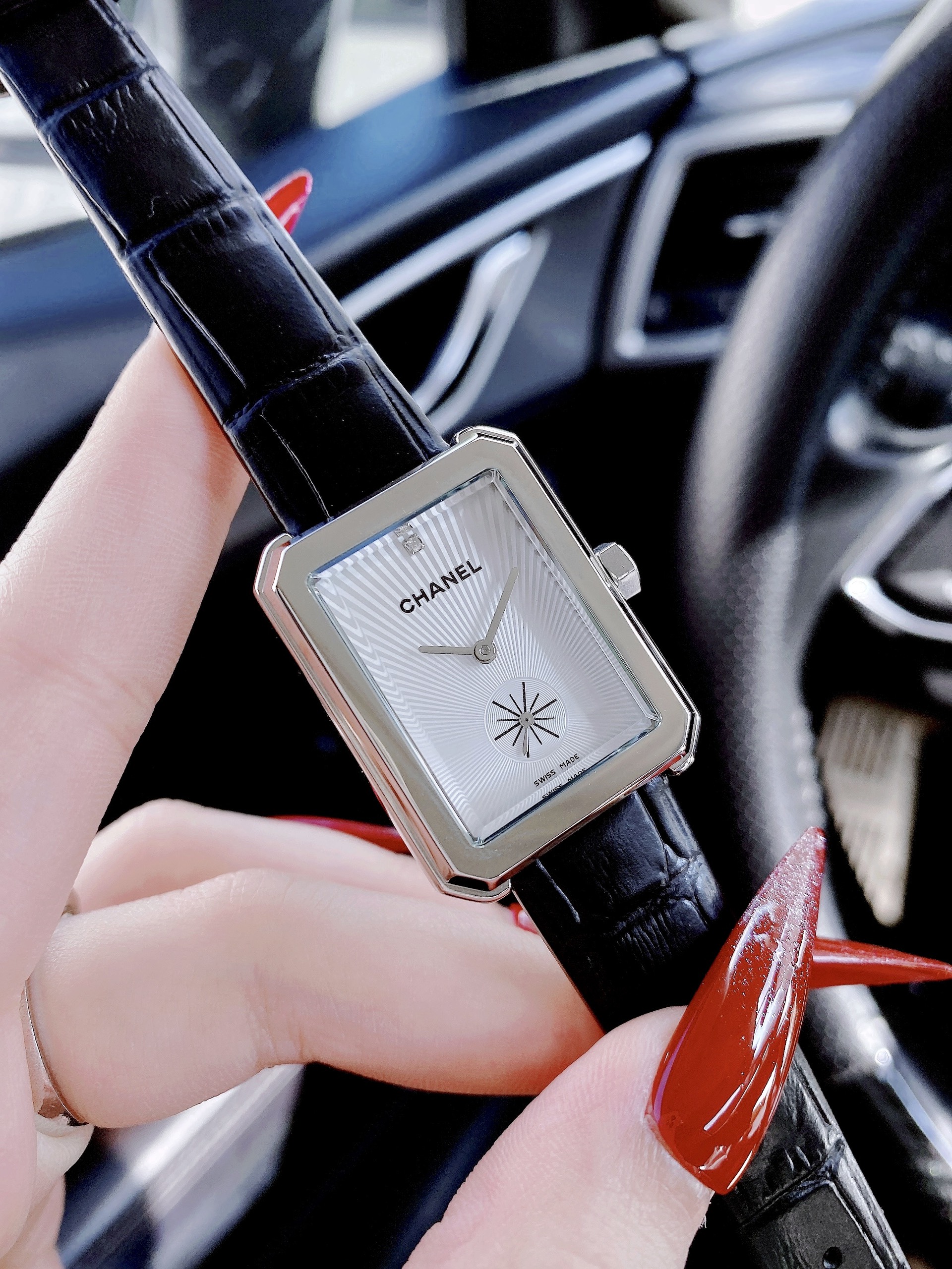 Đồng hồ Chanel nữ giá rẻ mặt chữ nhật dây da màu đen Like Auth