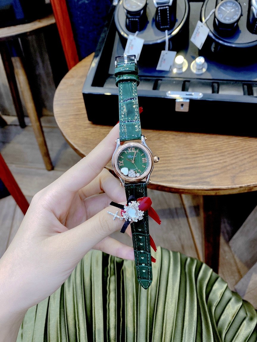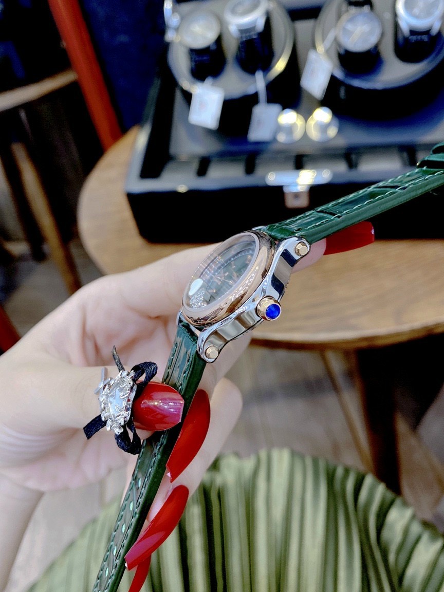 - Đồng hồ Chopard nữ dây da màu xanh lá cây tượng trưng cho sự phát triển, hòa thuận và cảm giác an toàn