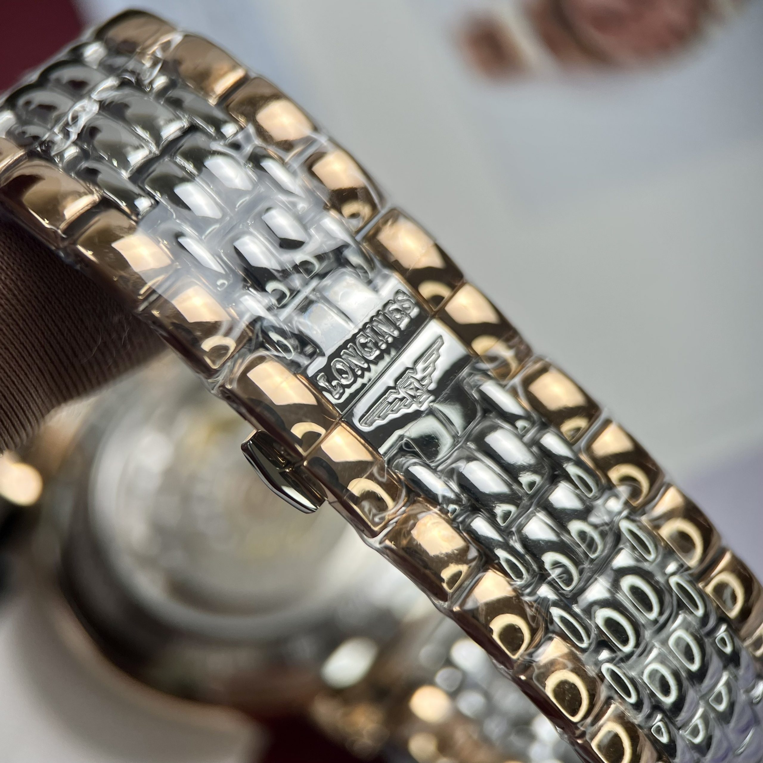 Phần dây có 5 mắt nối vào với nhau. Những điểm vàng tất cả được mạ PVD 18k cao cấp. Khóa được làm khóa đôi ( hay còn gọi khóa bướm ) đóng, gập rất dễ dàng, trên chốt bên ngoài mặt dây được in logo Longines.