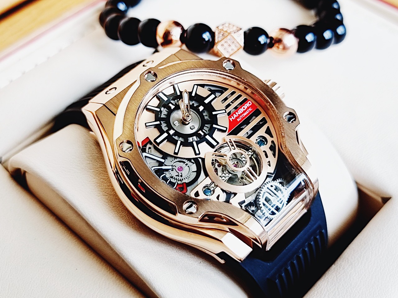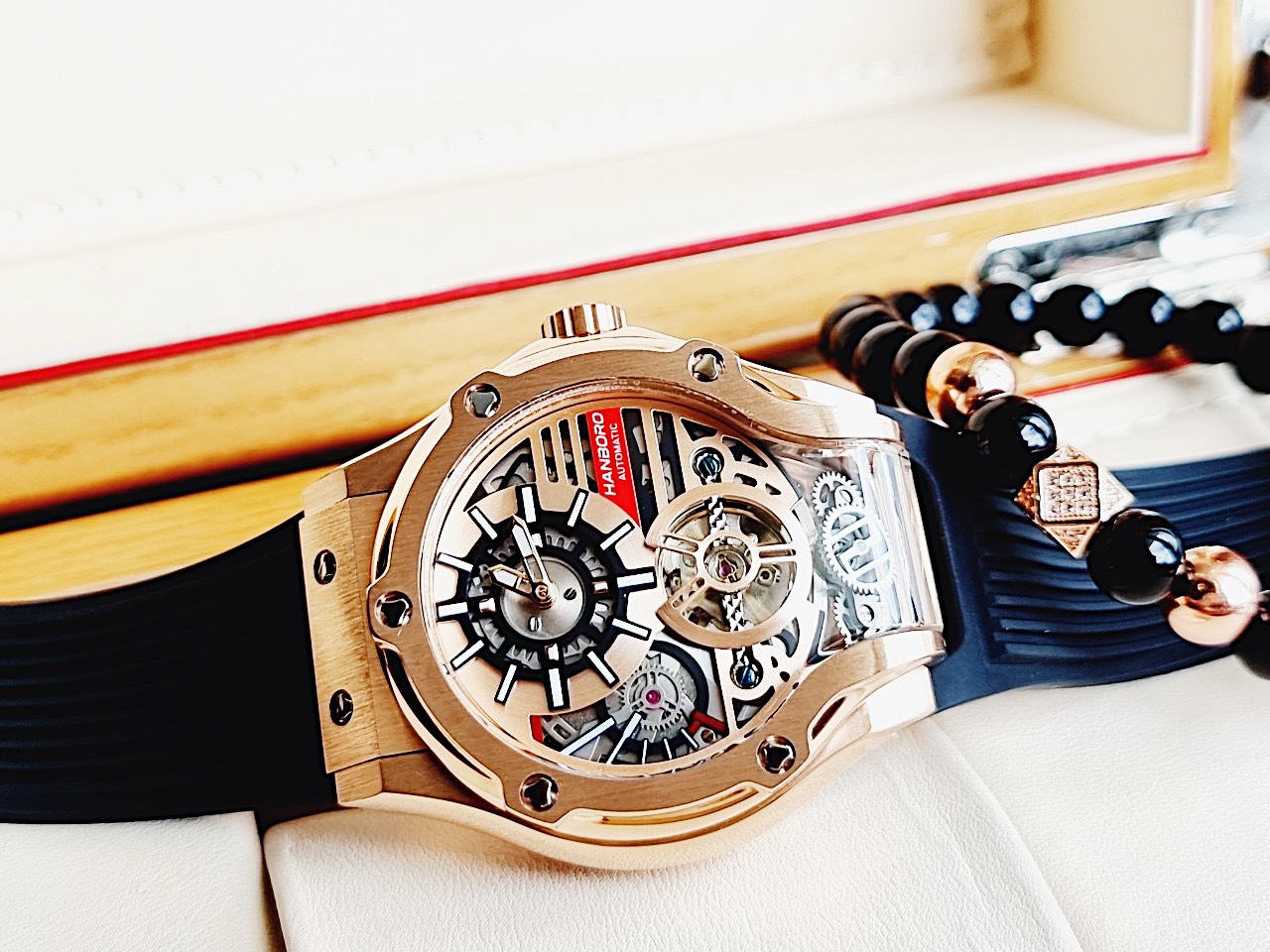 - Đồng hồ cơ nam Hanboro Automatic chính hãng thiết kế theo phong cách Hublot phiên bản siêu xe Ferrari đình đám