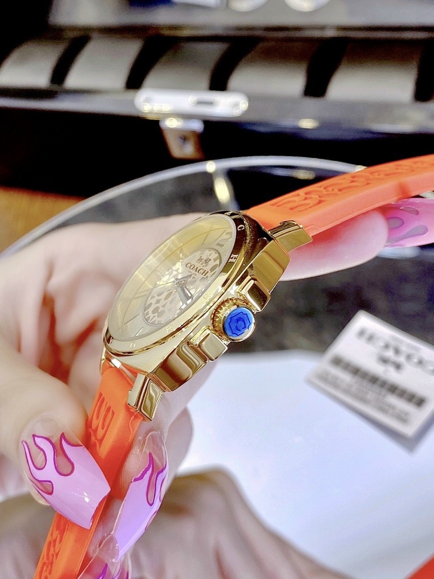 - Đồng hồ Coach nữ dây cao su màu cam thụ hưởng sự mạnh mẽ của màu đỏ và sự hạnh phúc của màu vàng