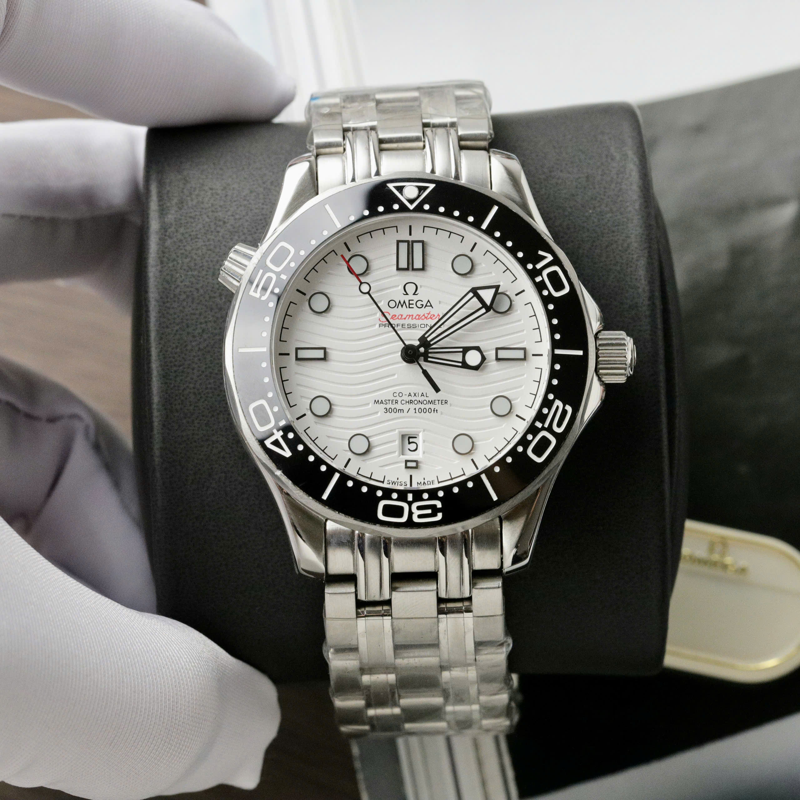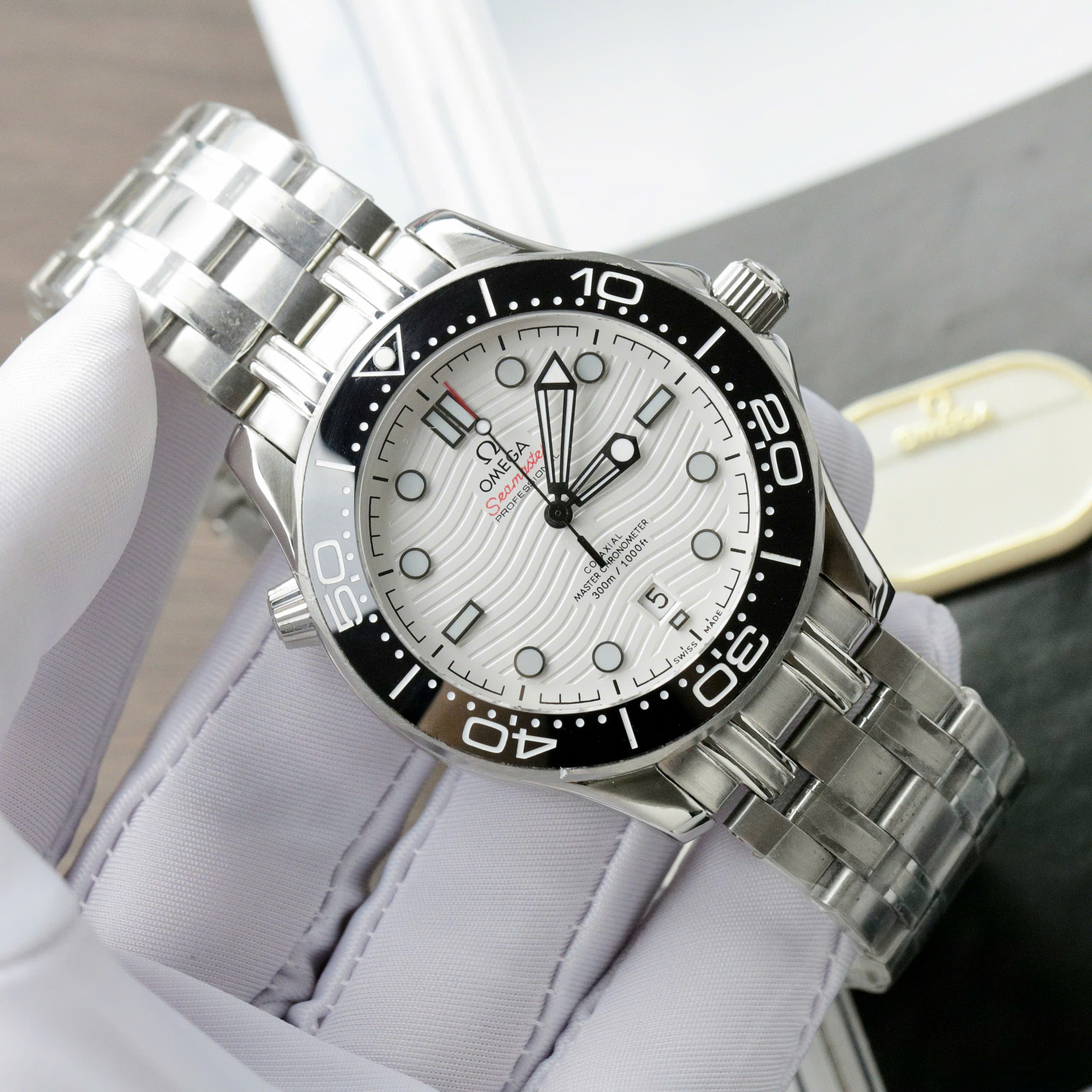 Đồng hồ Fake 11 Omega Seamaster nam mặt trắng dây kim loại 42mm