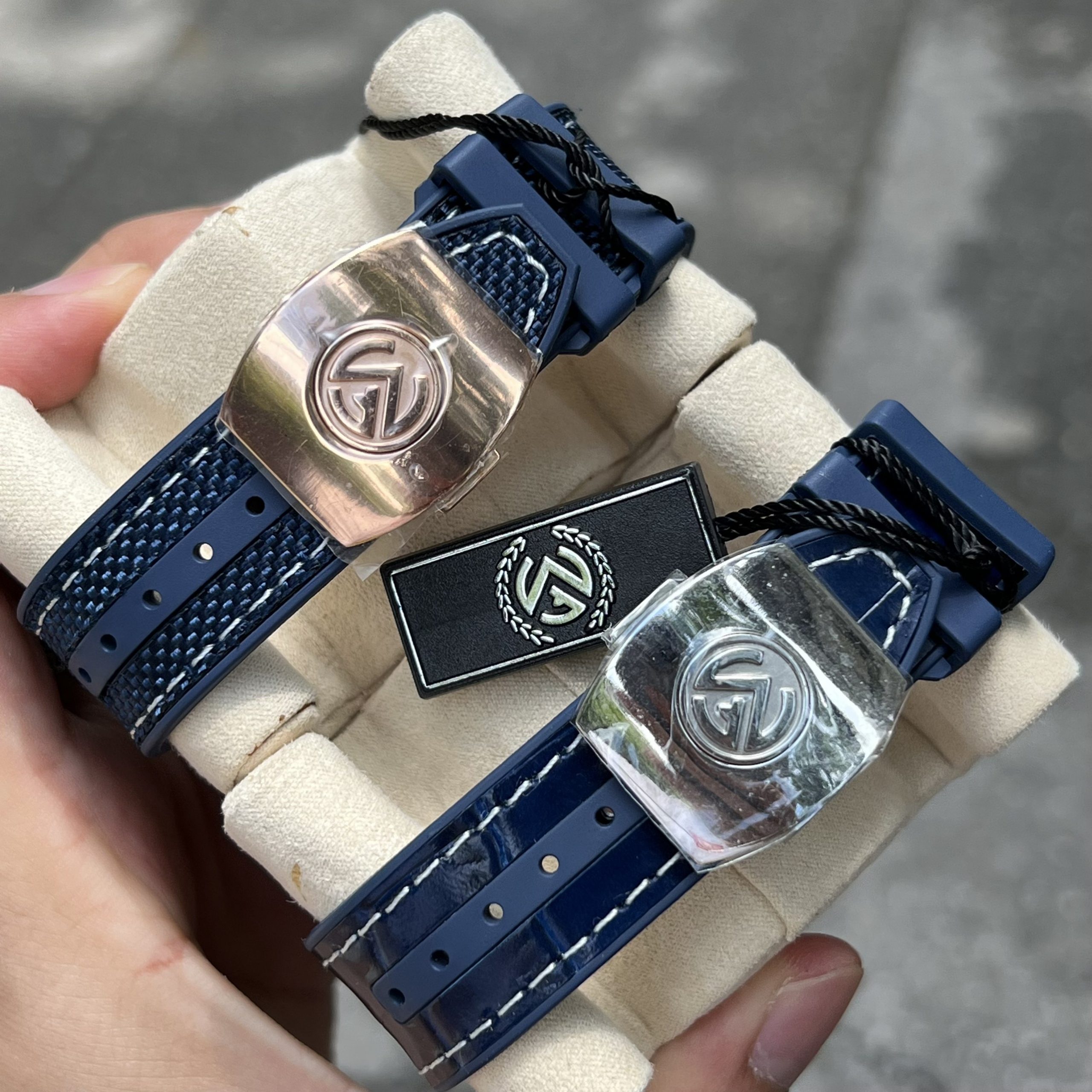 Kết hợp với dây đeo đồng hồ làm từ chất liệu cao su với lớp vải bọc họa tiết vân sần nam tính. Tạo tác chính là tặng phẩm đích thực mà các quý ông đang tìm kiếm. Bên ngoài lớp vỏ cứng cáp là núm điều chỉnh được cố định bằng hai tai càng cùng tông màu với mặt số và dây đeo. Được khía rãnh cẩn thận. Bộ phận này không chỉ đảm nhiệm chức năng điều khiển bộ hiển thị thời gian trên mặt số mà còn khóa chặt vỏ đồng hồ giúp Franck Muller Vanguard Yachting chống thấm nước hiệu quả ở độ sâu 30m. Đây sẽ là mẫu đồng hồ lý tưởng phù hợp với các quý ông trong các công việc hàng ngày.