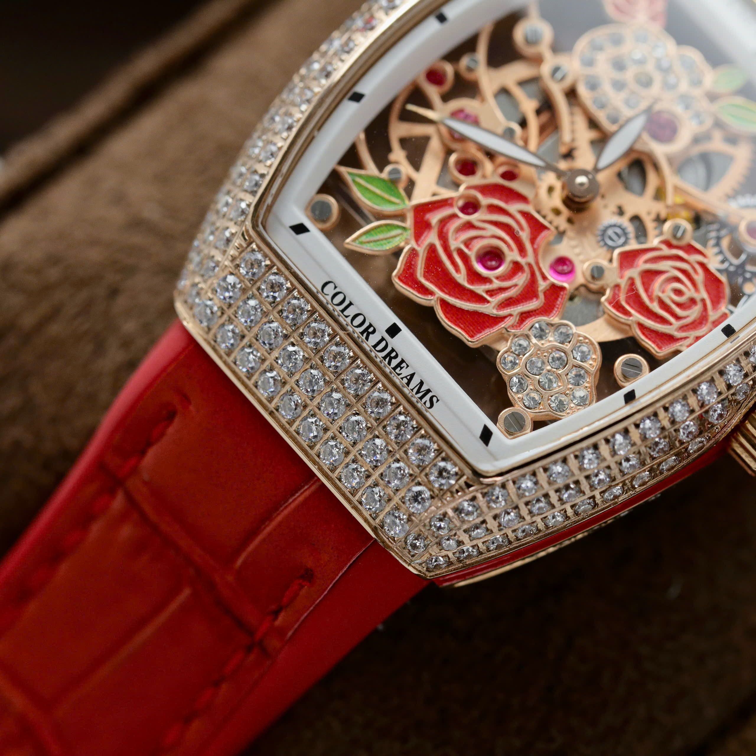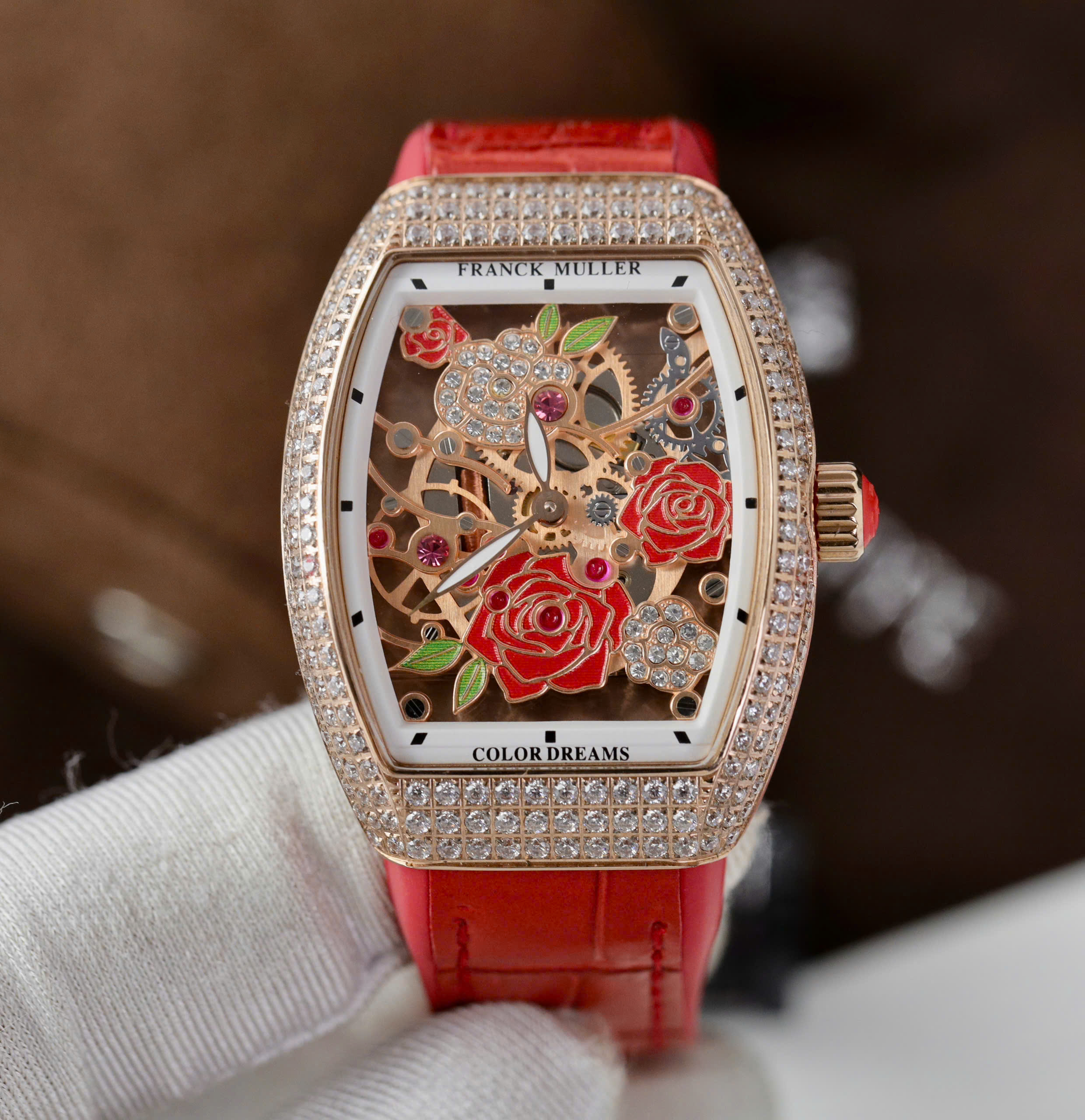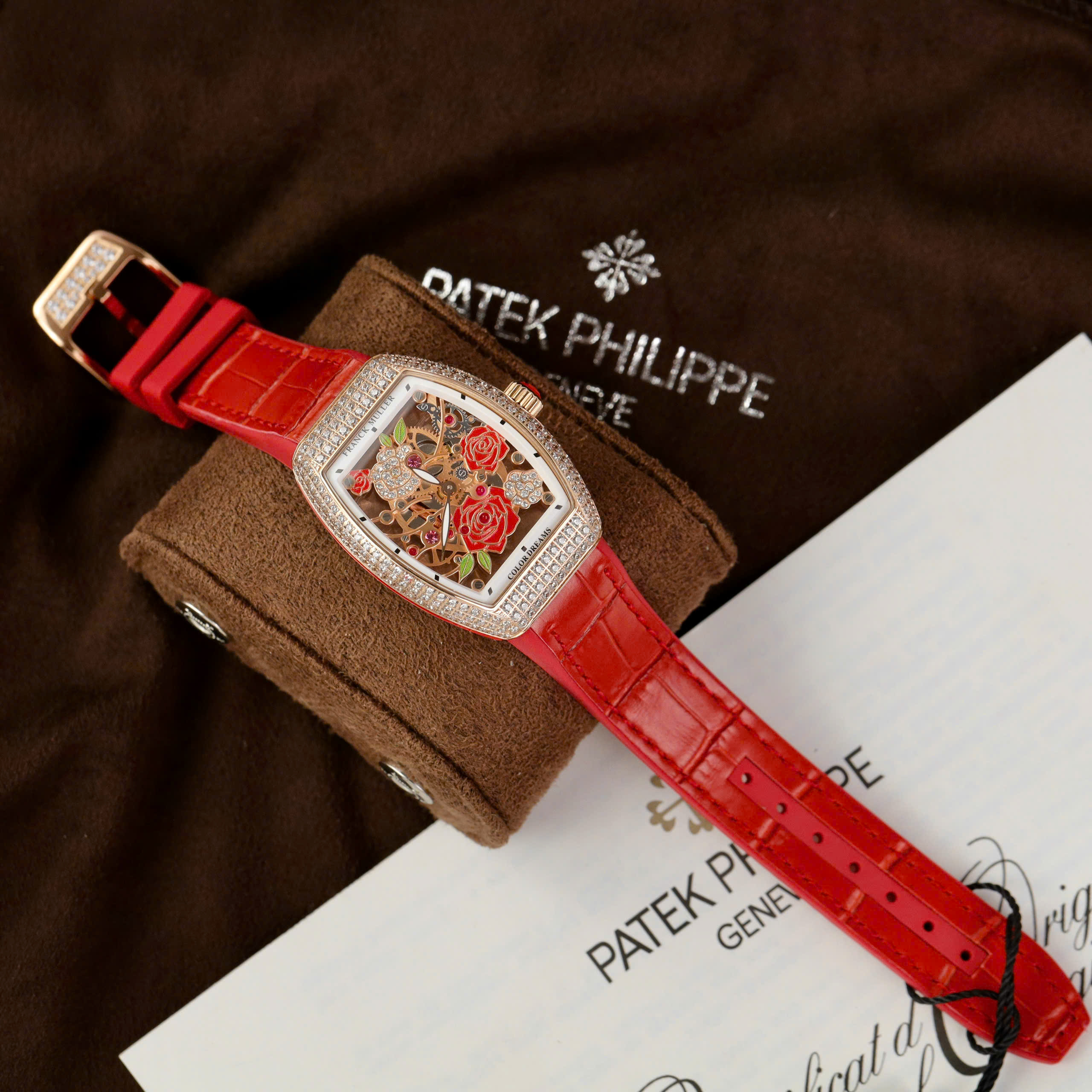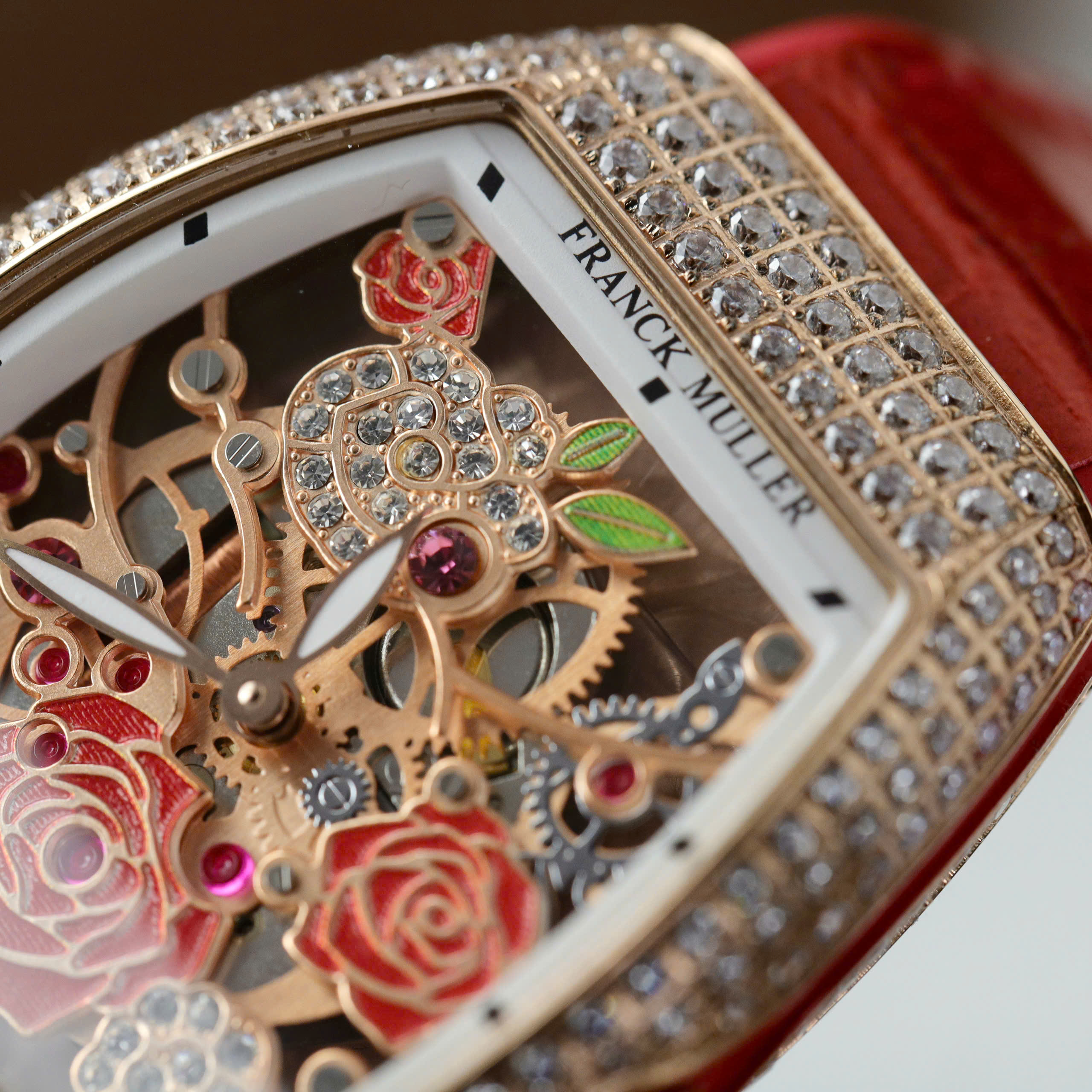 Đồng hồ Franck Muller V32 Replica 11 màu đỏ mặt hoạ tiết bông hoa 36mm