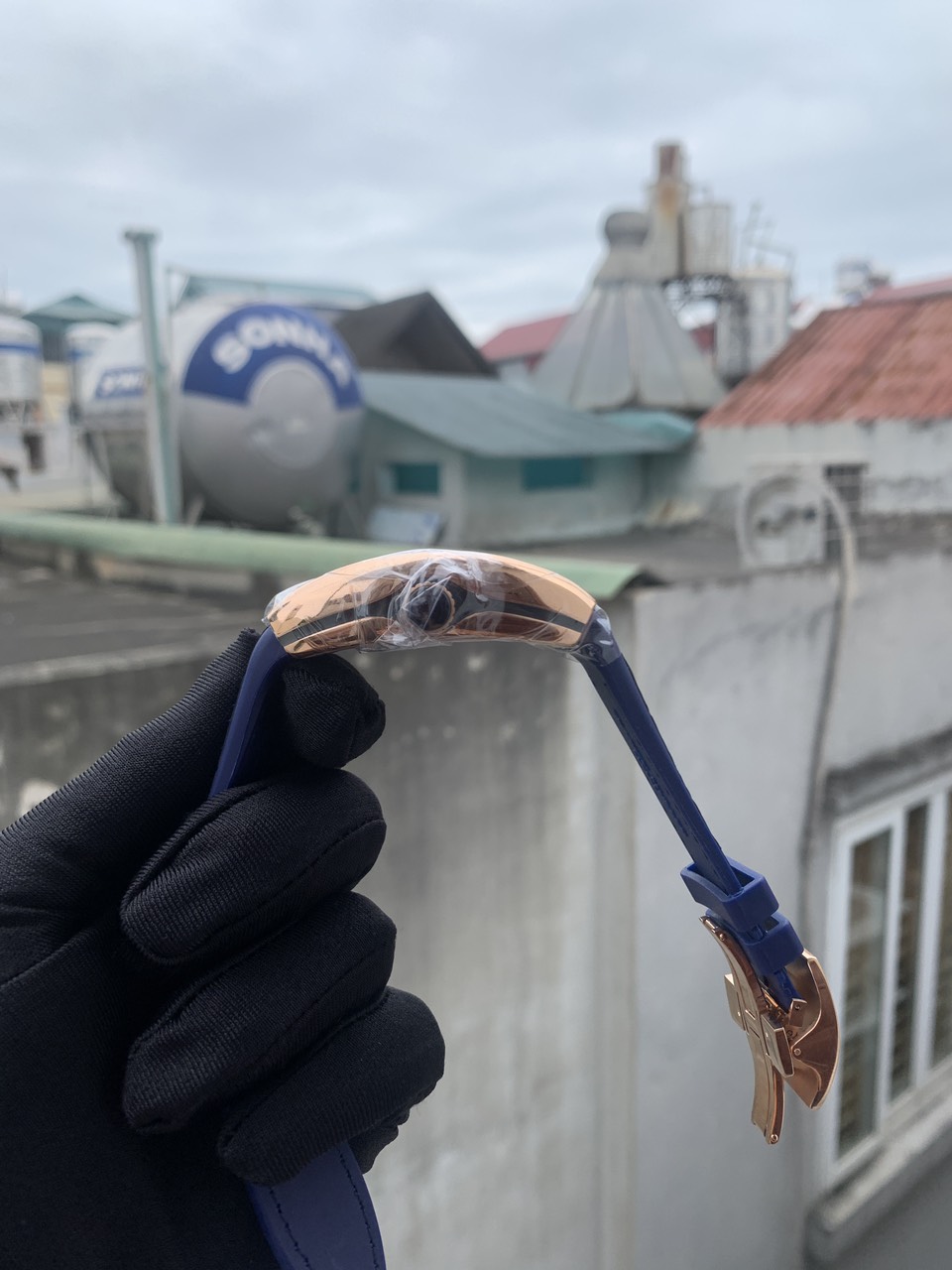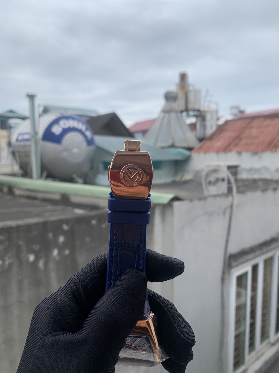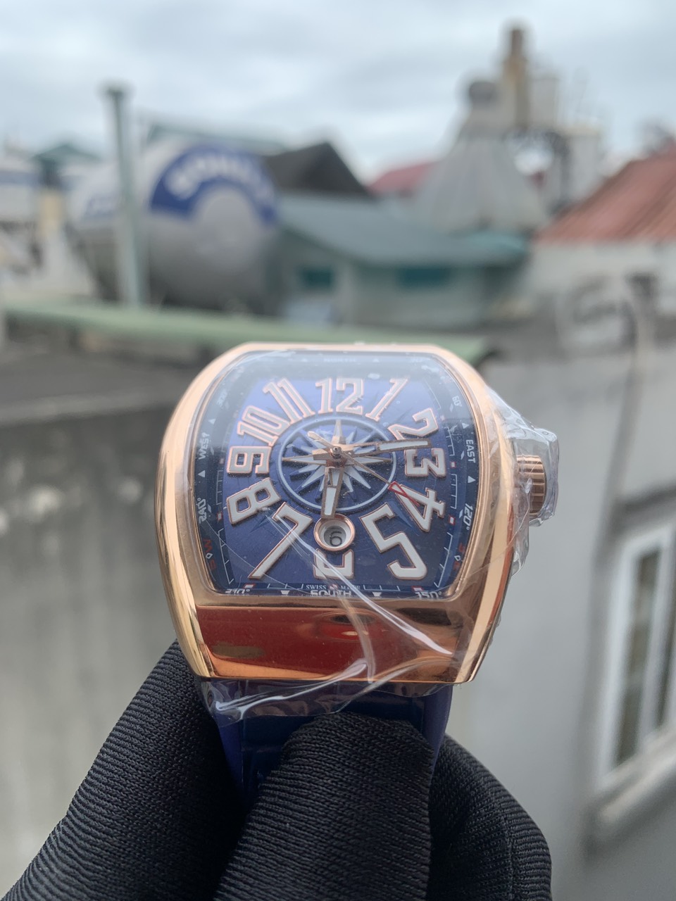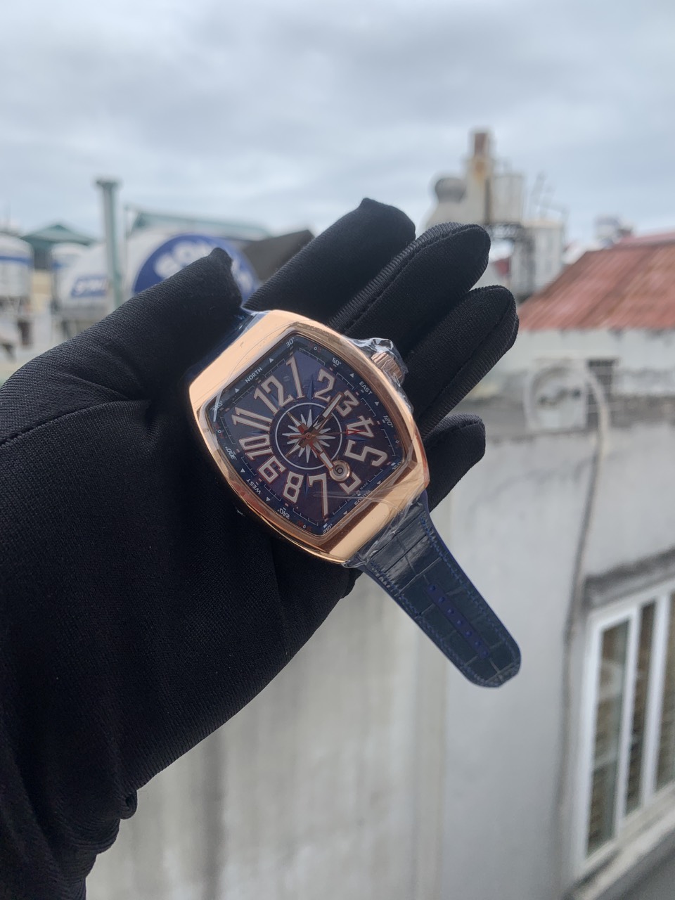 - Đồng hồ Franck Muller V45 nam máy cơ Automatic form dáng ôm cổ tay cùng mặt số nổi bật trên nền xanh vô cùng nổi bật