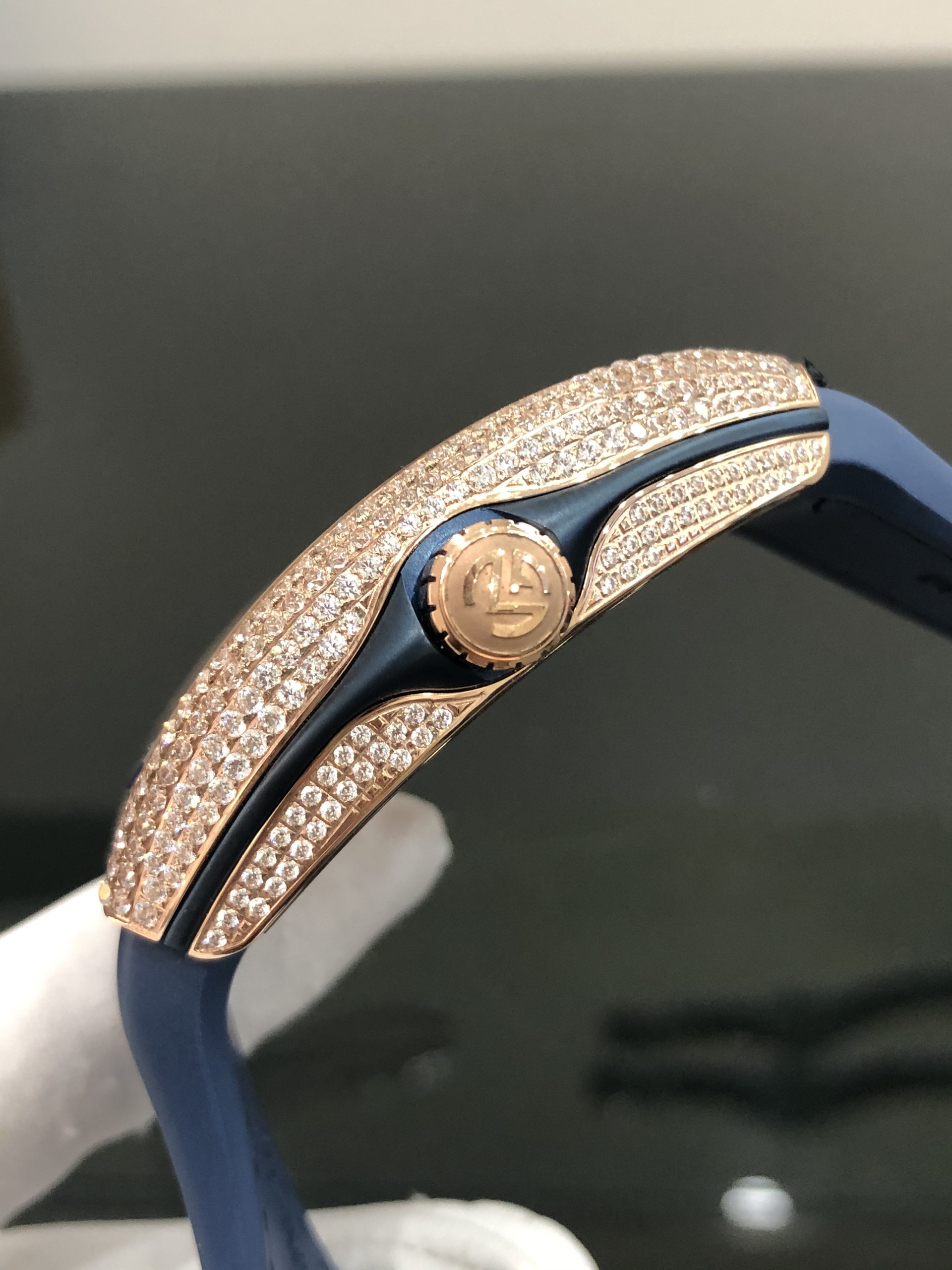 Đây là mẫu đồng hồ Franck Muller Geneve với hình thái thiết kế khá là đặc trưng với kiểu dáng Tonneau ( Chúng ta có thể hiểu nôm na là hình thùng rượu hay chum rượu ) huyền thoại nhà Franck Muller. Với vành bezel bóng bẩy cùng mặt số màu xanh dương cực kỳ ấn tượng.