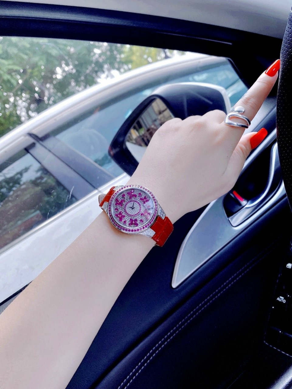 Một chiếc đồng hồ nữ sang trọng kết hợp giữa 6 con bướm bằng đá ruby đặt trên nền kim cương nhân tạo sáng lung linh. Với 6 con bướm tạo ra 1 chuyển động kỳ diệu cho chiếc đồng hồ . Khi cổ tay của người đeo đi chuyển . Một kính vạn hoa gồm những con bướm xoay tròn đầy thôi miên tôn lên nét đẹp tinh tế dành cho phái đẹp.