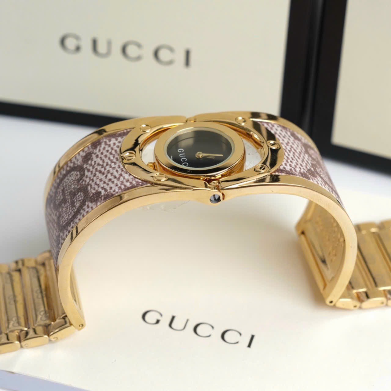Đồng hồ Gucci nữ dạng lắc tay màu vàng sang trọng mặt đen phiên bản cao cấp có sẵn tại DWatch.