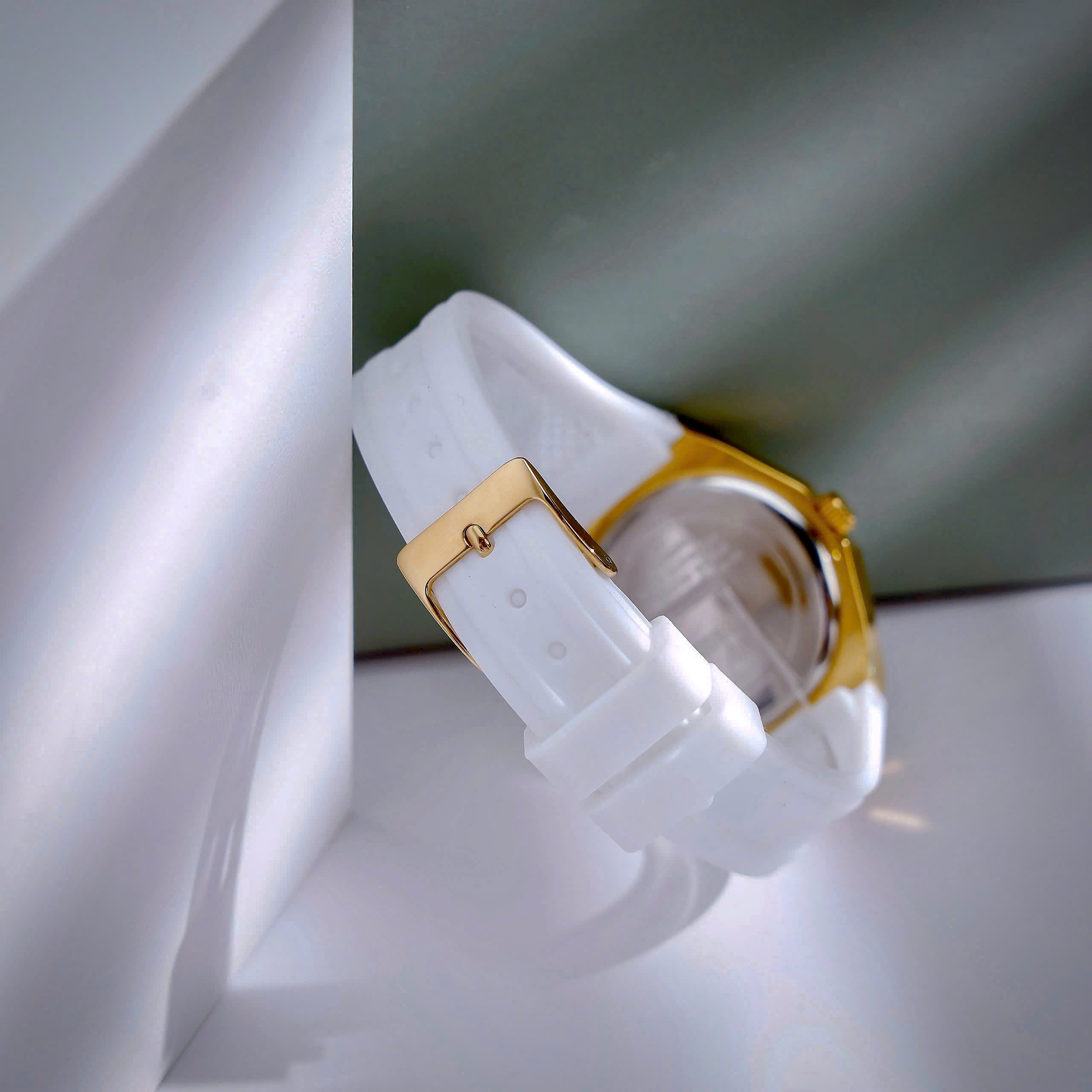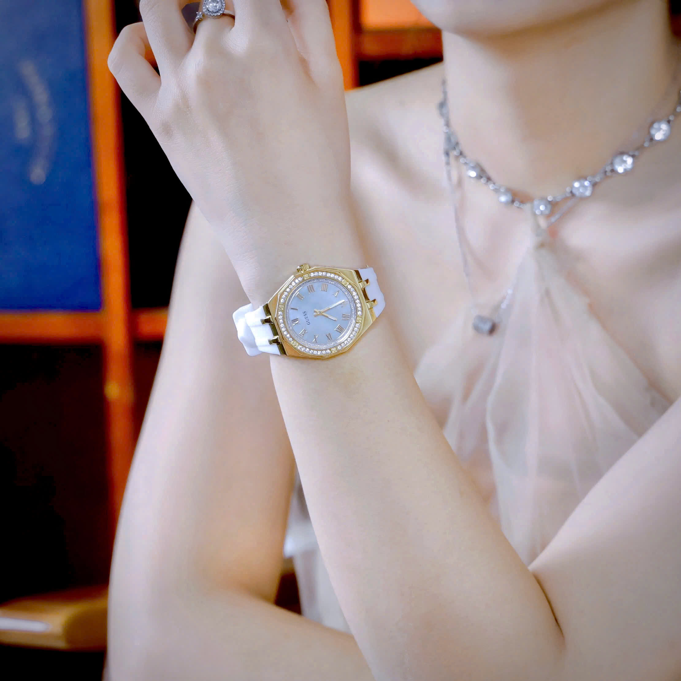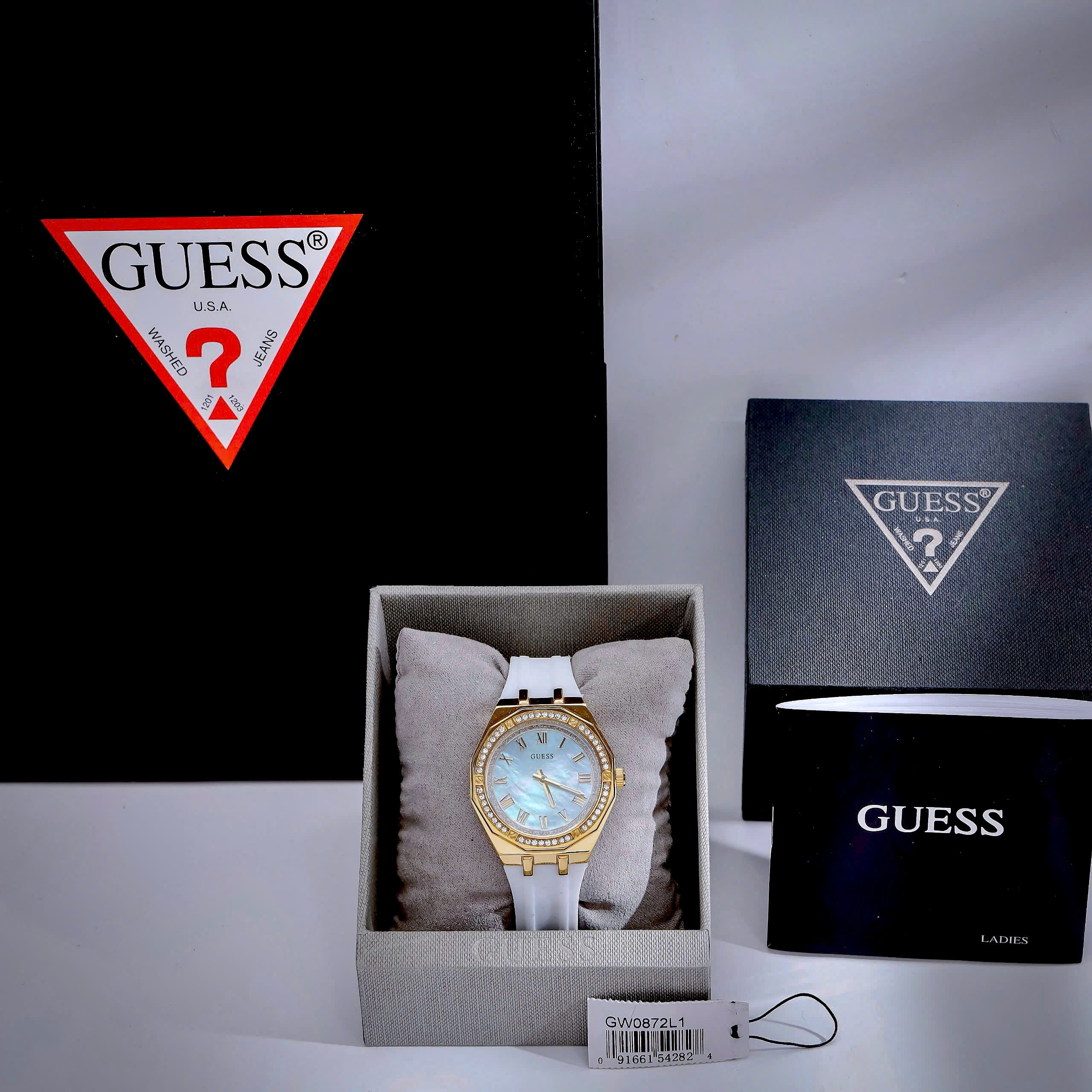 Đồng hồ Guess Octagonal Ladies dây cao su trắng đính đá fake cao cấp 36mm