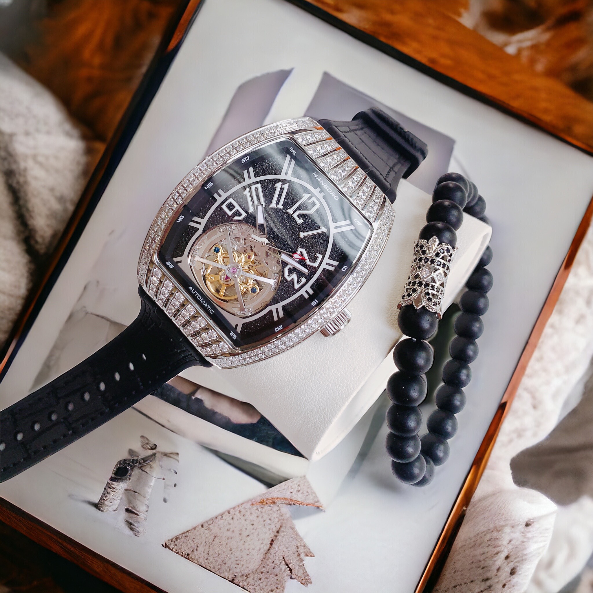 Đồng hồ Hanboro nam mặt đen viền đính đá