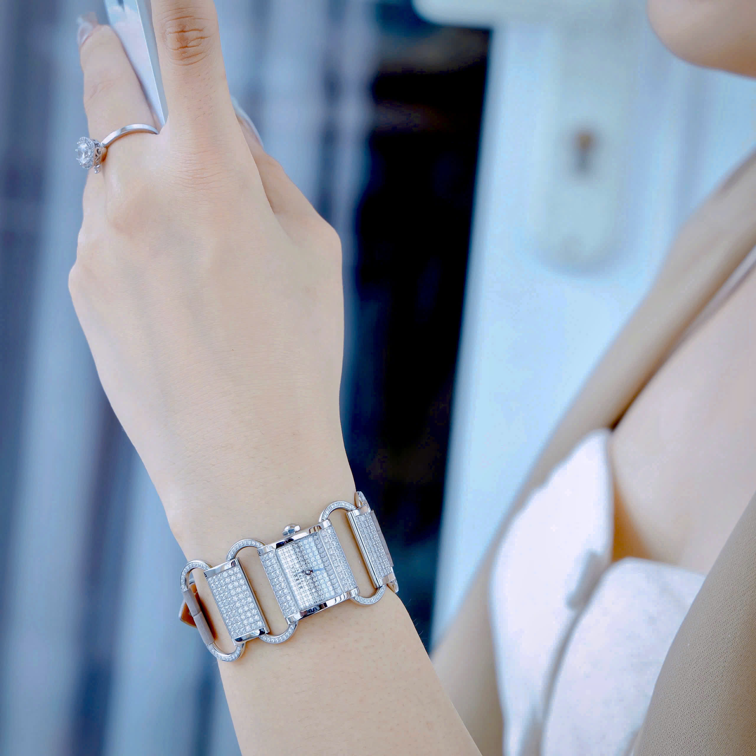 Đặt mua Đồng hồ HERMÈS Klikti nữ thép trắng dây da xám đính full đá 22x21mm
