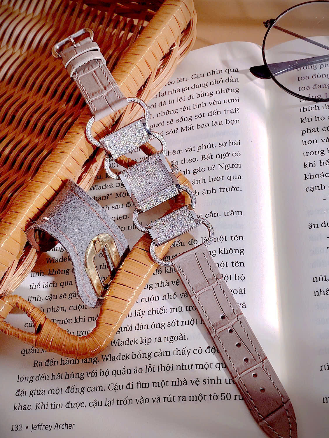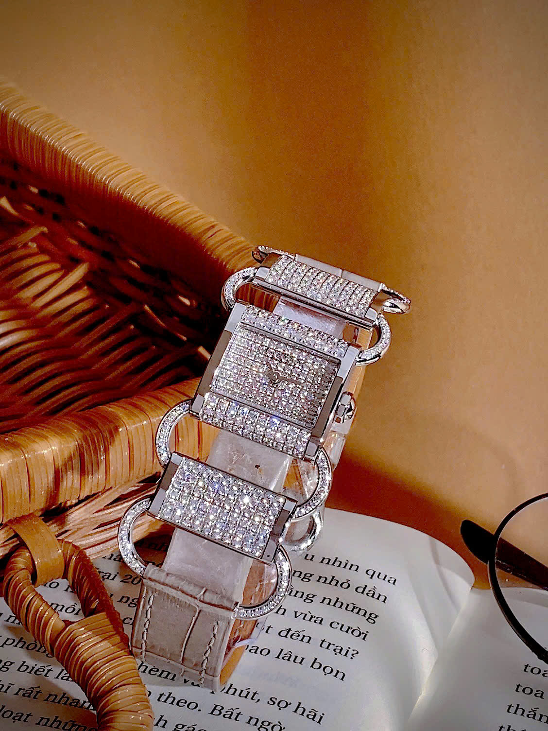 Đồng hồ HERMÈS Klikti nữ thép trắng dây da xám đính full đá 22x21mm