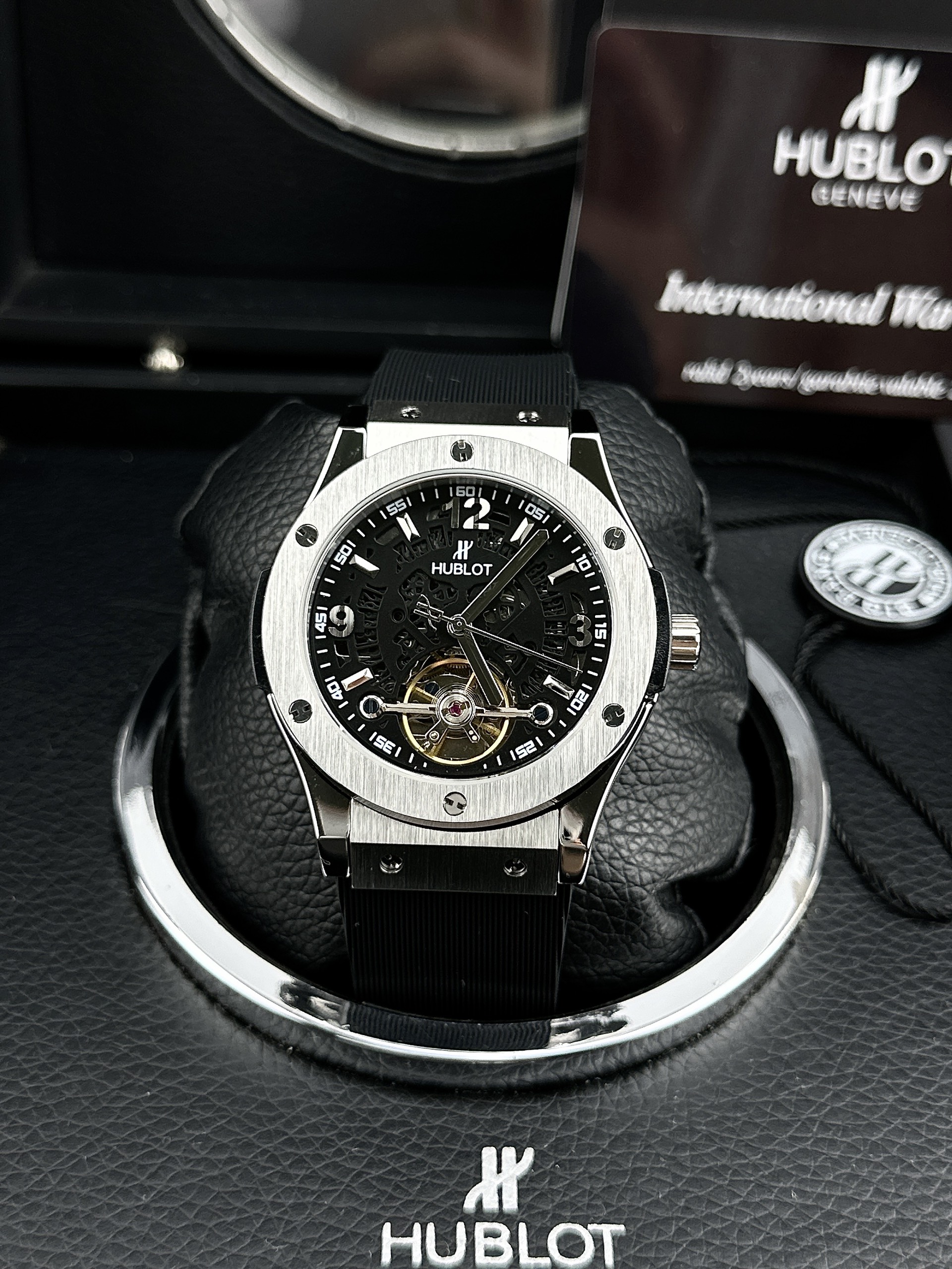 - Đồng hồ Hublot Automatic cơ lộ máy Nhật Fake cao cấp màu đen thiết kế mặt cầu kì tinh xảo và nổi bật