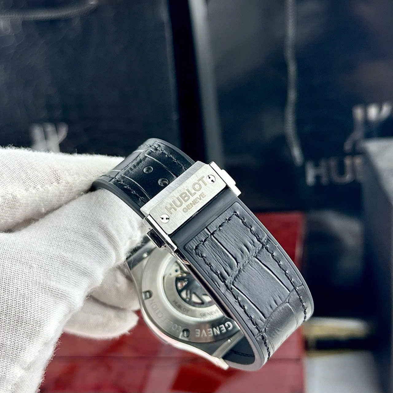 Đáy đồng hồ Hublot nam dây da bọc cao su lộ máy cơ cực chất