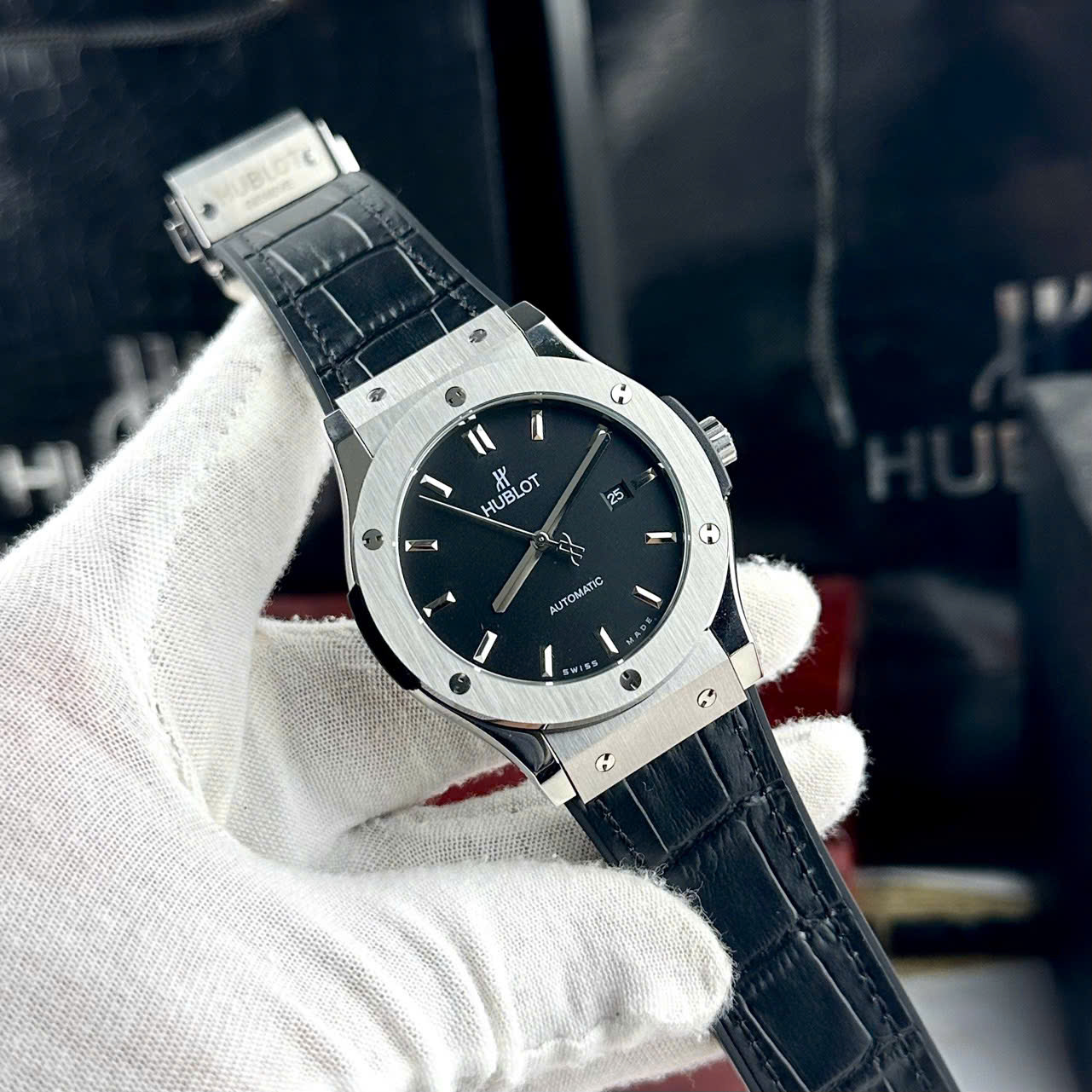 Đồng hồ Hublot nam dây da bọc cao su Hublot Classic Fusion màu đen