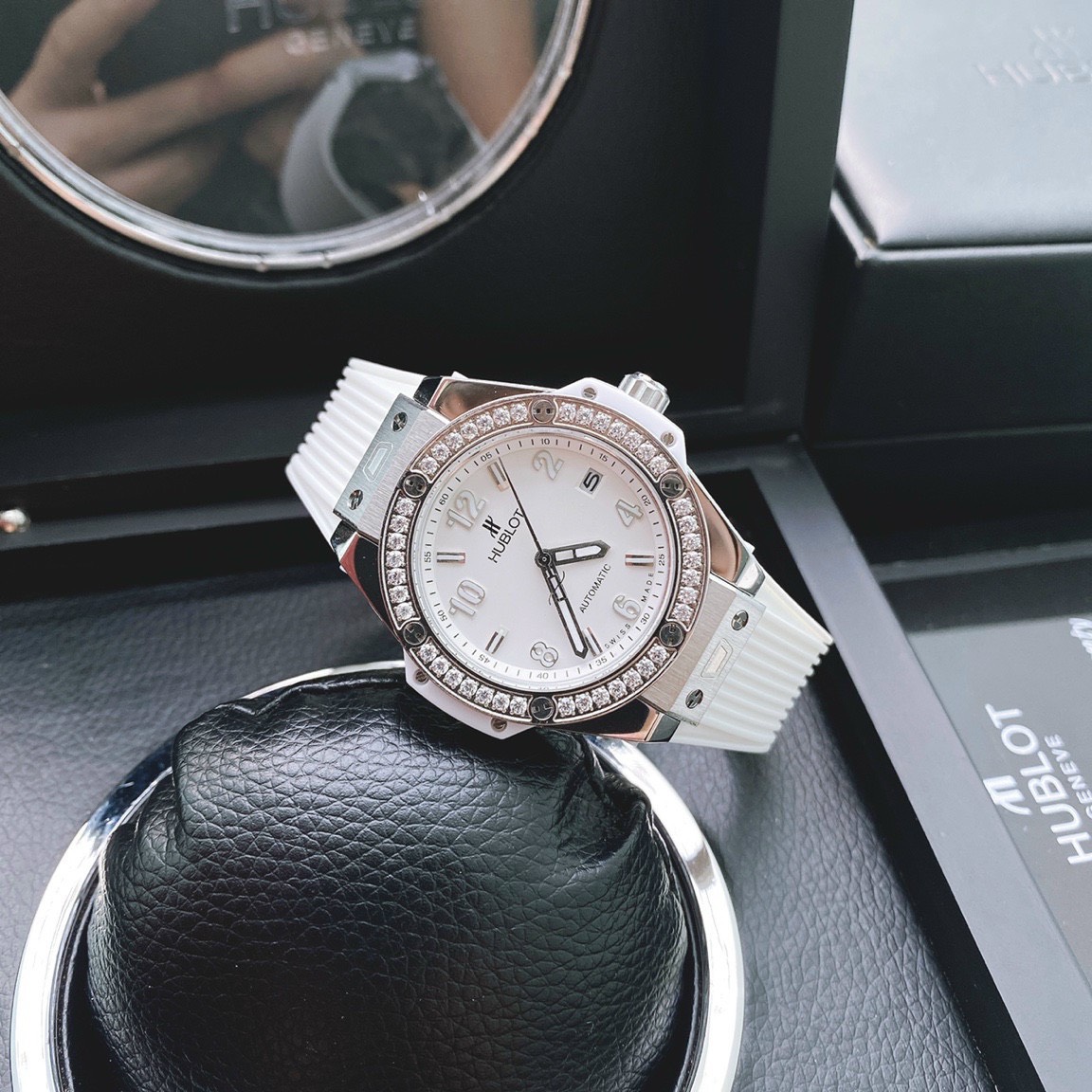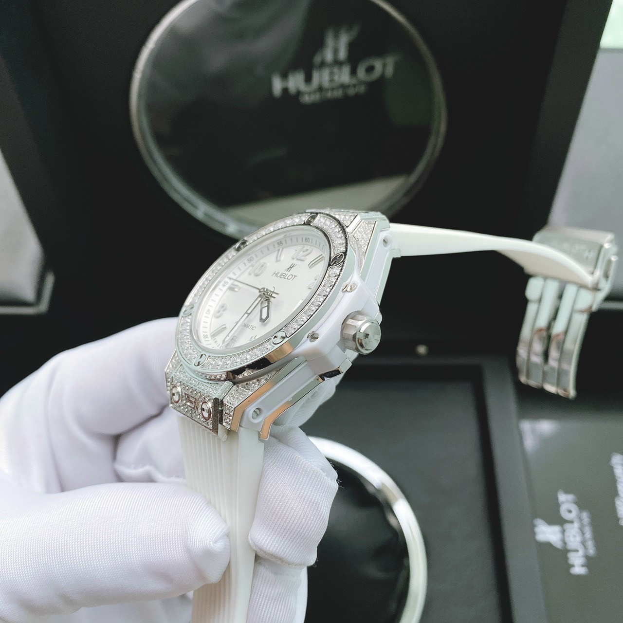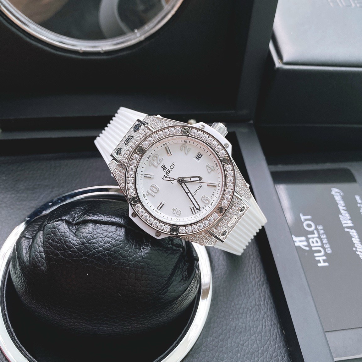 - Viền bezel đồng hồ Hublot đính đá Swarovski sáng lấp lánh