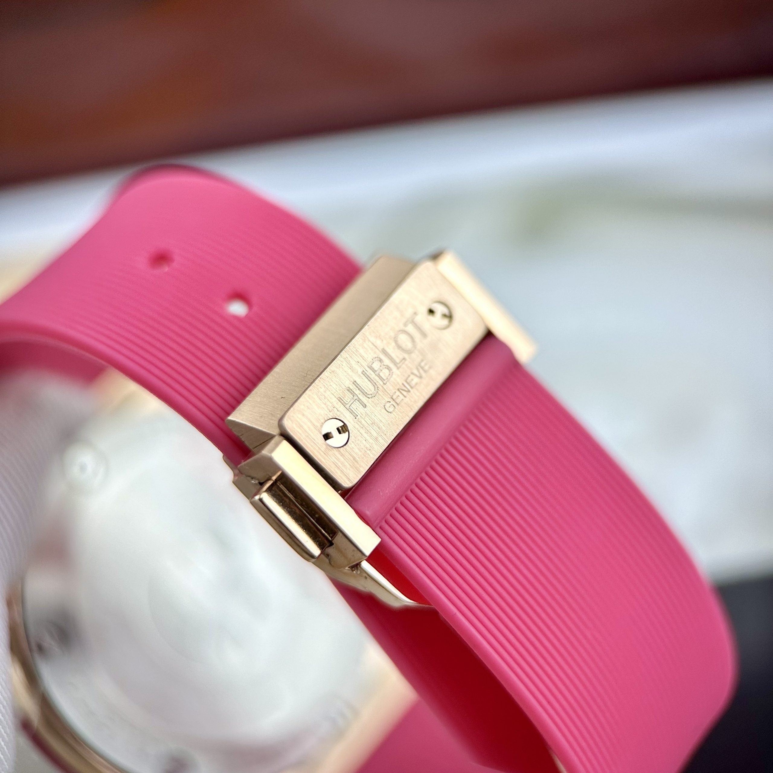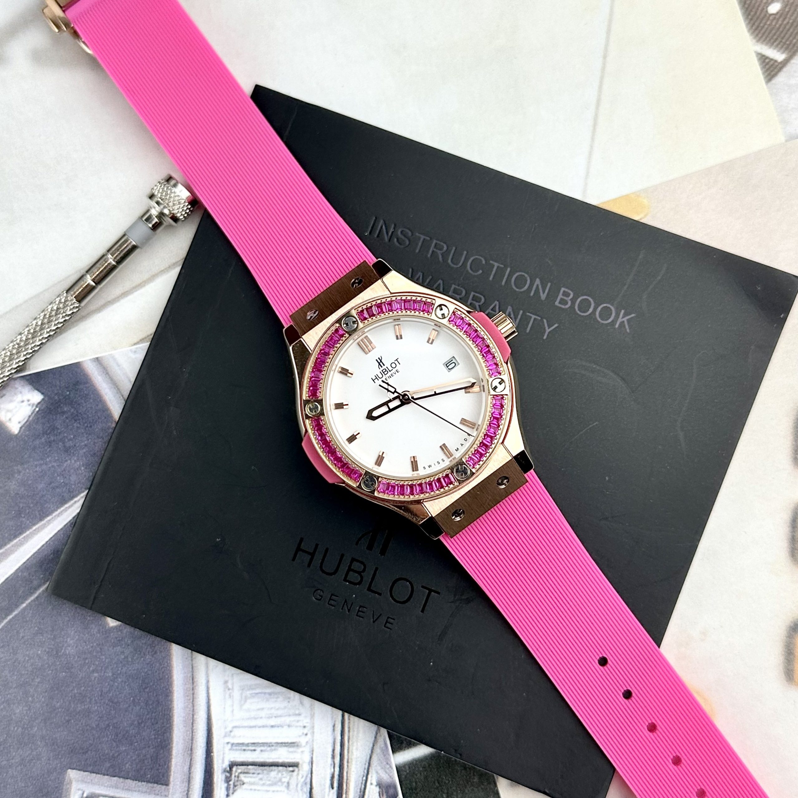 - Đồng hồ Hublot nữ dây cao su màu hồng trẻ trung mang phong cách mới của một quý cô hiện đại