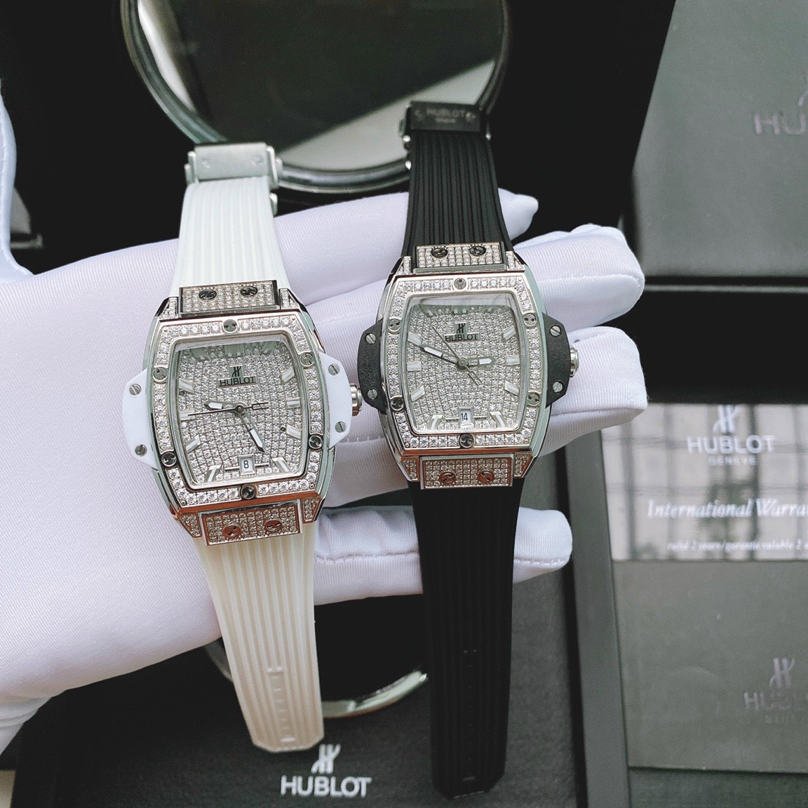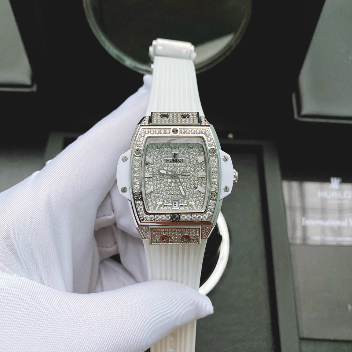- Bộ số và kim đồng hồ Hublot nữ dây cao su thanh mảnh, kim phủ dạ quang tinh tế chạy kèm lịch ngày