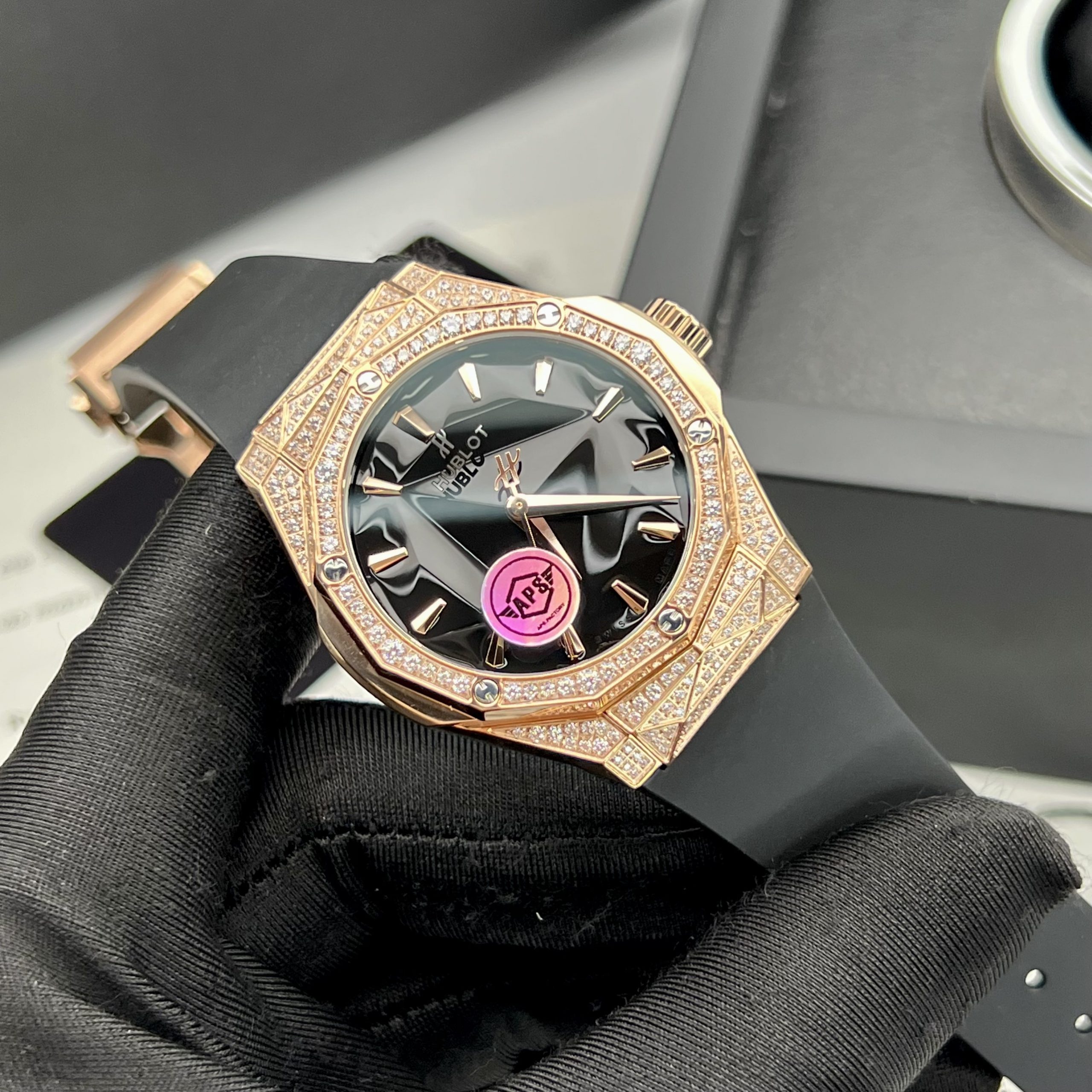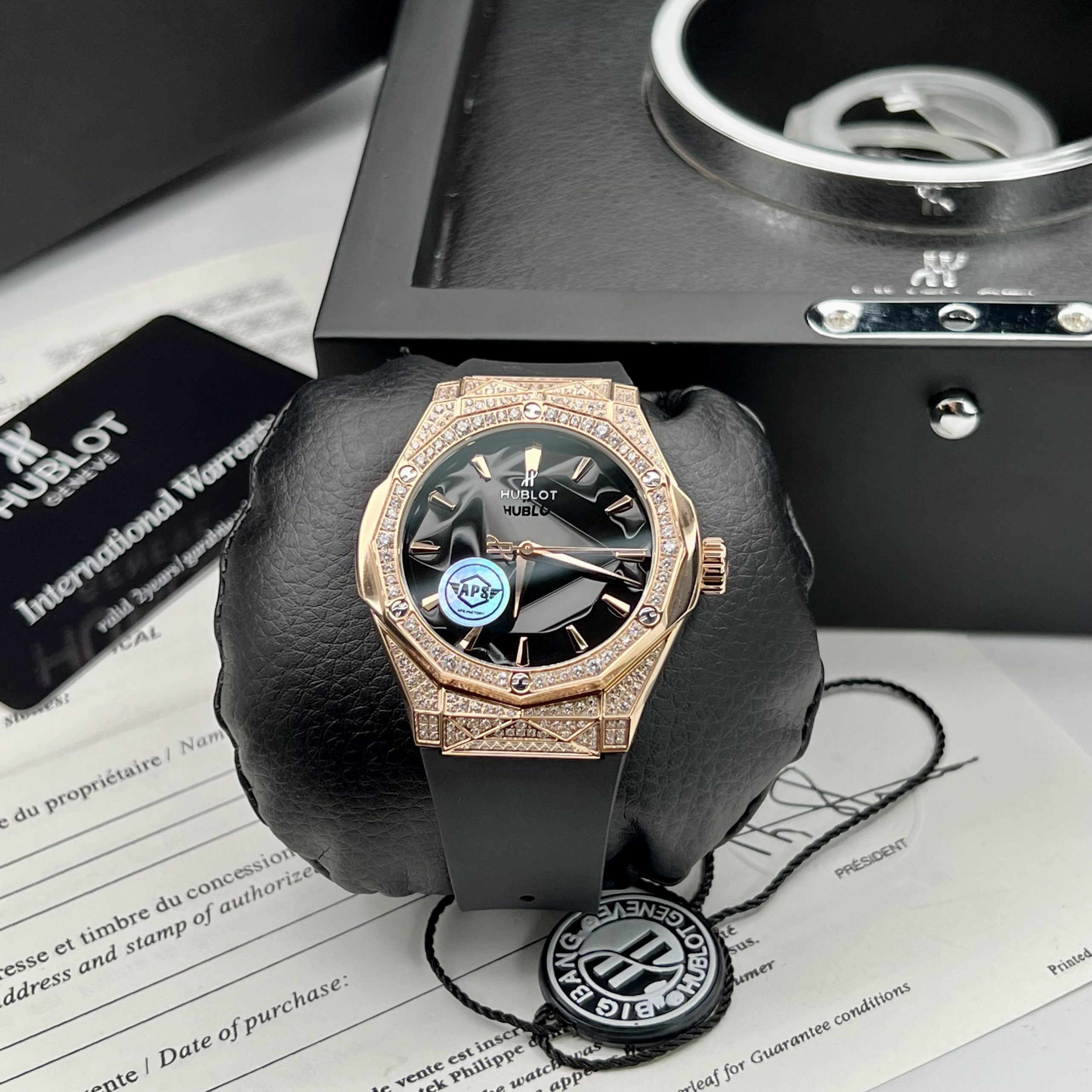 Không chỉ thế tất cả các chi tiết trên bề mặt bộ vỏ đều được đánh bóng tỉ mỉ khiến chiếc đồng hồ Hublot Rep 1:1 vô cùng bóng bẩy. Đi kèm với chiếc đồng hồ, ta có bộ dây cao su màu đen trơn láng, được cố định bằng khóa gập. Tuy nhiên, chất liệu này được hoàn thiện thêm bằng một lớp mạ đen, đem đến vẻ hiện đại cho thiết kế.