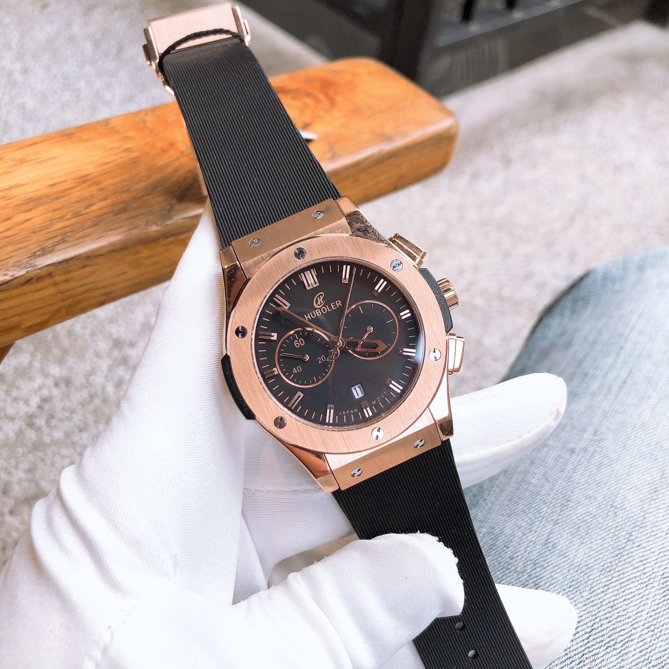 Đồng hồ Huboler nam chính hãng dây cao su màu đen Chronograph 42mm