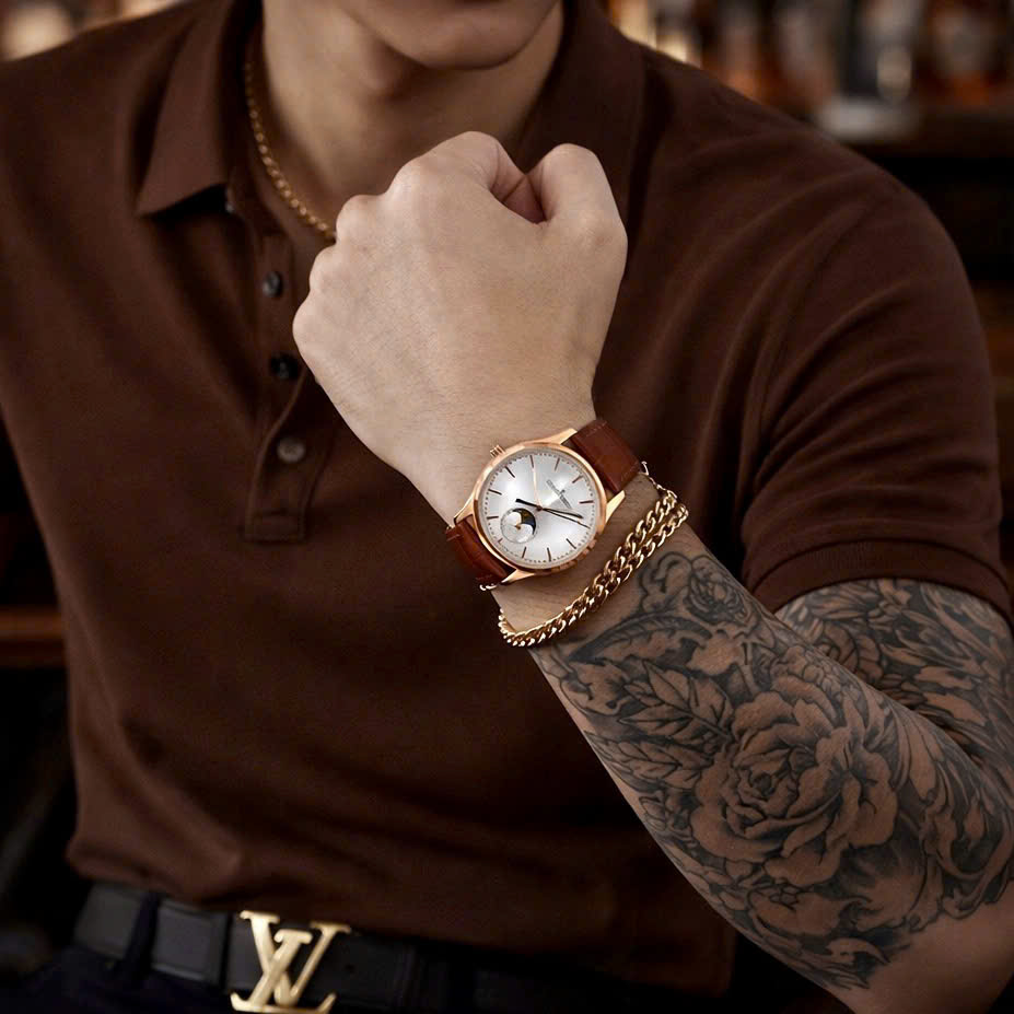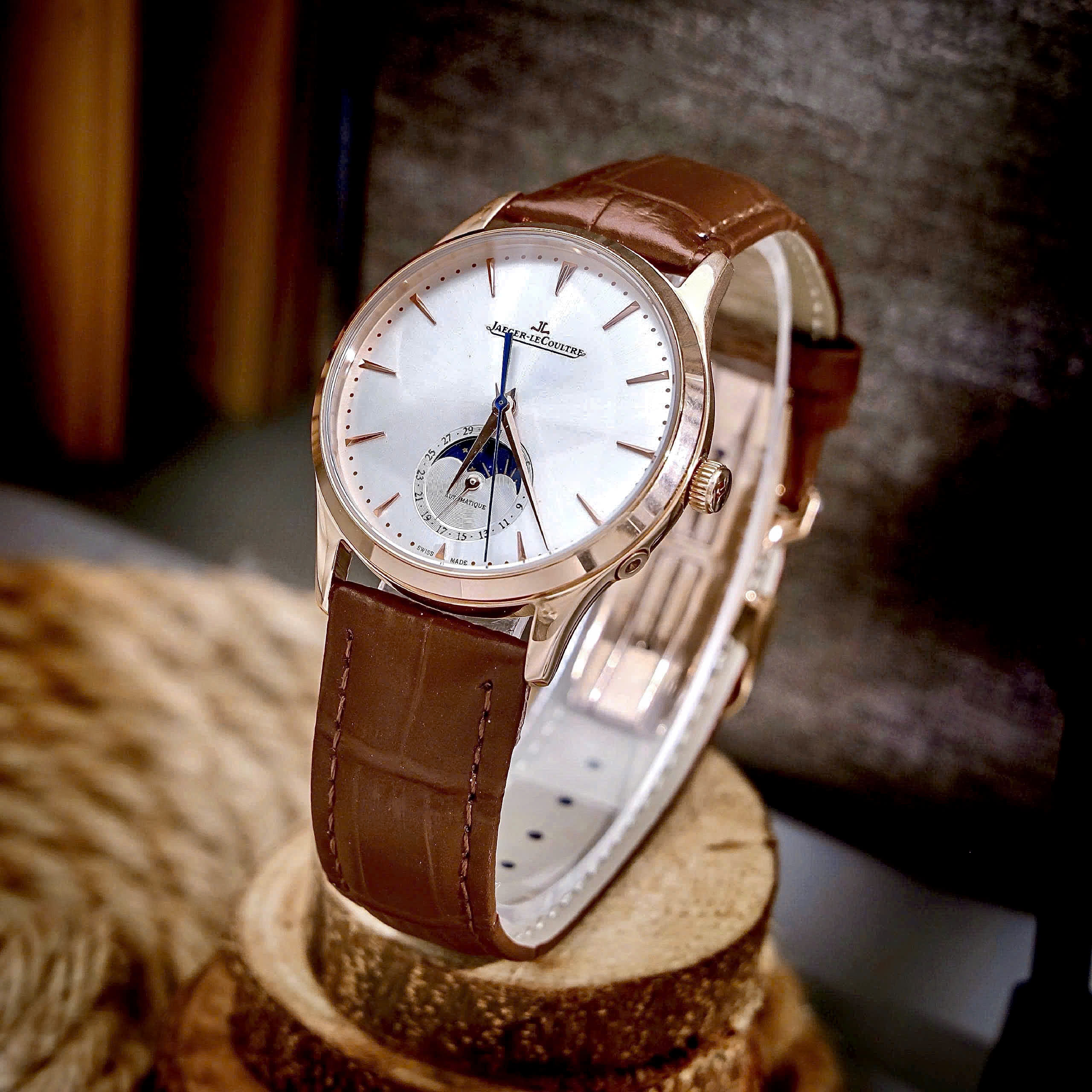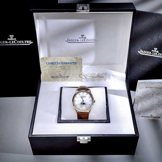 Đồng hồ Jaeger – LeCoultre Master Ultra Thin Moon nam vàng gold dây da nâu fake cao cấp 39mm