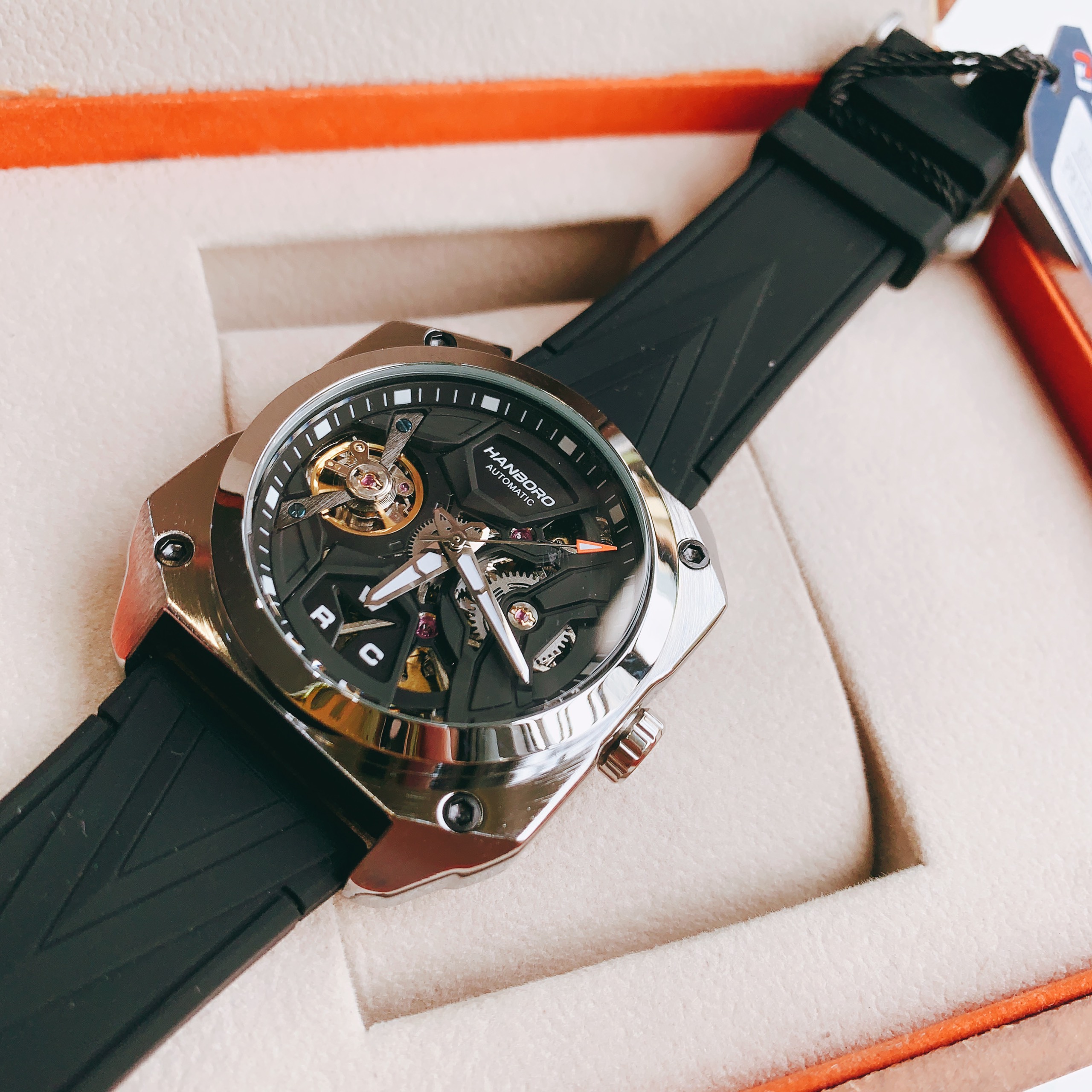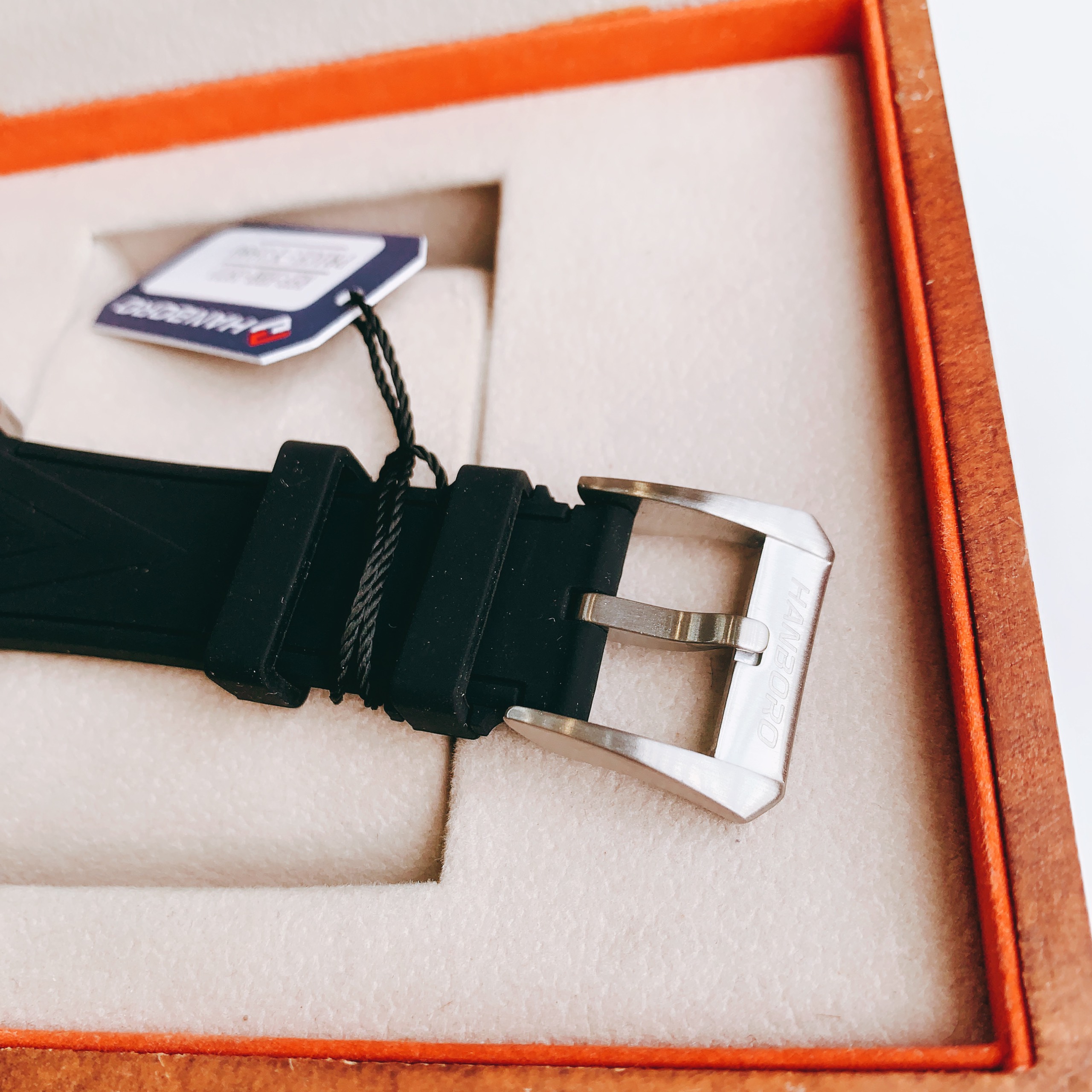Đồng hồ mặt vuông Hanboro nam dây cao su màu đen chính hãng
