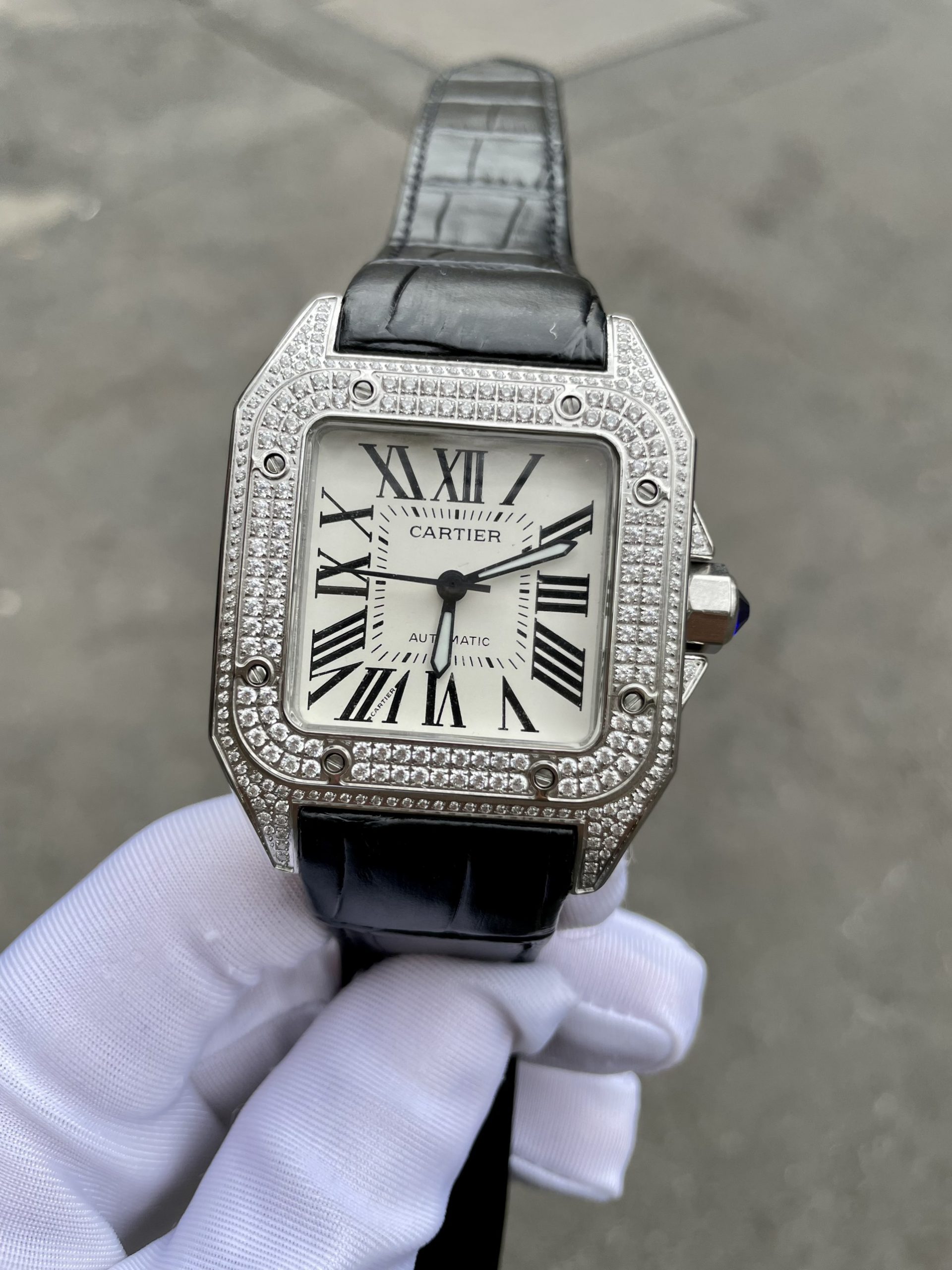 Nhắc đến đồng hồ đeo tay, chúng ta thường nghĩ ngay đến thời gian cũng như hàm chứa nhiều điều xảy ra trong cuộc đời mỗi người. Đồng hồ đeo tay đang dần trở thành một món phụ kiện thời trang không thể thiếu trong tủ đồ của mỗi người! Nếu bạn đang băn khoăn và muốn tìm mua một mẫu đồng hồ nam đẹp với chất lượng tốt, giá cả hợp lý cùng chính sách bảo hành dài và uy tín thì hãy cùng tham khảo đồng hồ nam đính đá Cartier Automatic Sliver dây da màu đen tại Dwatch Thế Giới Đồng Hồ Đẹp nhé !