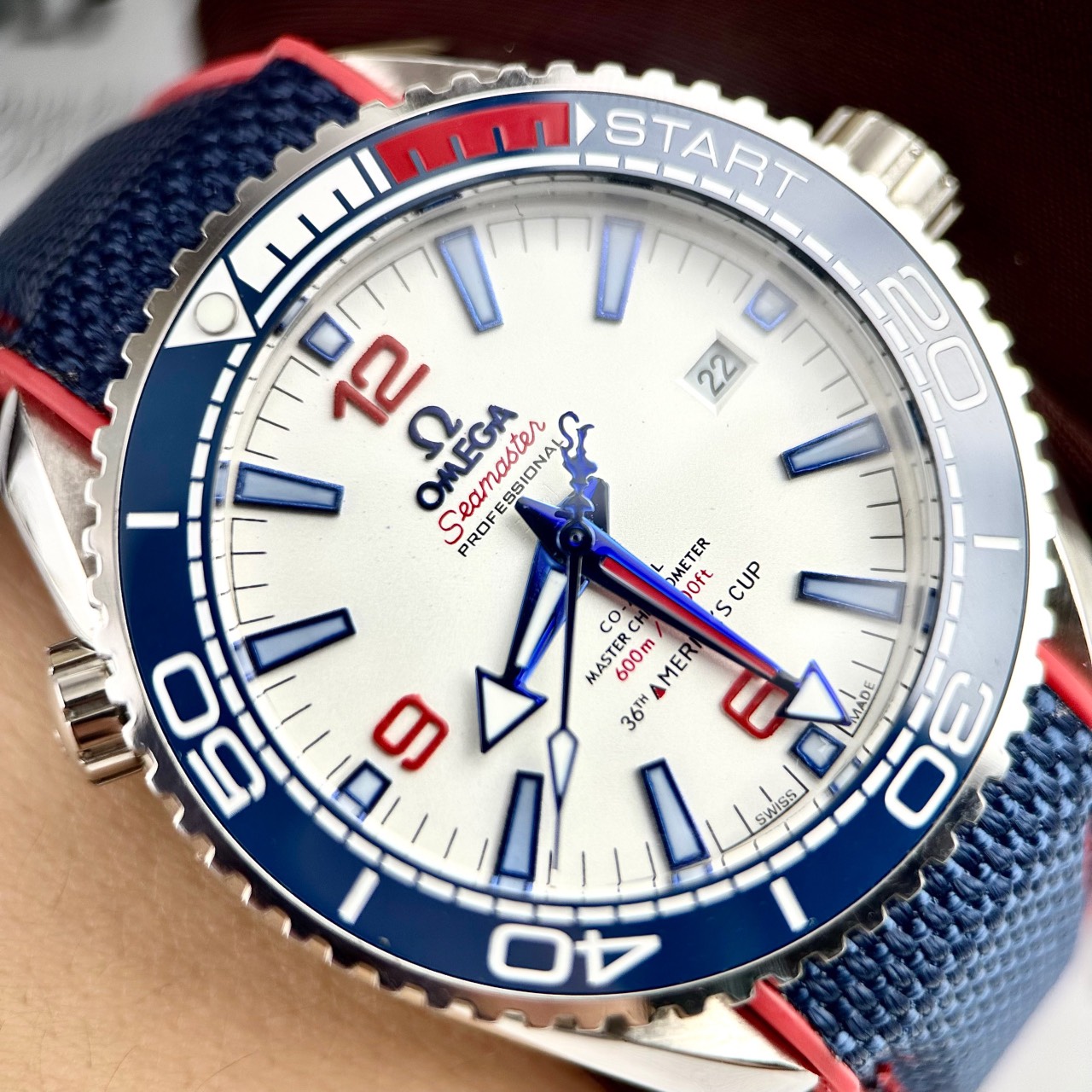 - Viền bezel đồng hồ nam máy cơ Omega có thể xoay như hãng, mặt số và kim phụ dạ quang phát sáng
