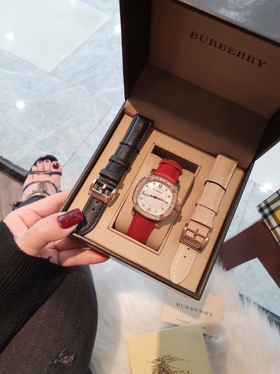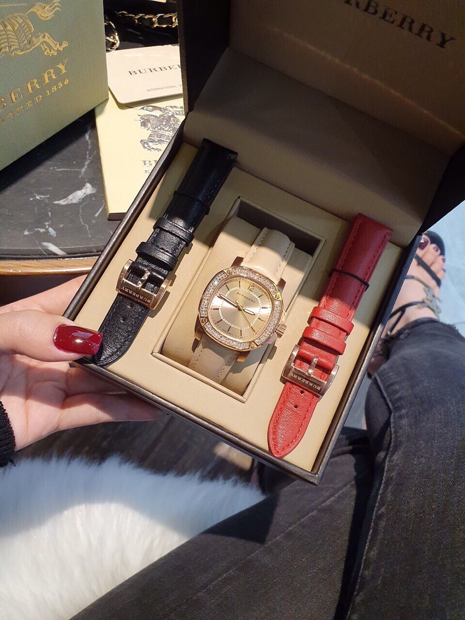 Một set đồng hồ nữ Burberry sang chảnh và thời trang được tặng kèm hai dây da màu thay đổi phong cách.