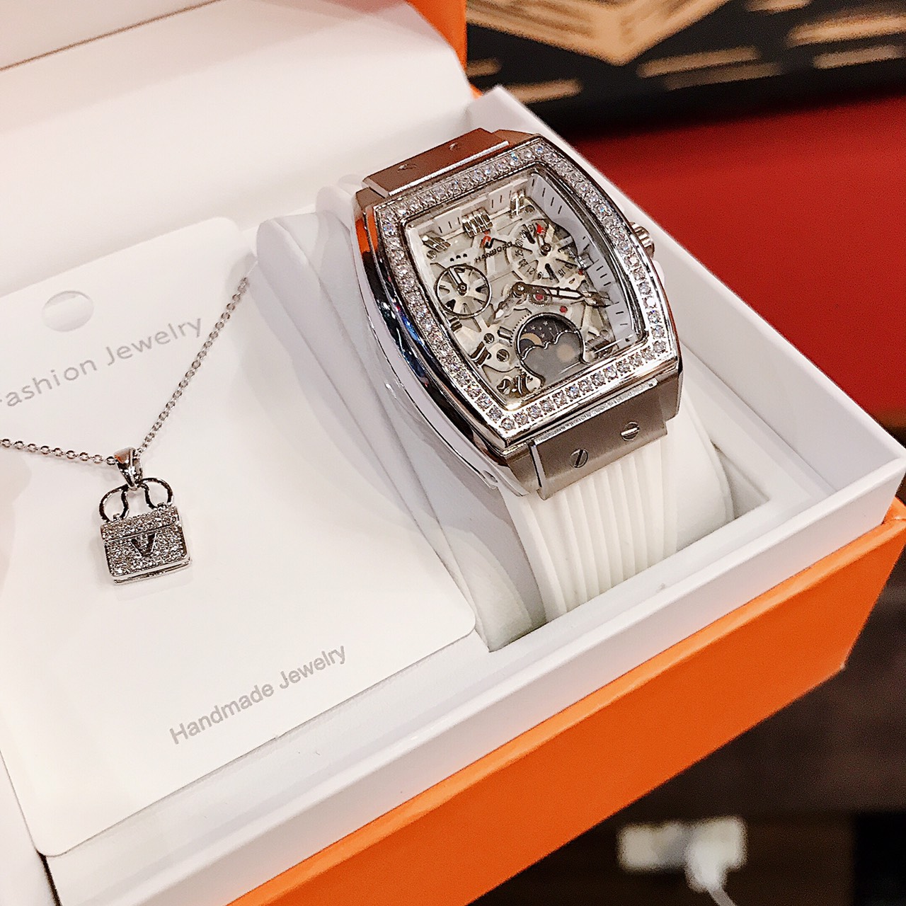 - Thiết kế mặt đồng hồ nữ chính hãng Hanboro độc đáo và cuốn hút lộ máy cực chất, chạy vòng kim phụ và lịch ngày đêm