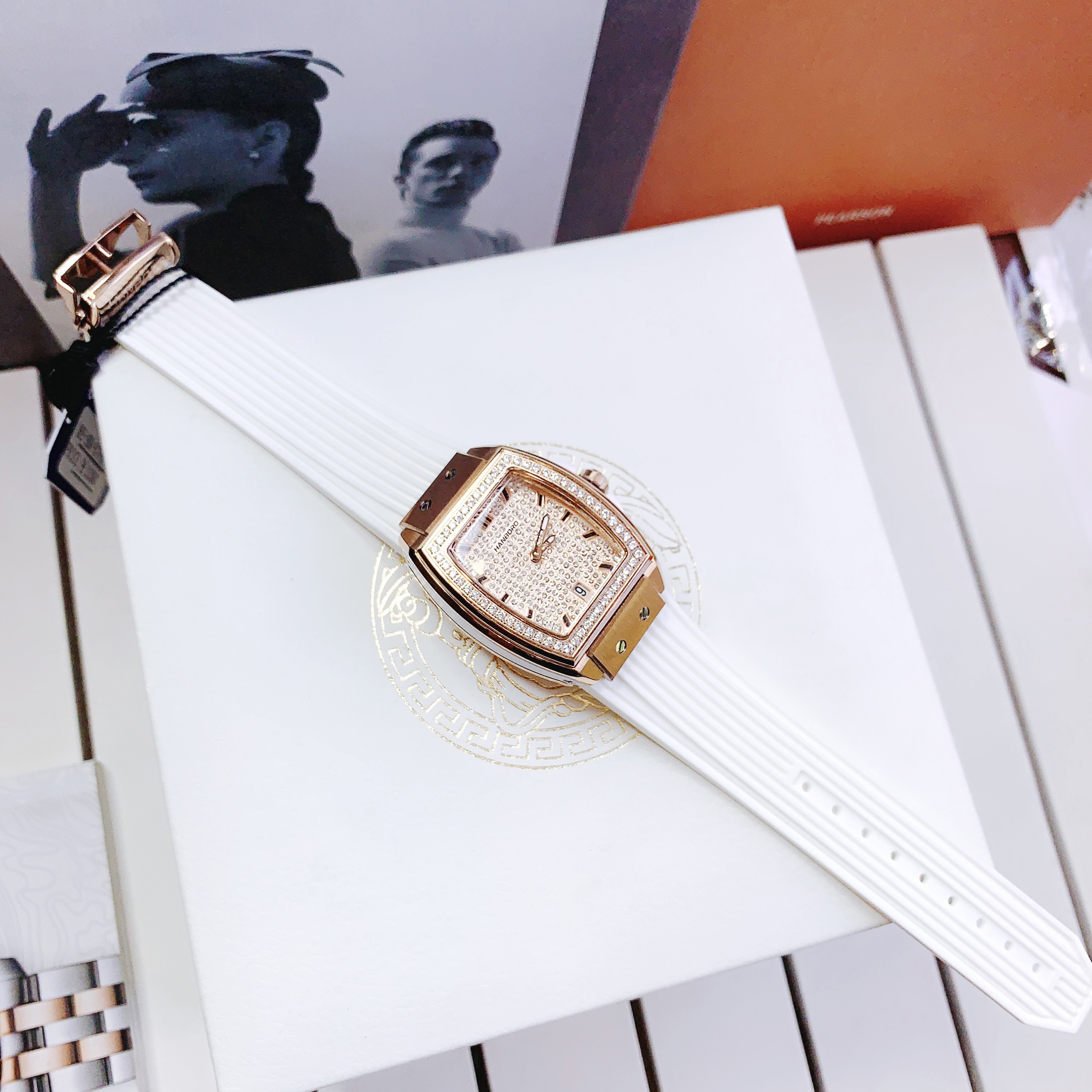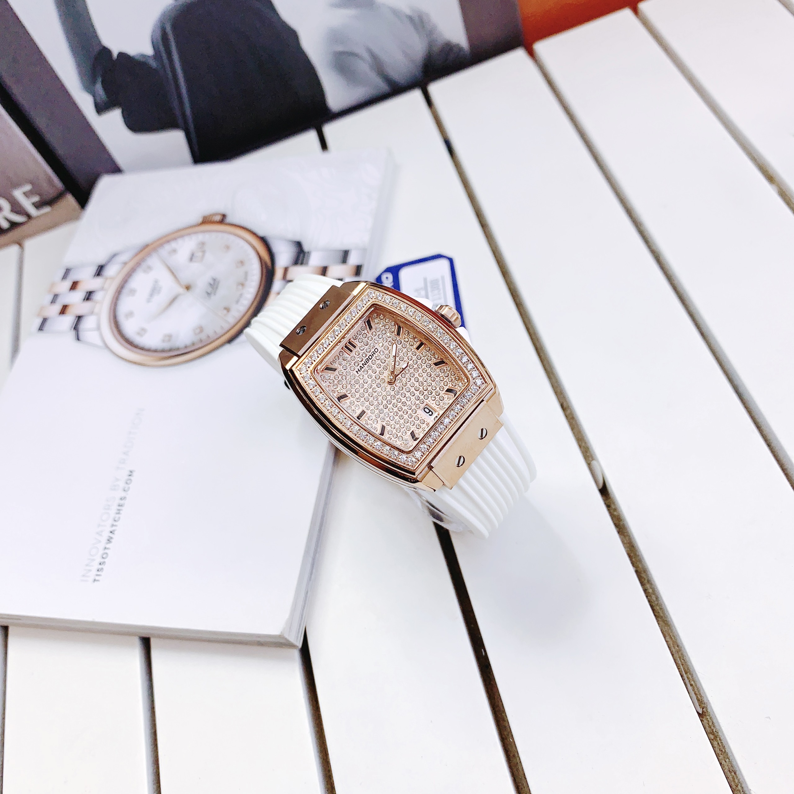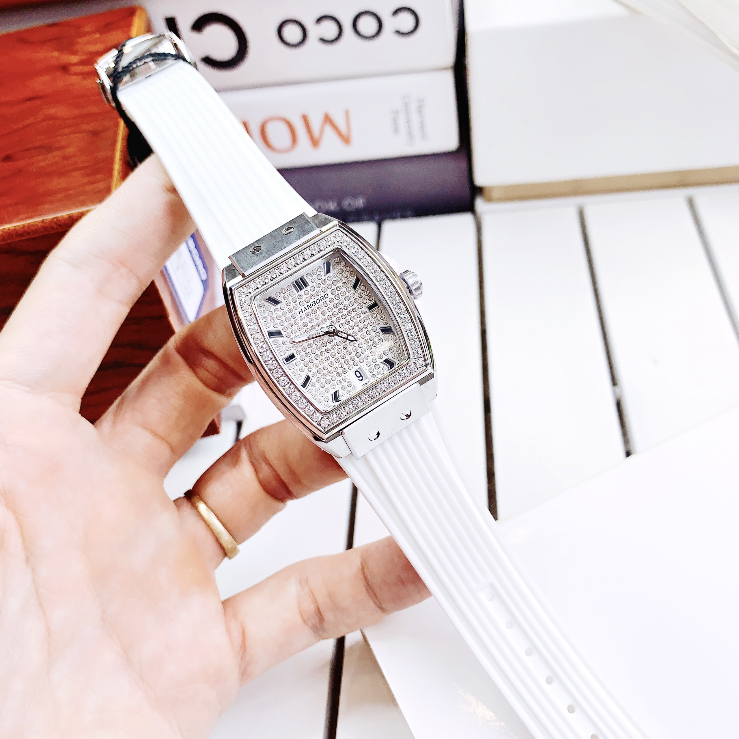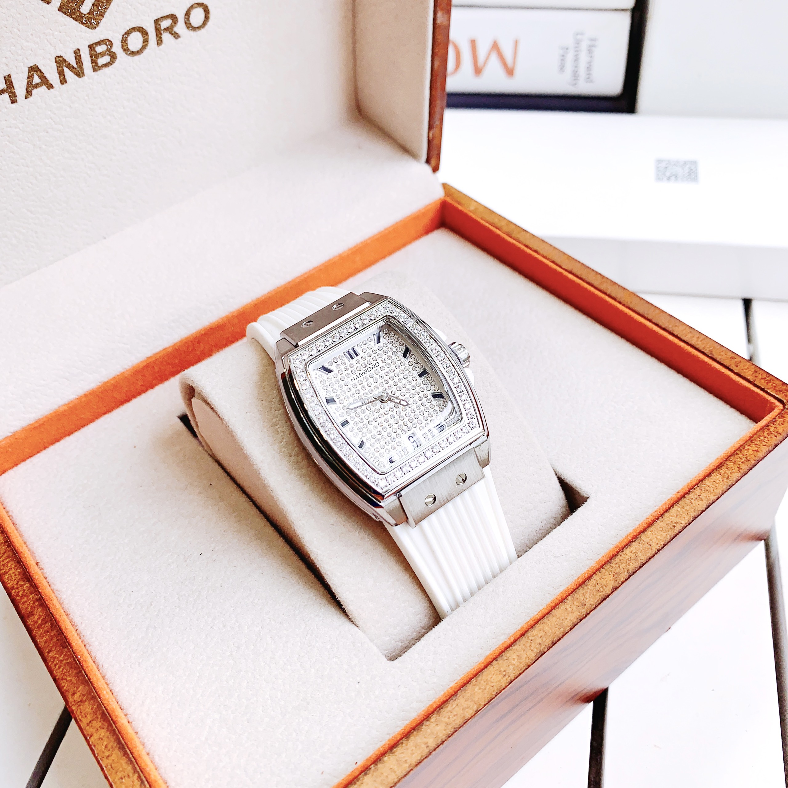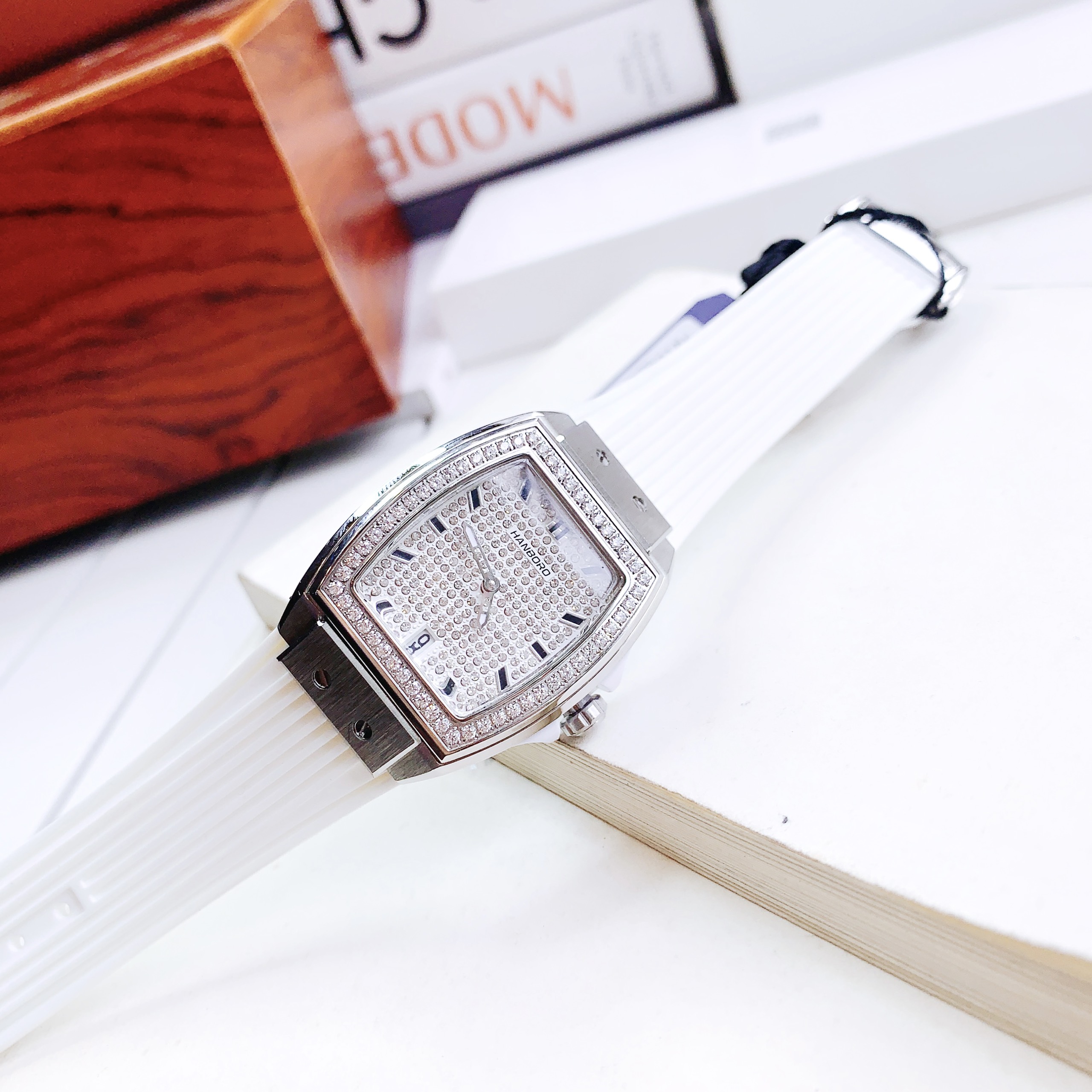 - Đồng hồ Hanboro nữ dây cao su màu trắng là biểu tượng cho sự giản dị, sạch sẽ và tinh khiết tuyệt đối