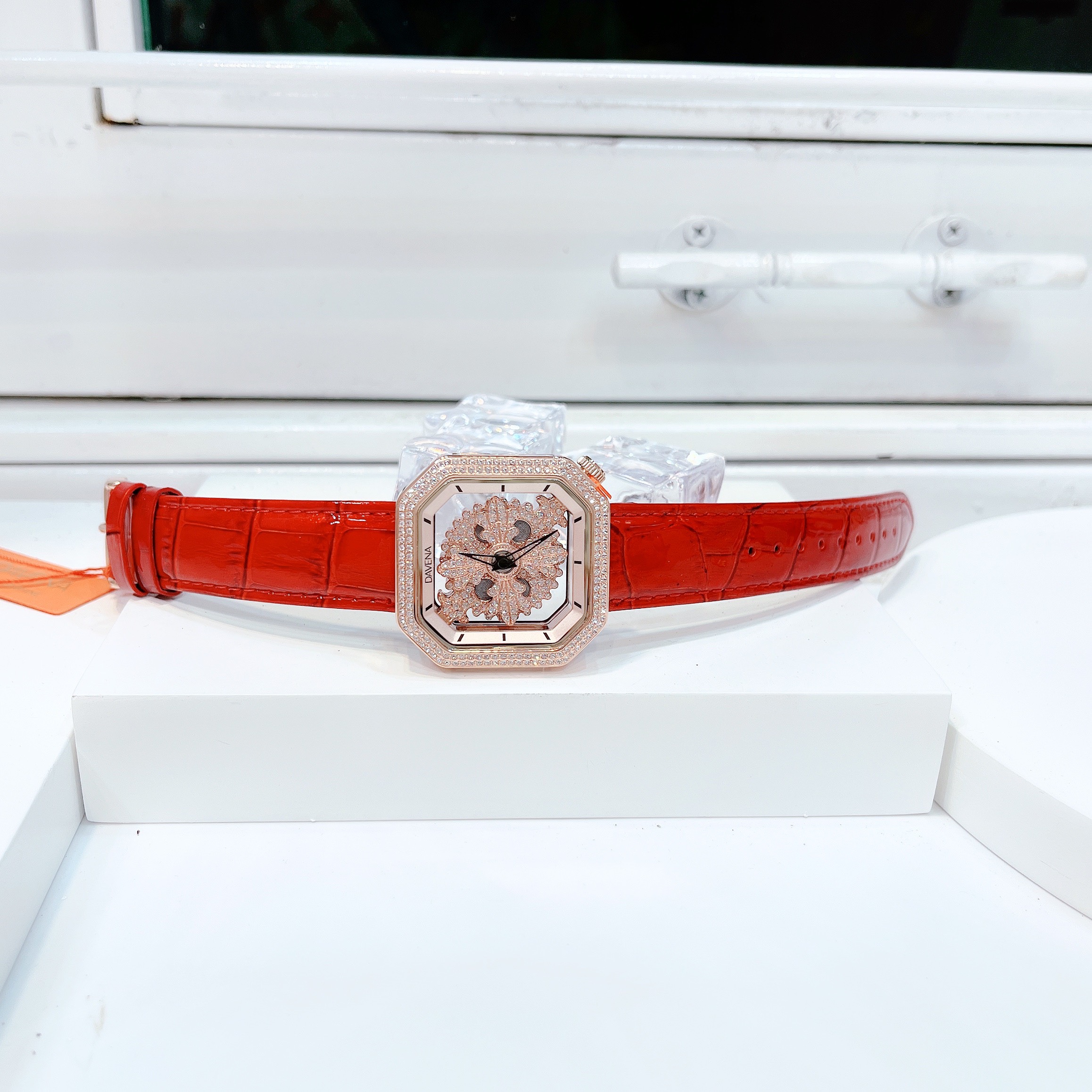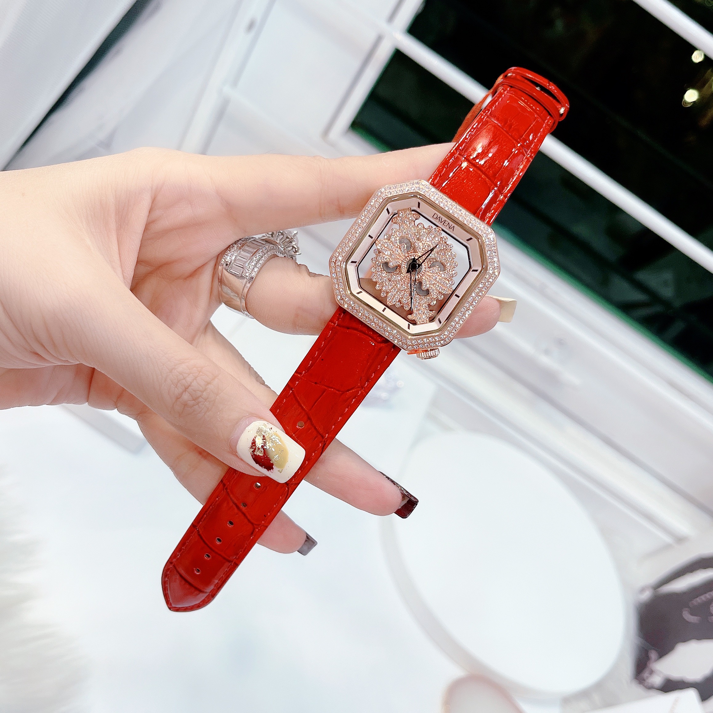 - Đồng hồ nữ mặt vuông Davena đá xoay tự động dây da màu đỏ nằm trong bộ sưu tập mới nhất của hãng ra mắt năm 2022