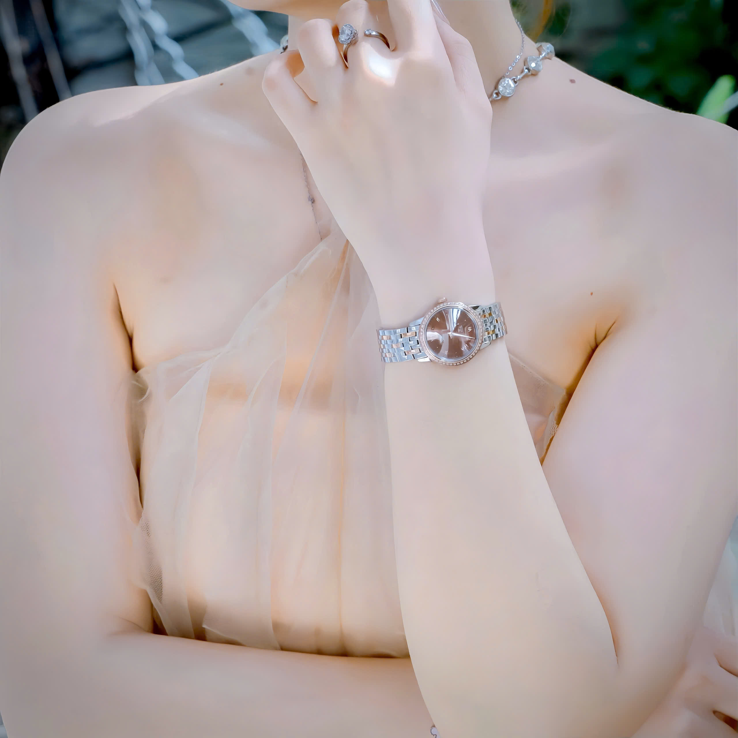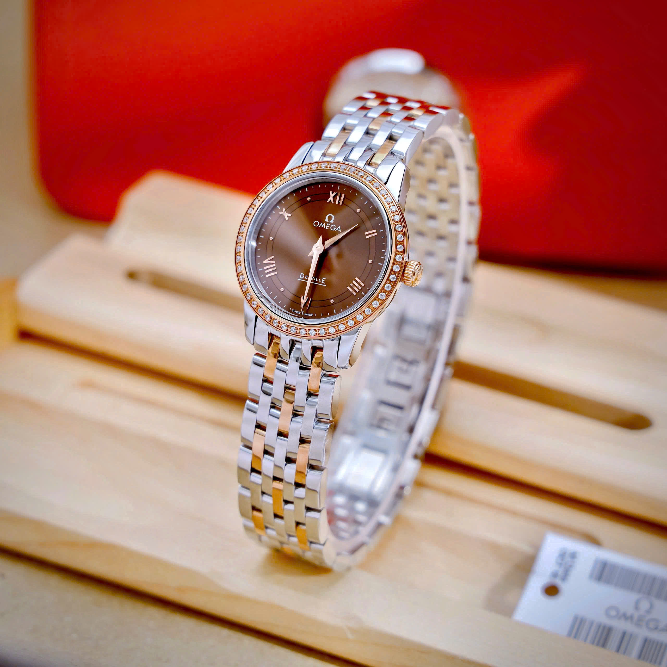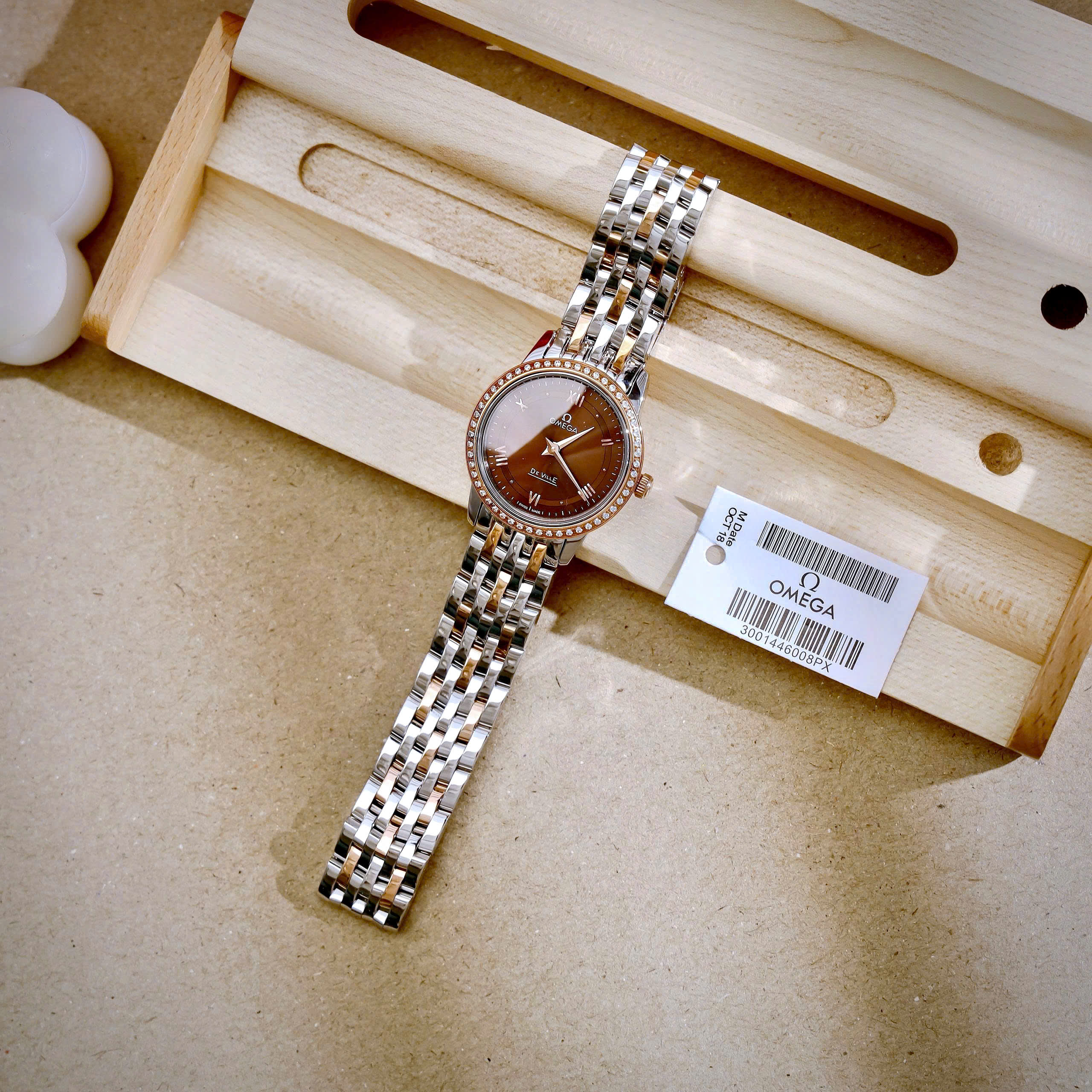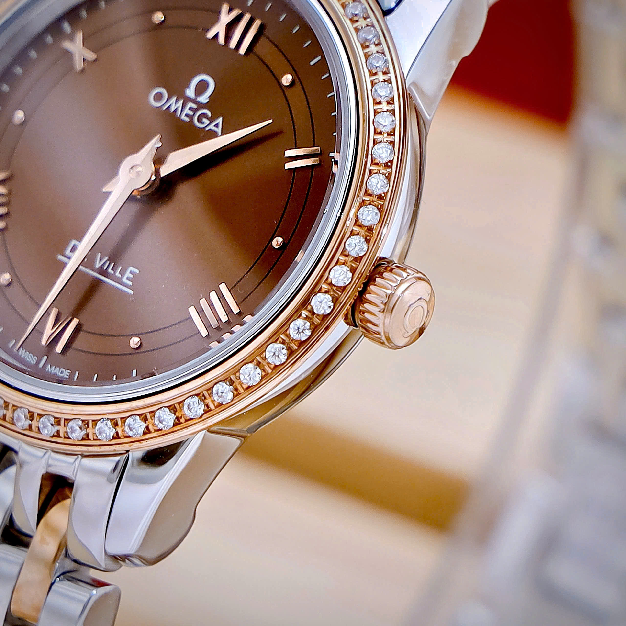 Đặt mua Đồng hồ Omega De Ville Prestige nữ mặt nâu chocolate đính đá fake cao cấp 28mm