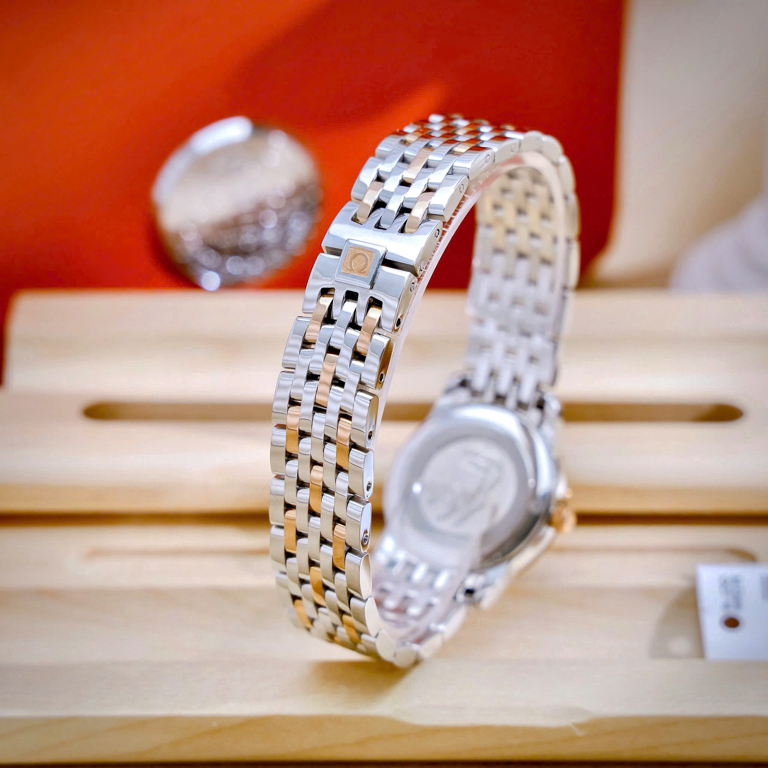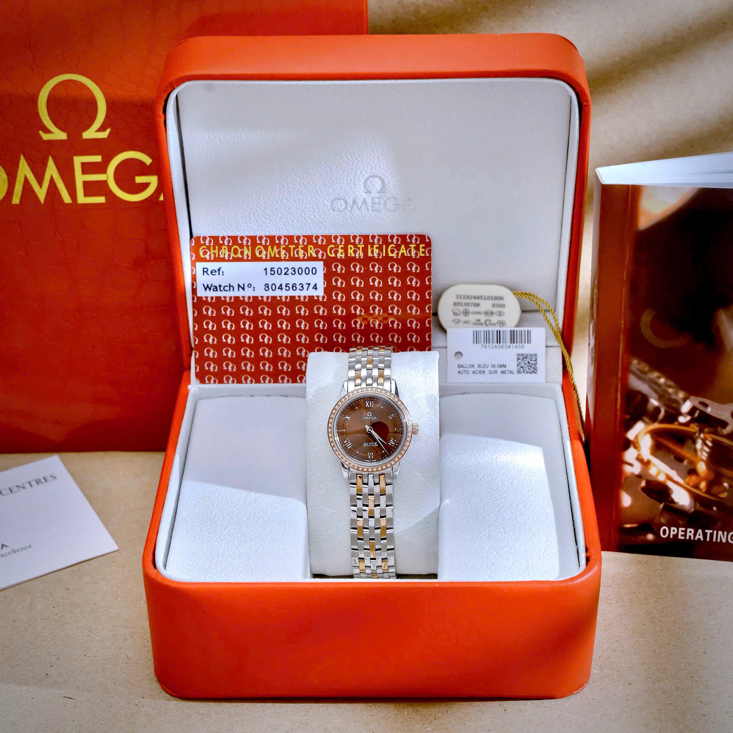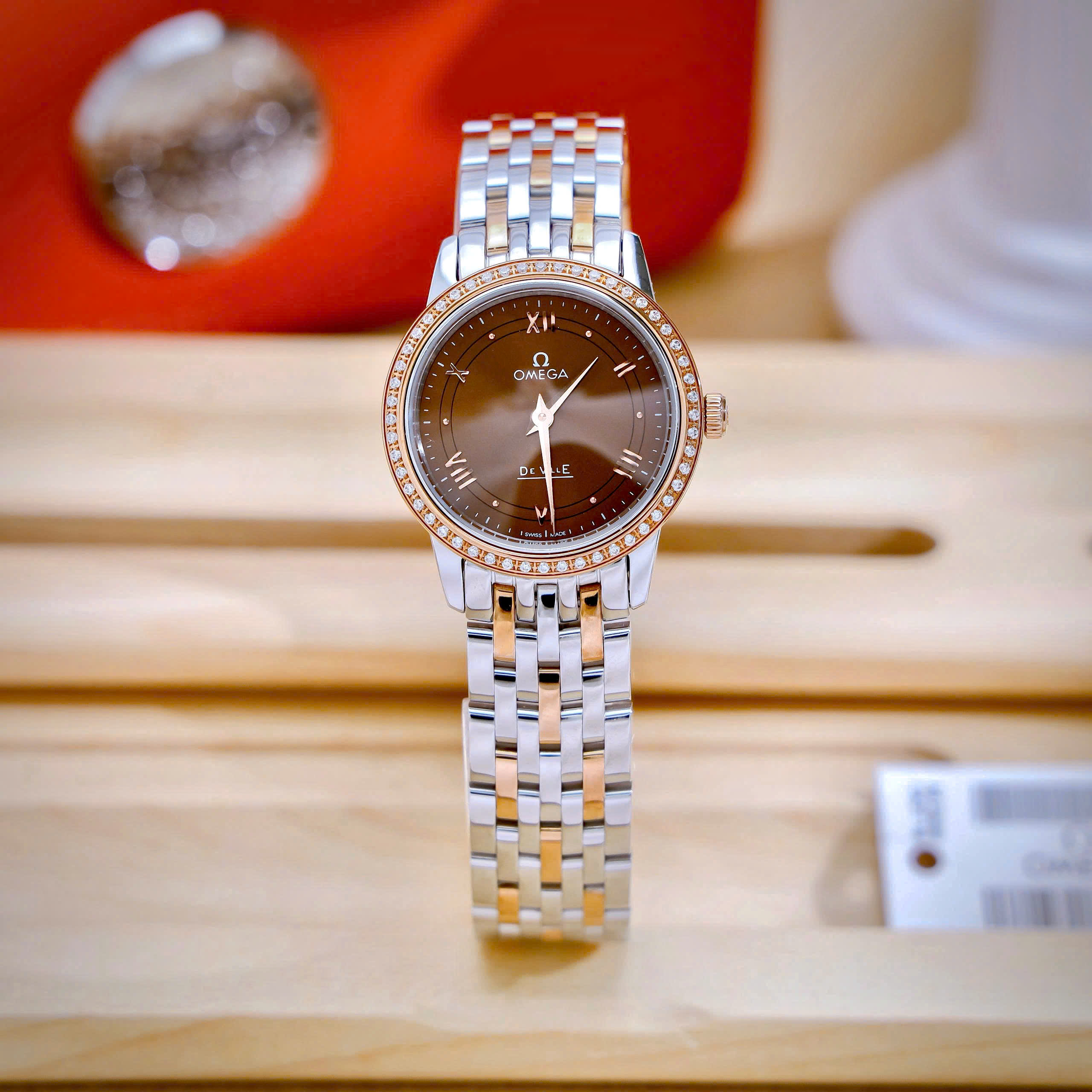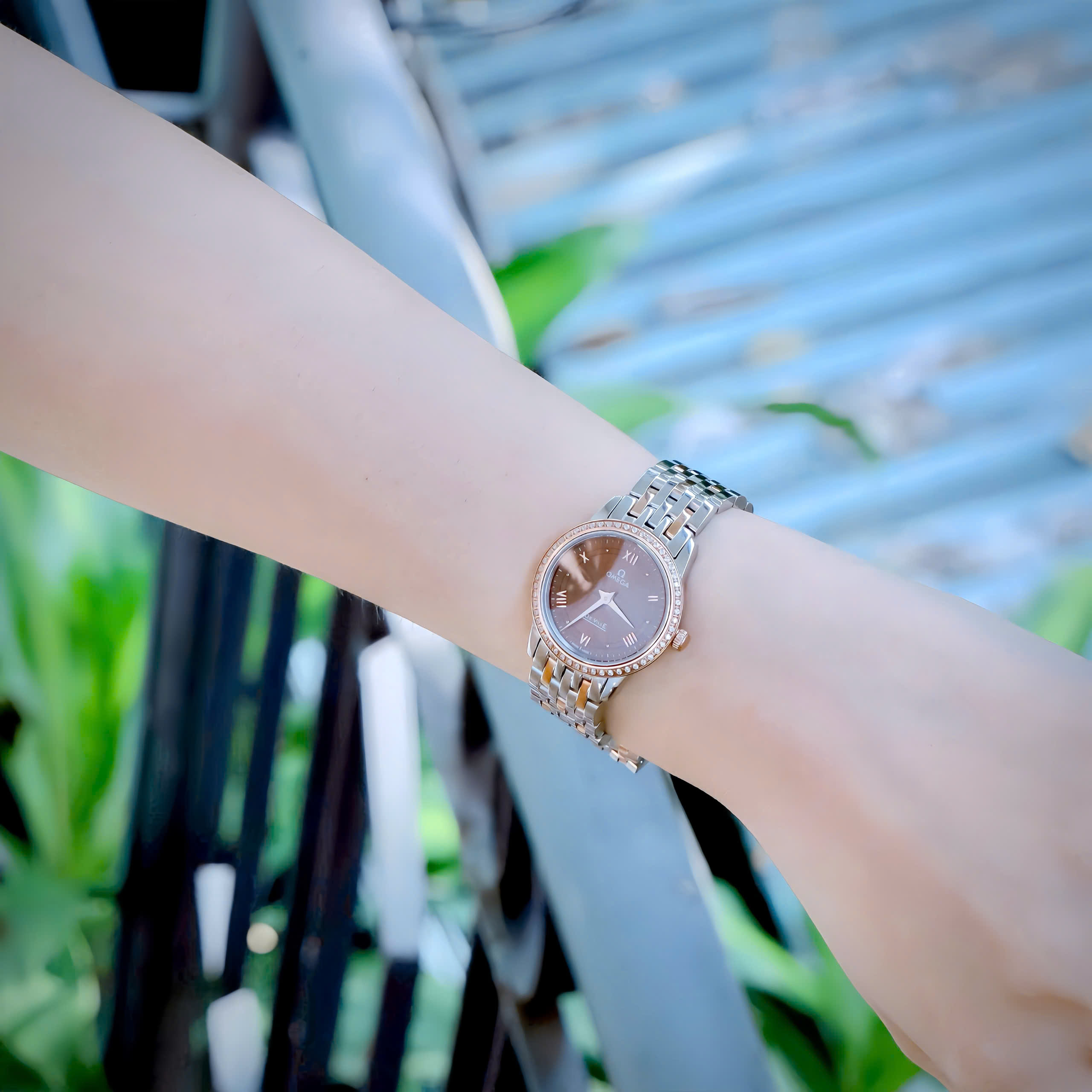 Đồng hồ Omega De Ville Prestige nữ mặt nâu chocolate đính đá fake cao cấp 28mm