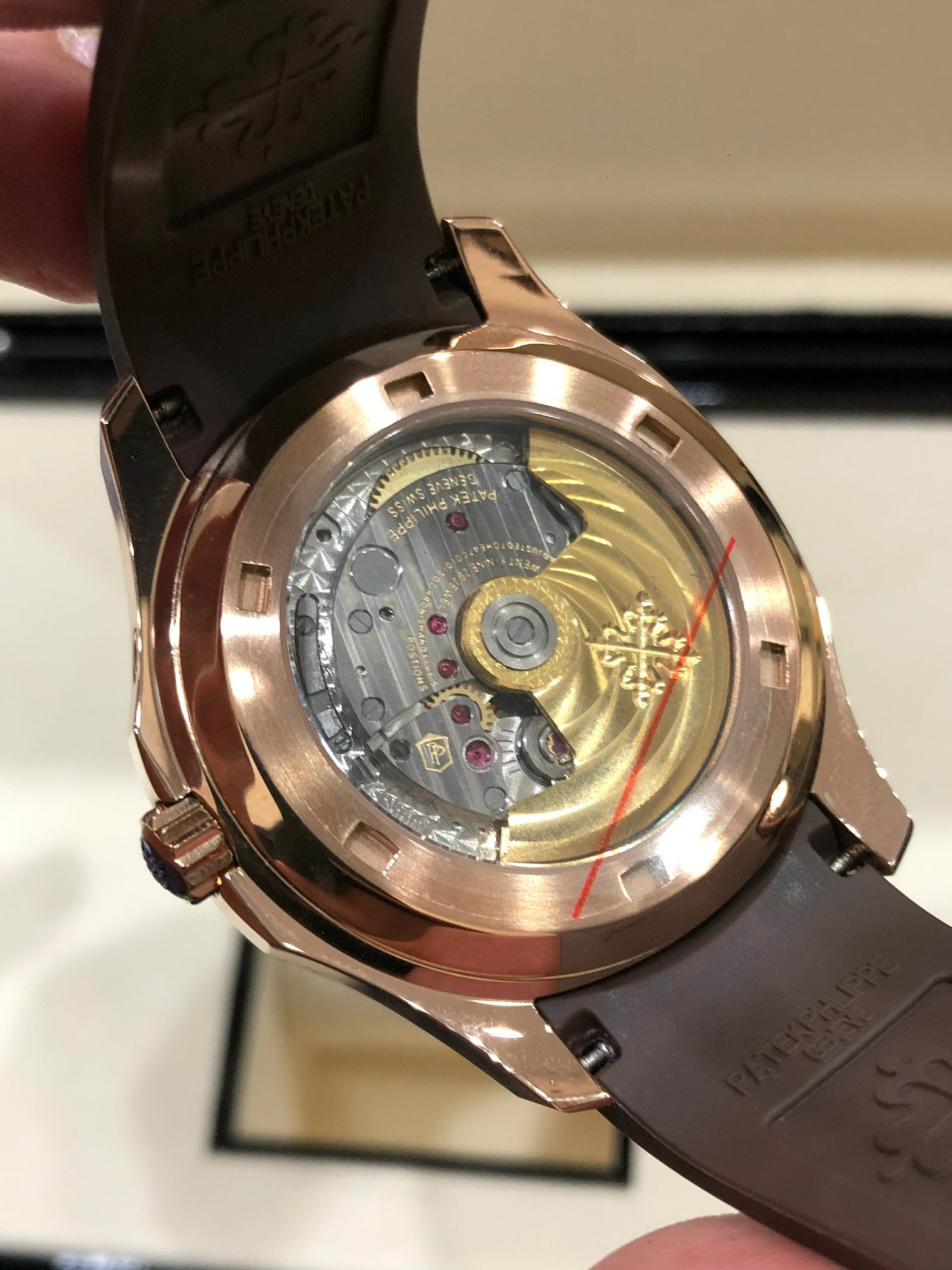 Để cố định bộ dây, Patek Philippe Aquanaut sử dụng cơ chế khóa bướm. Với logo thương hiệu được ghép lại ở chính giữa. Nếu người dùng có cổ tay nhỏ, có thể cắt bớt phần dây cao su thừa sao cho phù hợp. Tuy nhiên, thao tác này chỉ được thực hiện một chiều. Và nếu sau này bạn muốn bán lại chiếc đồng hồ cho người có cổ tay lớn hơn thì chỉ có một cách duy nhất: mua bộ dây mới.