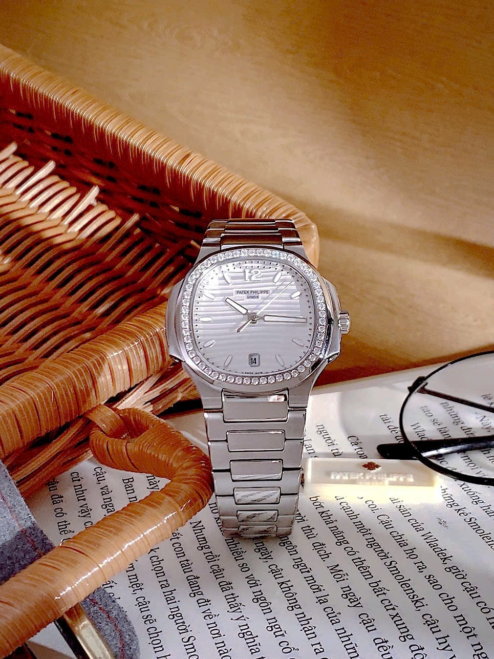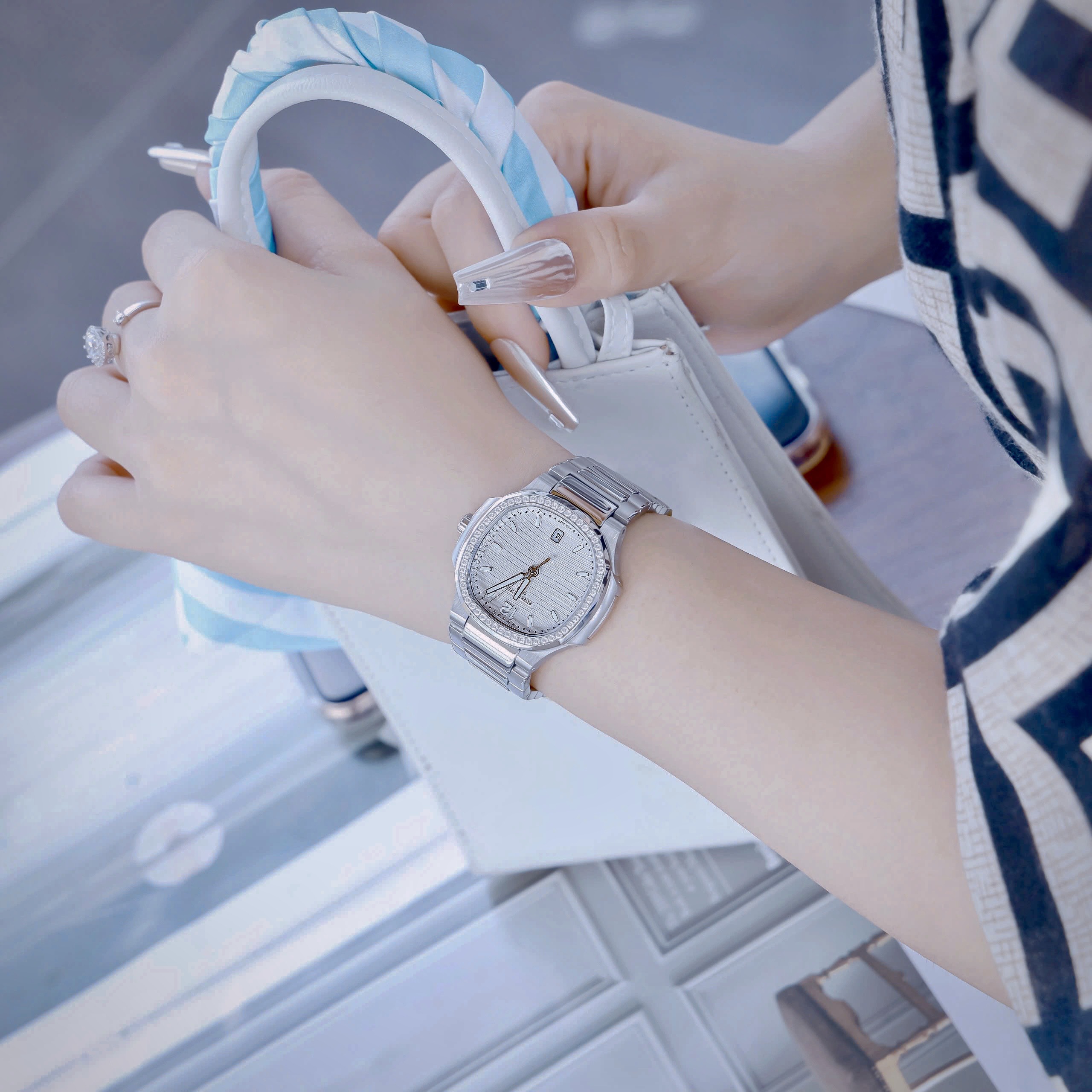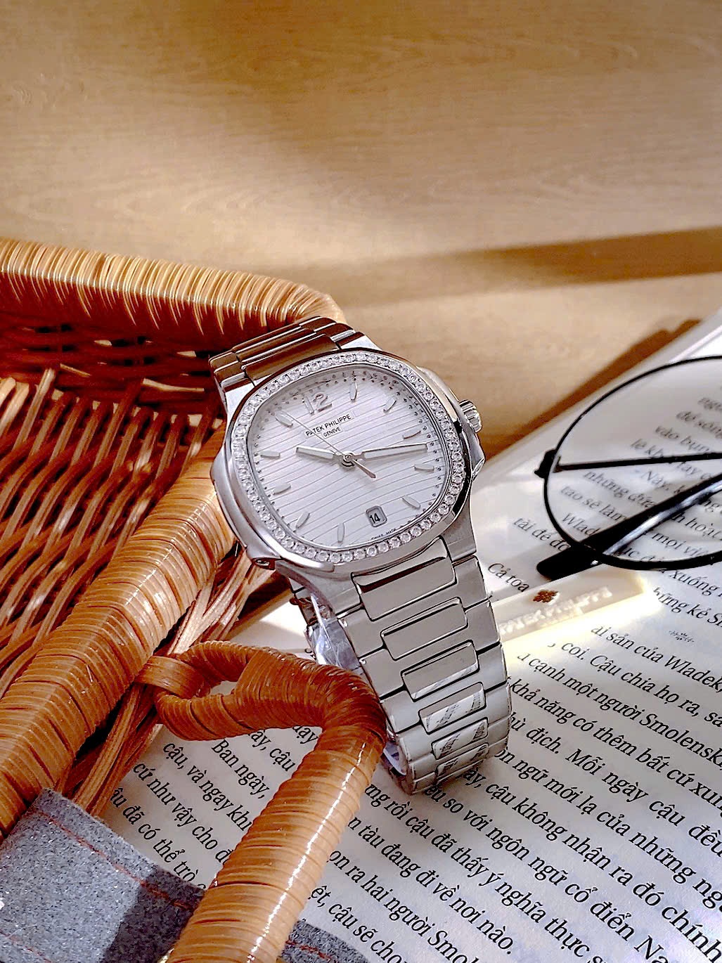 Đồng hồ Patek Philippe Nautilus nữ niềng đá mặt trắng Fake cao cấp 35mm