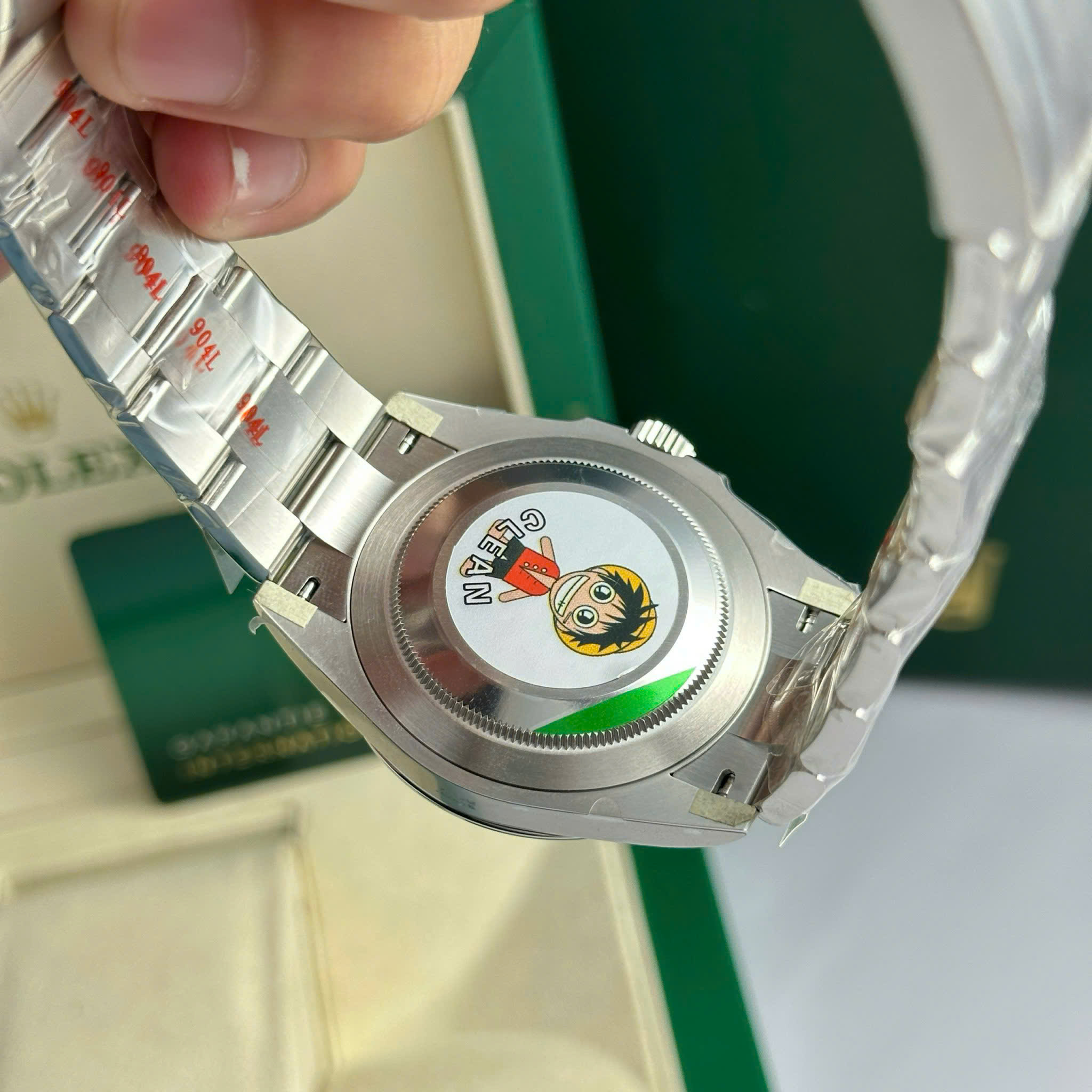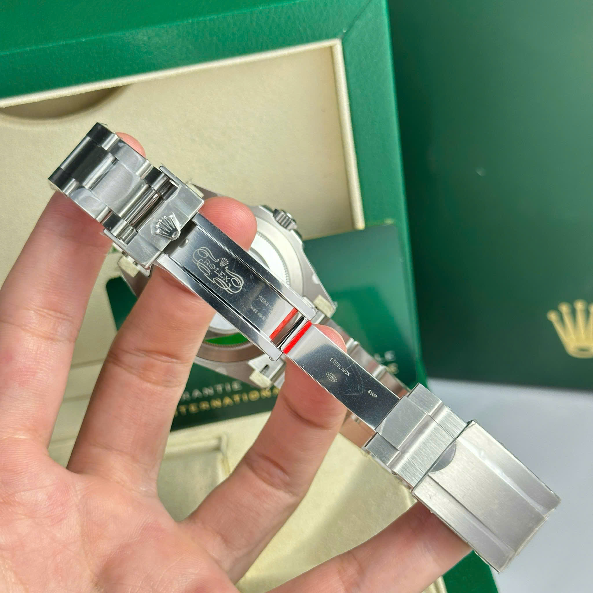 Mặt số đen sơn mài nổi bật với cọc số Ả Rập cùng bộ kim Mercedes chế tác từ thép không gỉ đánh bóng, trong đó cọc số 3, 6, 9 giờ được phủ dạ quang Chromalight. Thiết kế đặc trưng bao gồm các chi tiết như vòng tròn màu vàng, logo Rolex và kim giây màu xanh lục. Mẫu đồng hồ nam Rep 1:1 này được trang bị bộ máy Calibre 3230 với tần số dao động 28.800vph, đi kèm chế độ bảo hành lên đến 5 năm. Dây đeo Oyster với 3 mối nối chắc chắn, tích hợp khóa an toàn Oysterlock và cơ chế tiện ích Easylink, mang đến sự thoải mái và tiện lợi khi sử dụng.