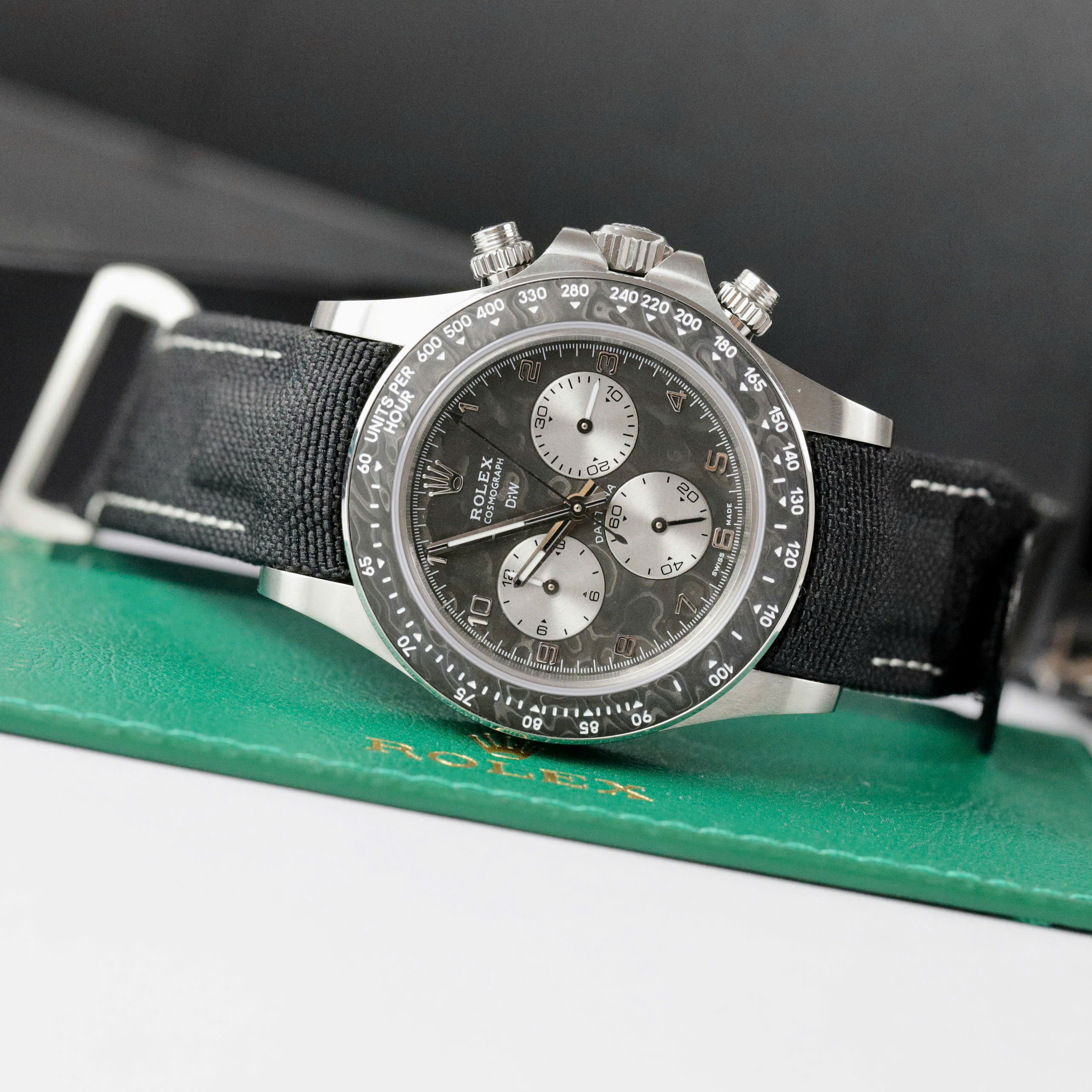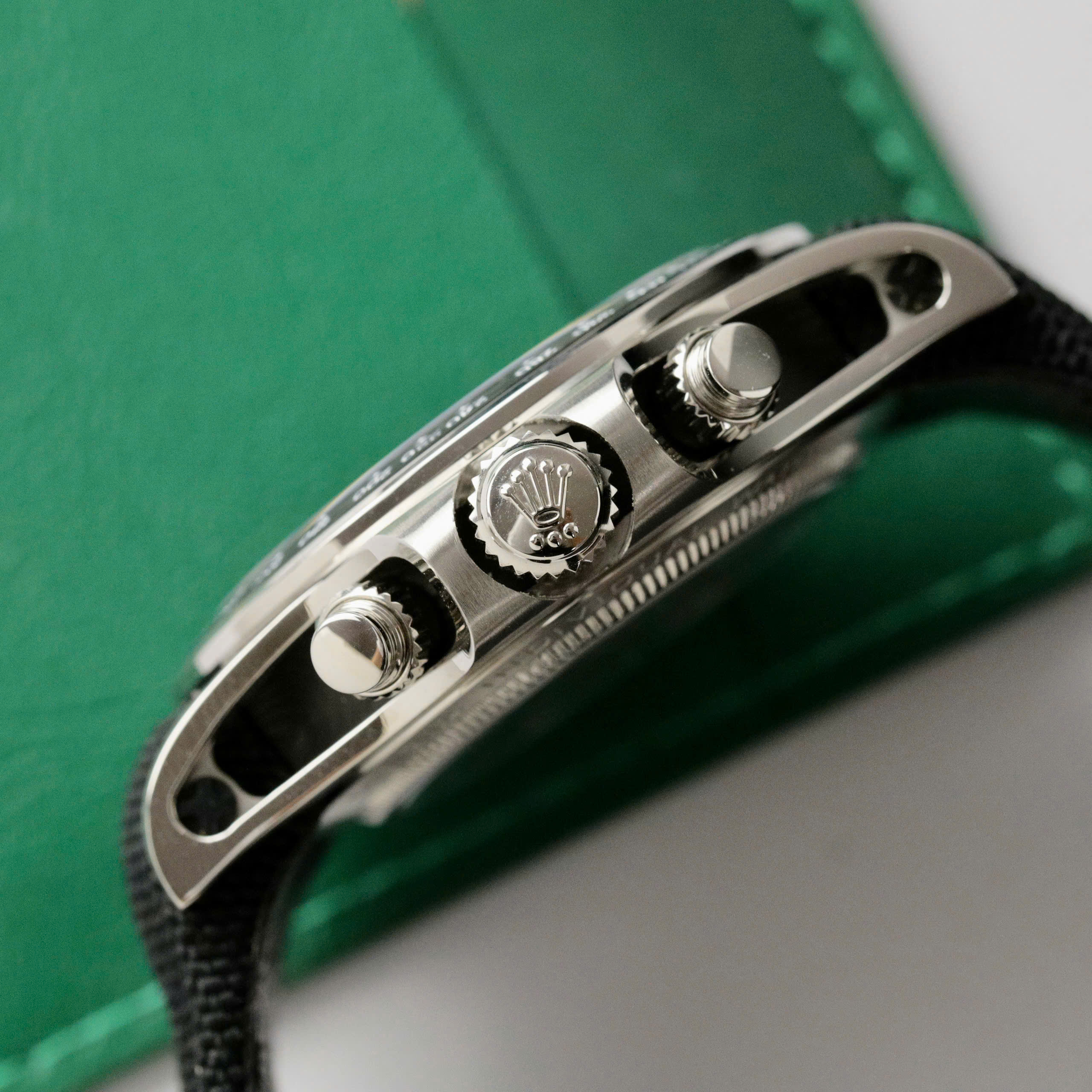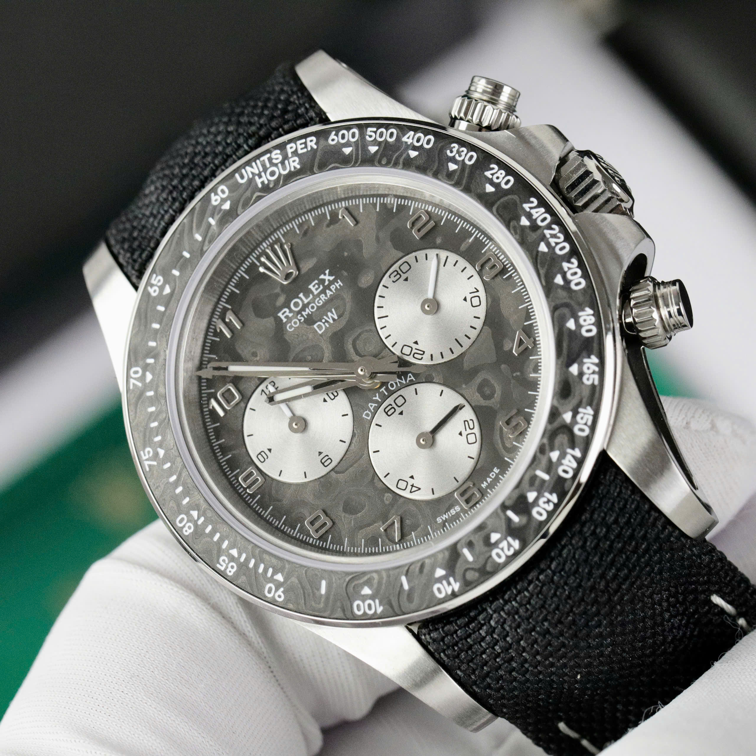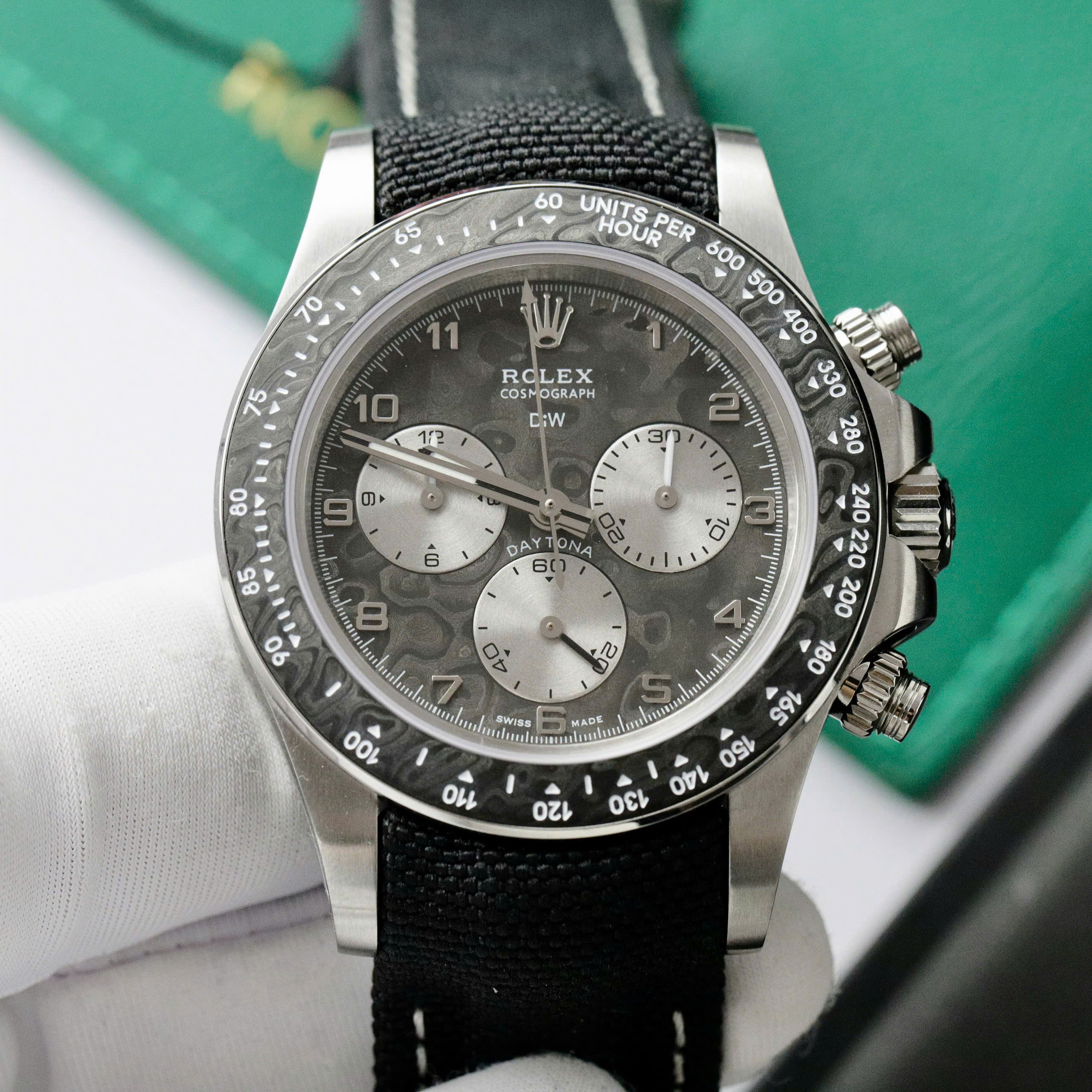 Hôm nay, DWatch xin giới thiệu mẫu Đồng hồ Rolex Cosmograph Daytona DiW Rep 11 dây vải canvas 40mm, được cung cấp với mức giá cực kỳ hợp lý nhưng chất lượng lại đạt tới 98% so với bản chính hãng. Độ chênh lệch giữa phiên bản replica và chính hãng gần như không thể nhận ra.