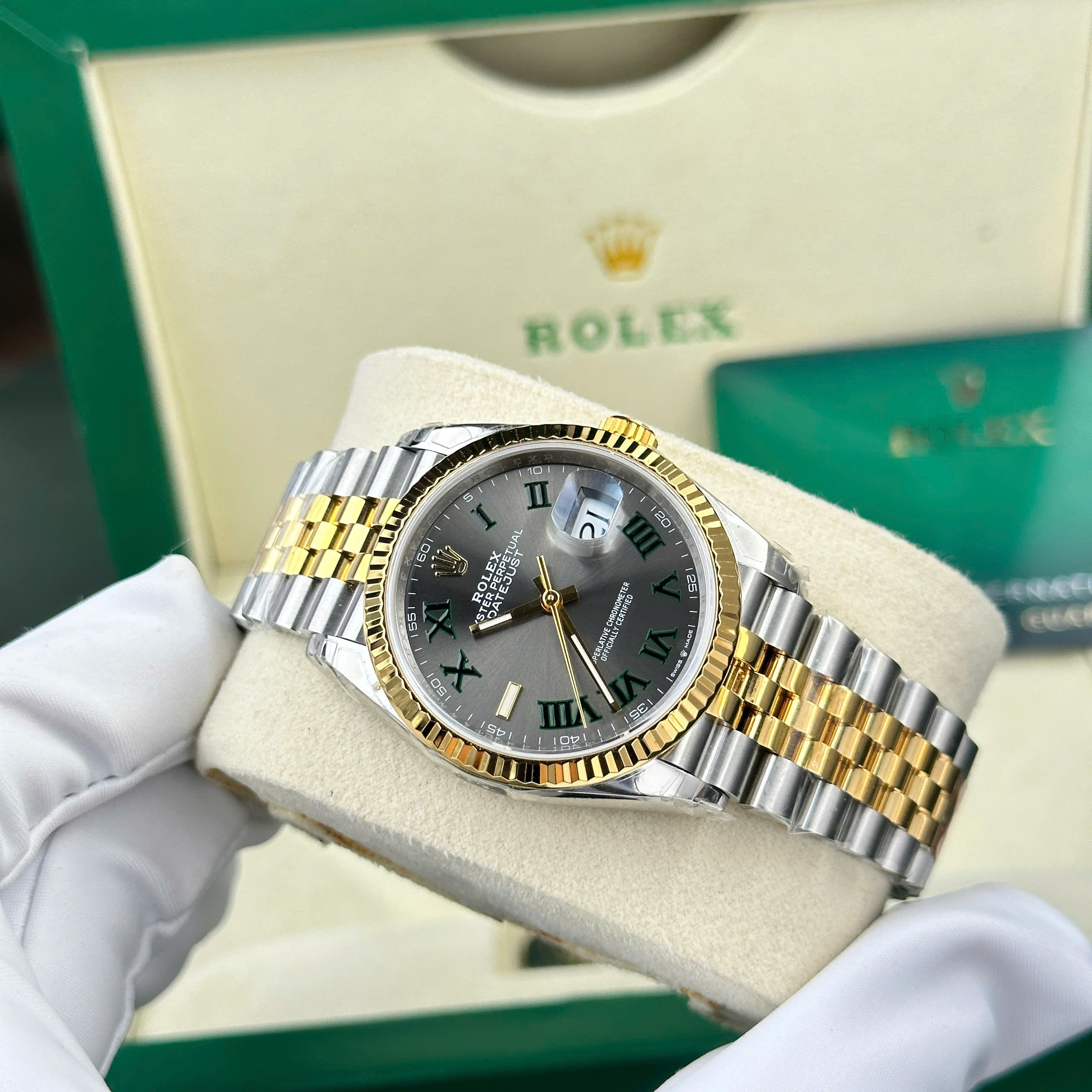 Đồng hồ Rolex DateJust 126231 Rep 11 mặt số wimbledon màu demi vàng gold nhà máy VS 36mm phiên bản cao cấp nhất tại DWatch.