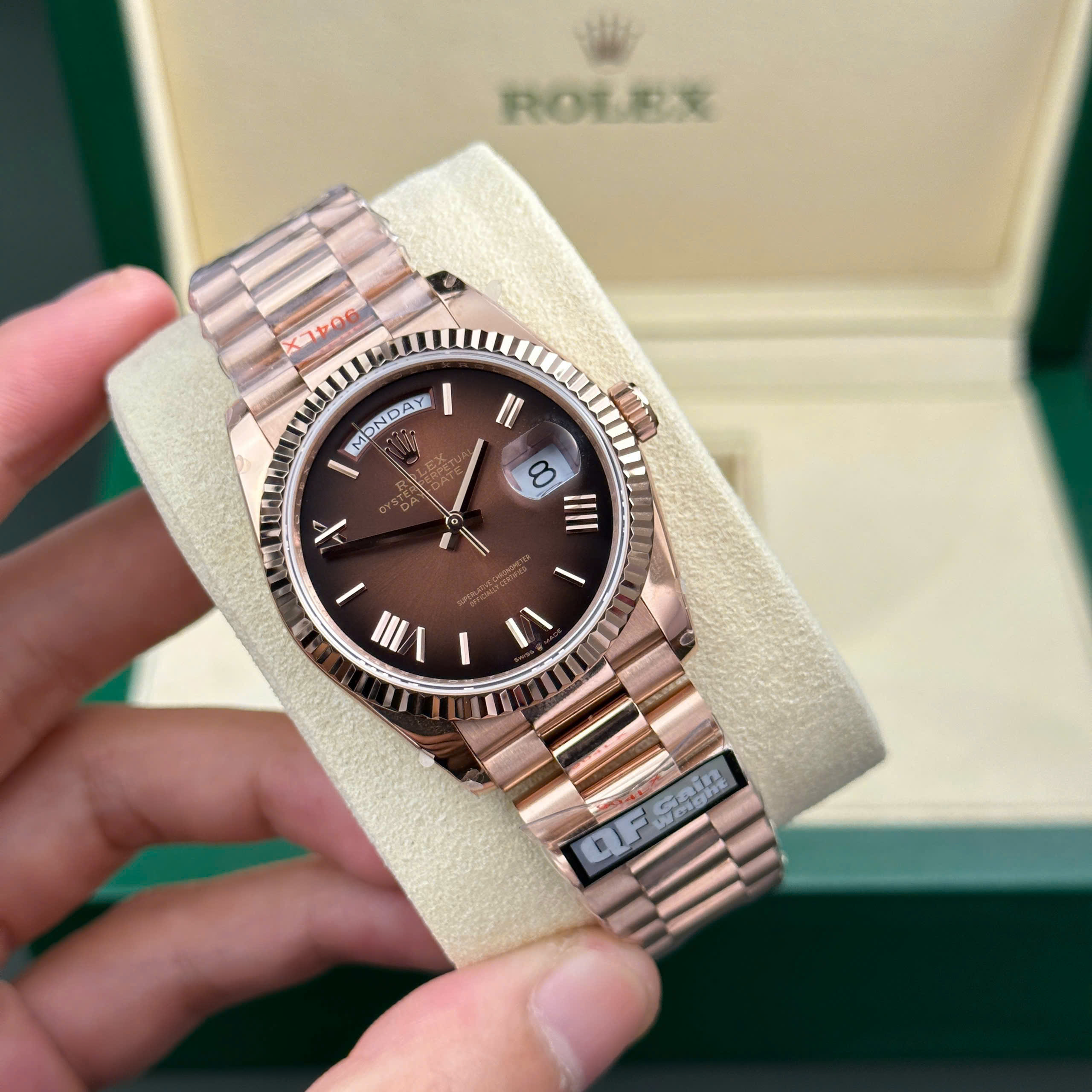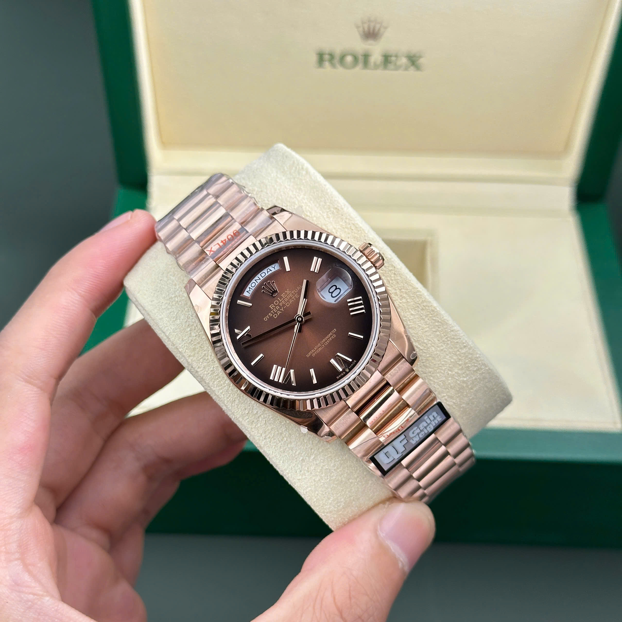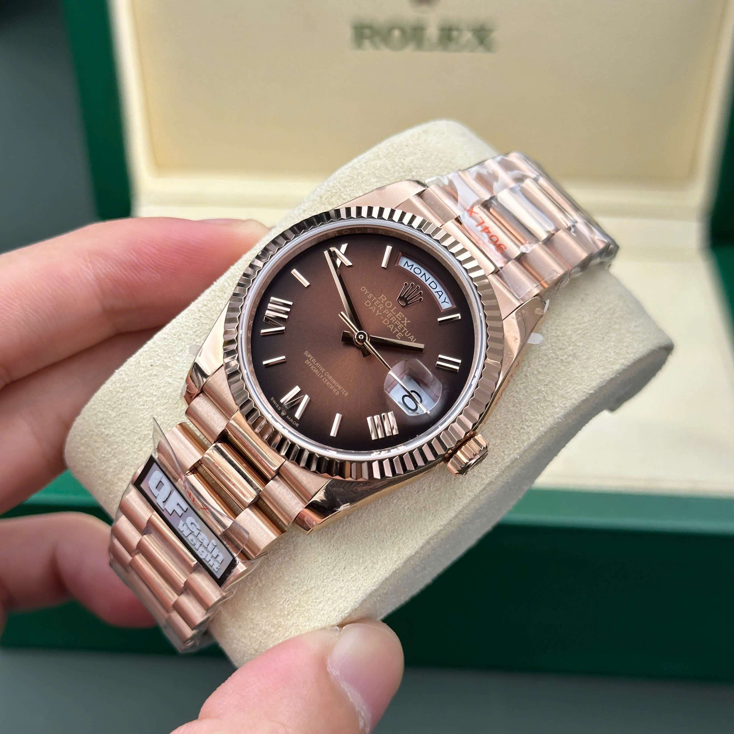 Đồng Hồ Rolex Day-Date 128235 Rep 11 mặt chocolate trọng lượng 158gram nhà máy QF 36mm là một tác phẩm hoàn mỹ, kết hợp sự tinh tế trong thiết kế và chất lượng ưu việt, chắc chắn sẽ là lựa chọn xứng đáng cho những ai trân quý thời gian và phong cách.