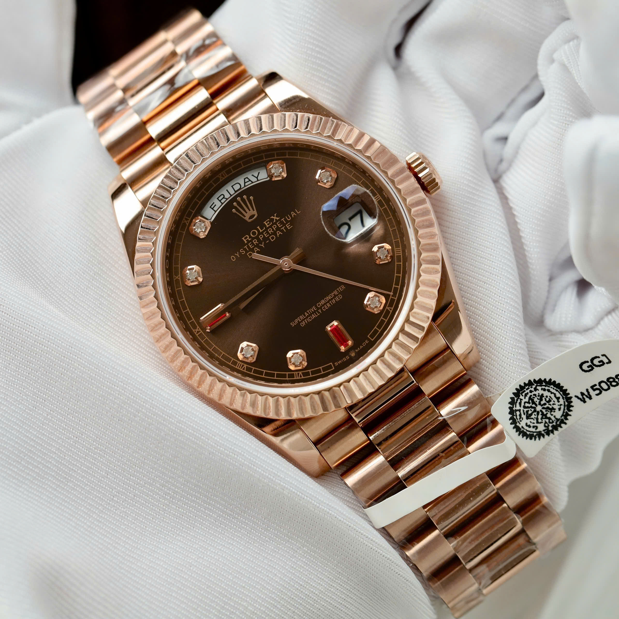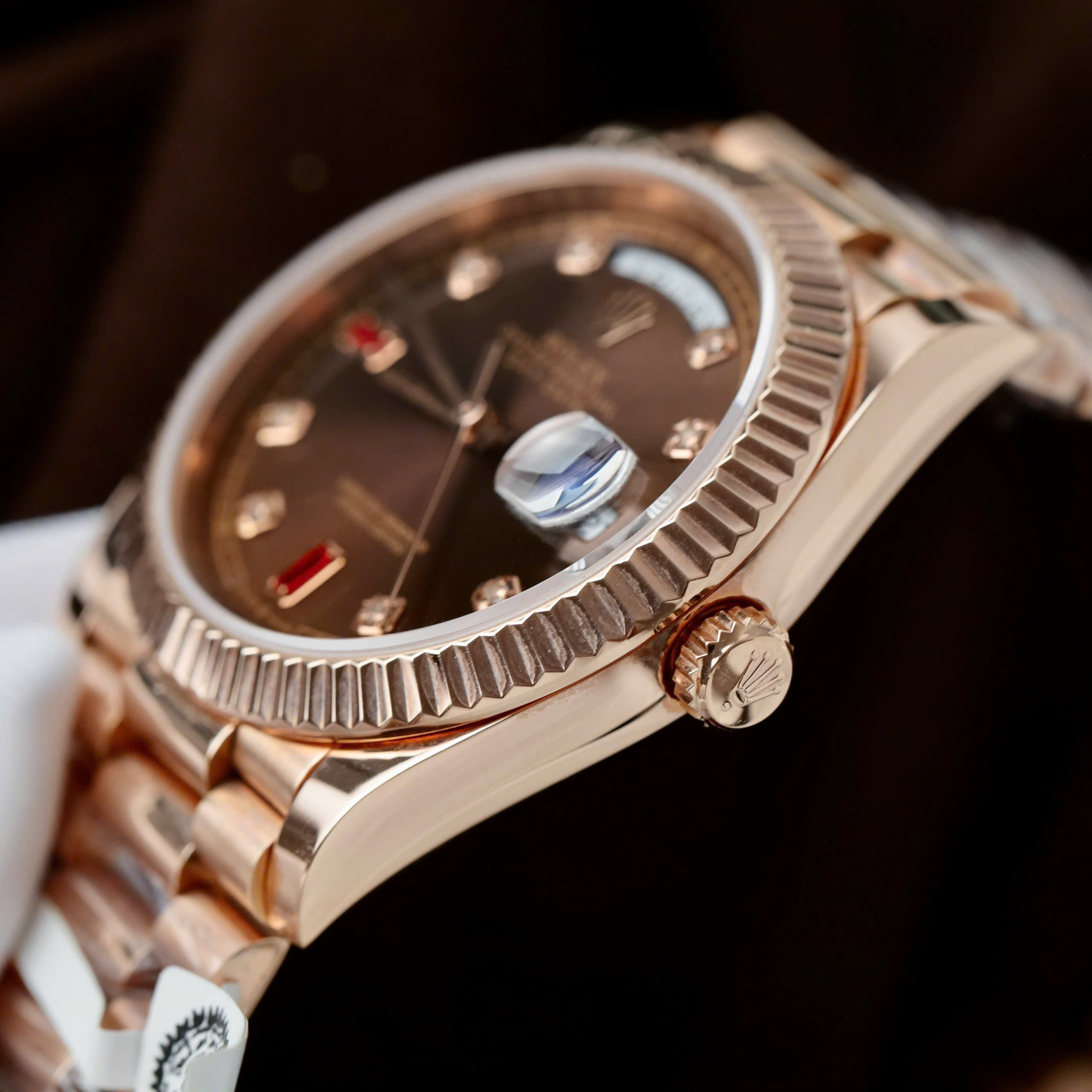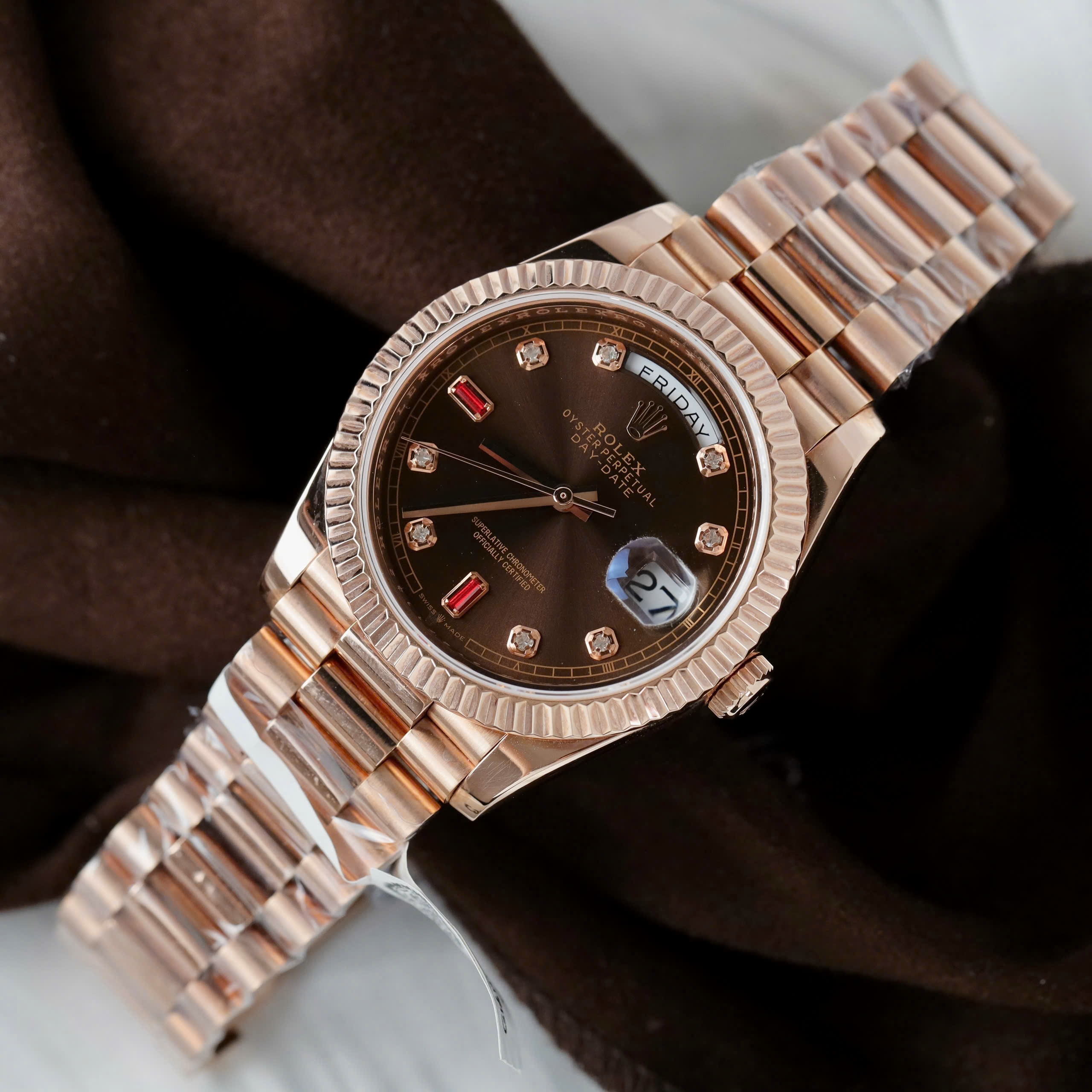 Đặt mua Đồng Hồ Rolex Day-Date Bọc Vàng Hồng Rep 11 Mặt Chocolate Cọc Số Đính Đá Ruby 40mm