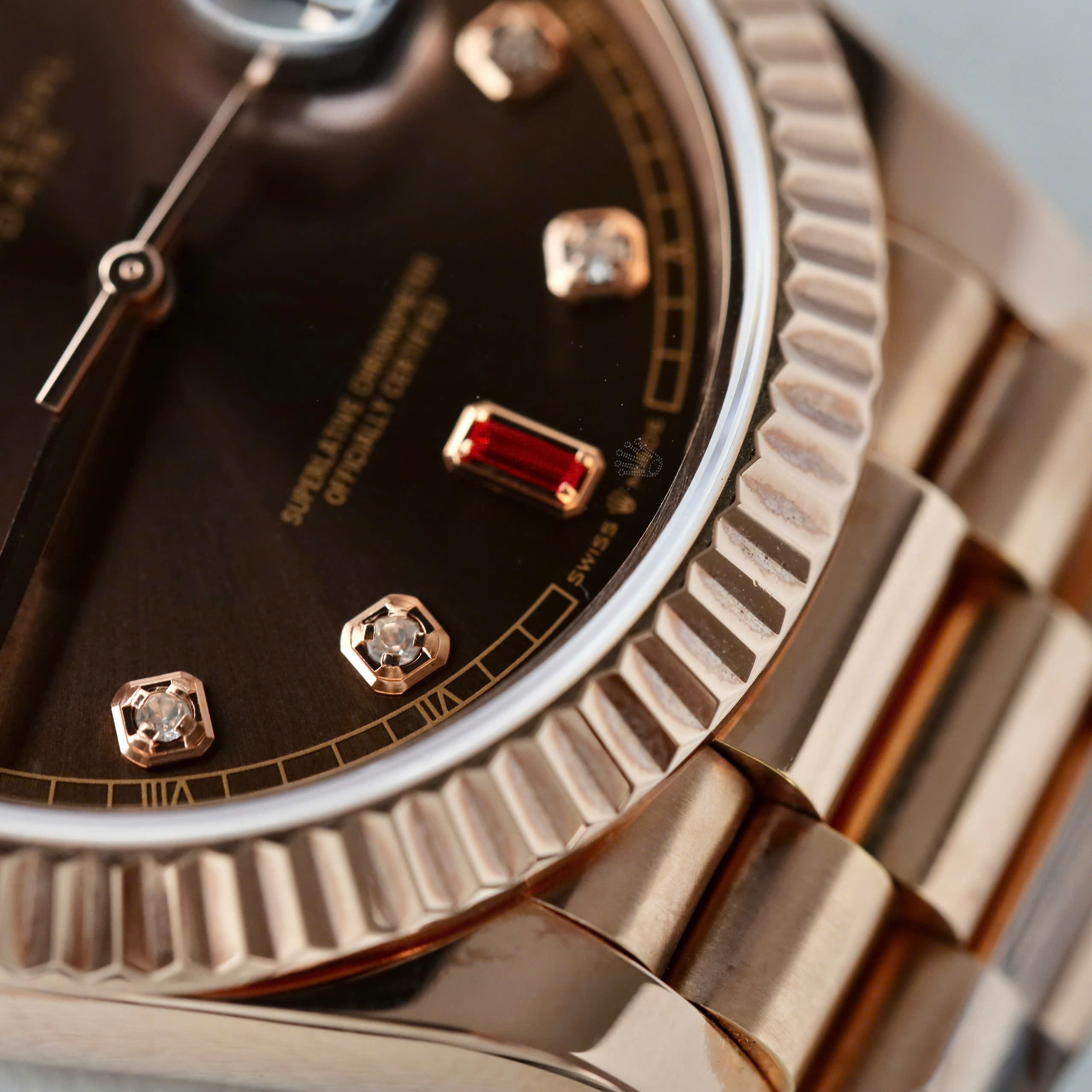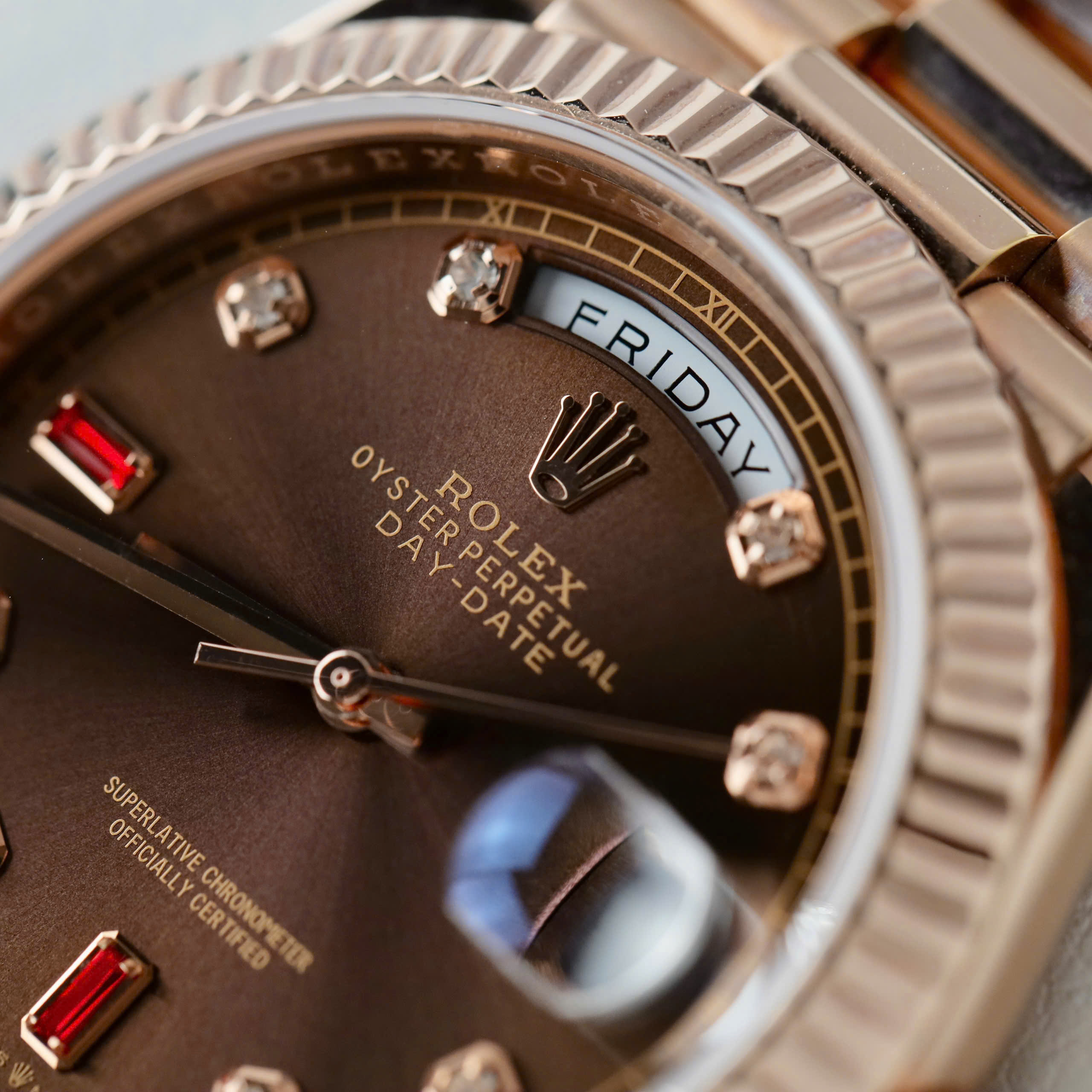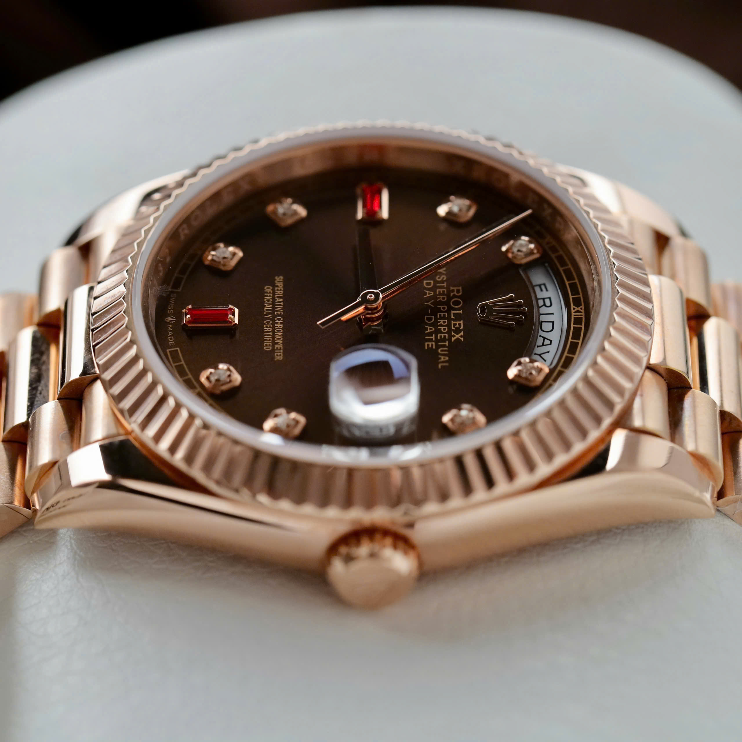 Đồng Hồ Rolex Day-Date Bọc Vàng Hồng Rep 11 Mặt Chocolate Cọc Số Đính Đá Ruby 40mm