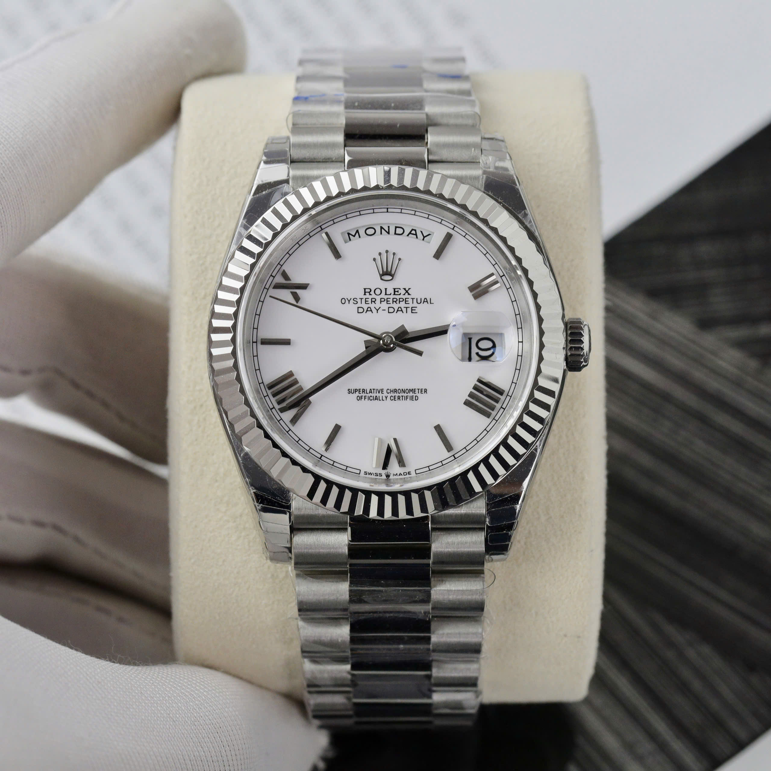 Đồng hồ Rolex Day-Date Fake 1 1 mặt trắng cọc số la mã nhà máy EW 40mm