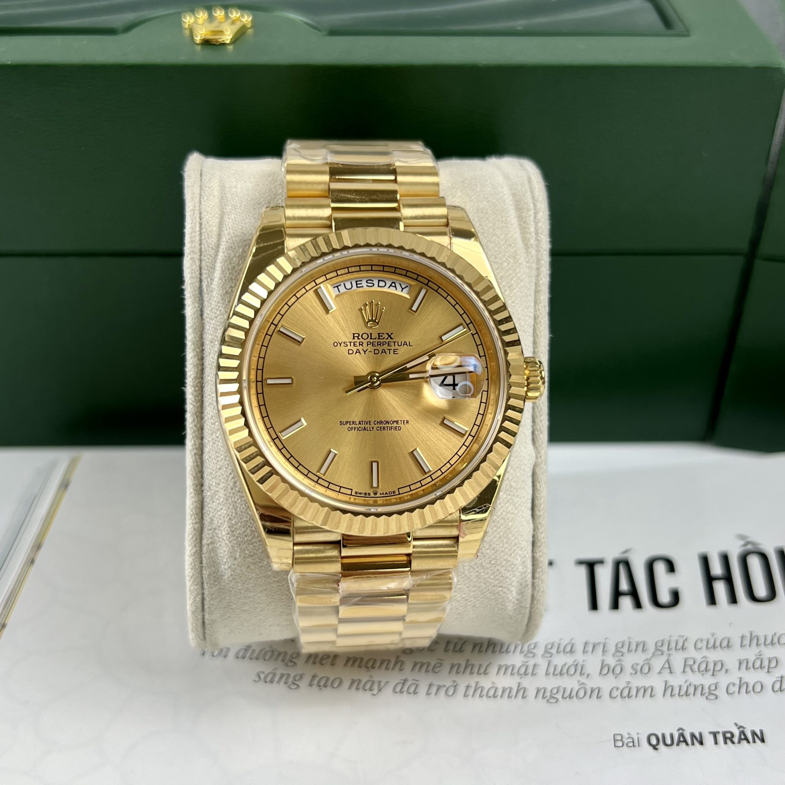 Hãy cùng DWatch Thế Giới Đồng Hồ Đẹp tham khảo mẫu Đồng hồ Rolex Day-Date Replica 1:1 màu vàng Gold EW Factory 40mm nhé !