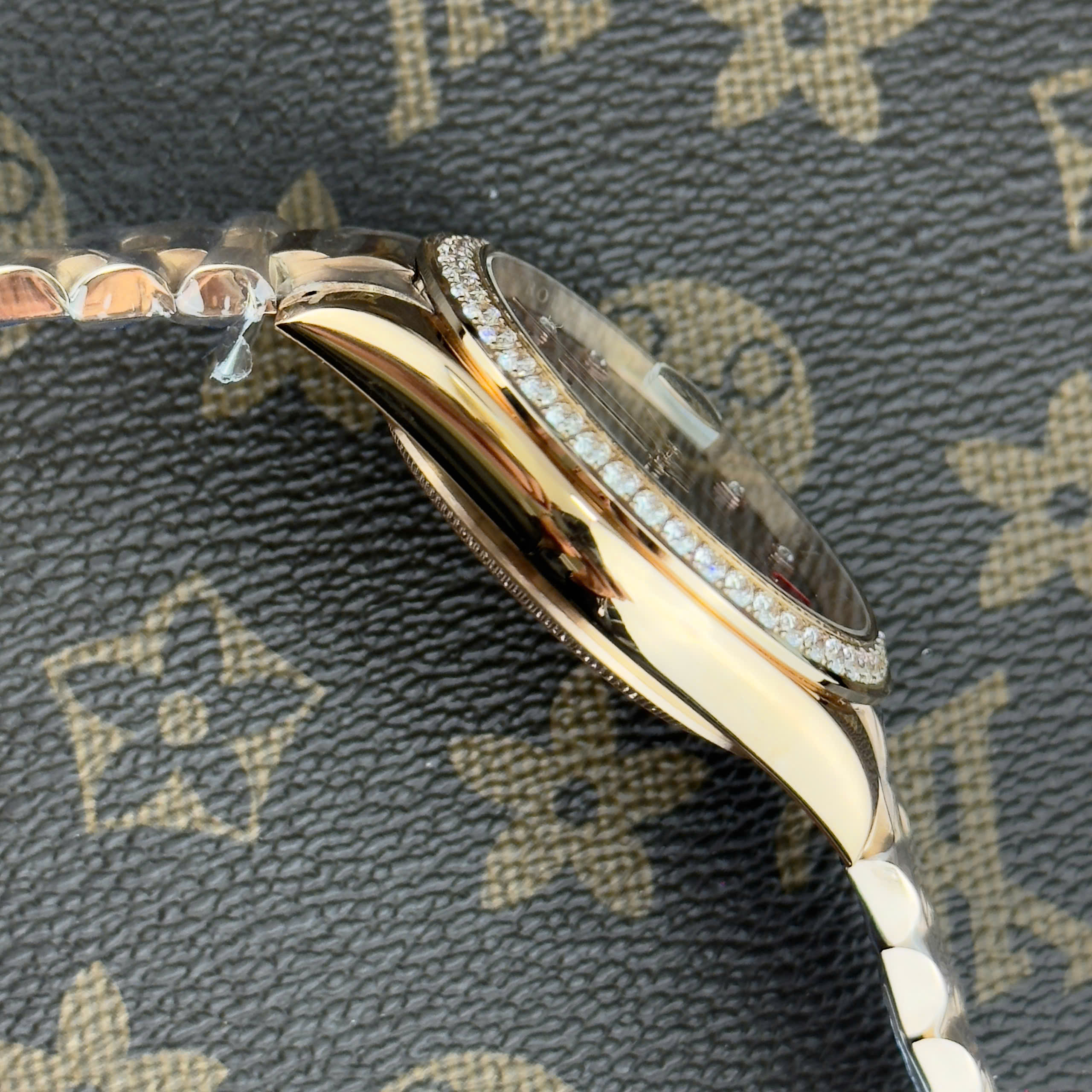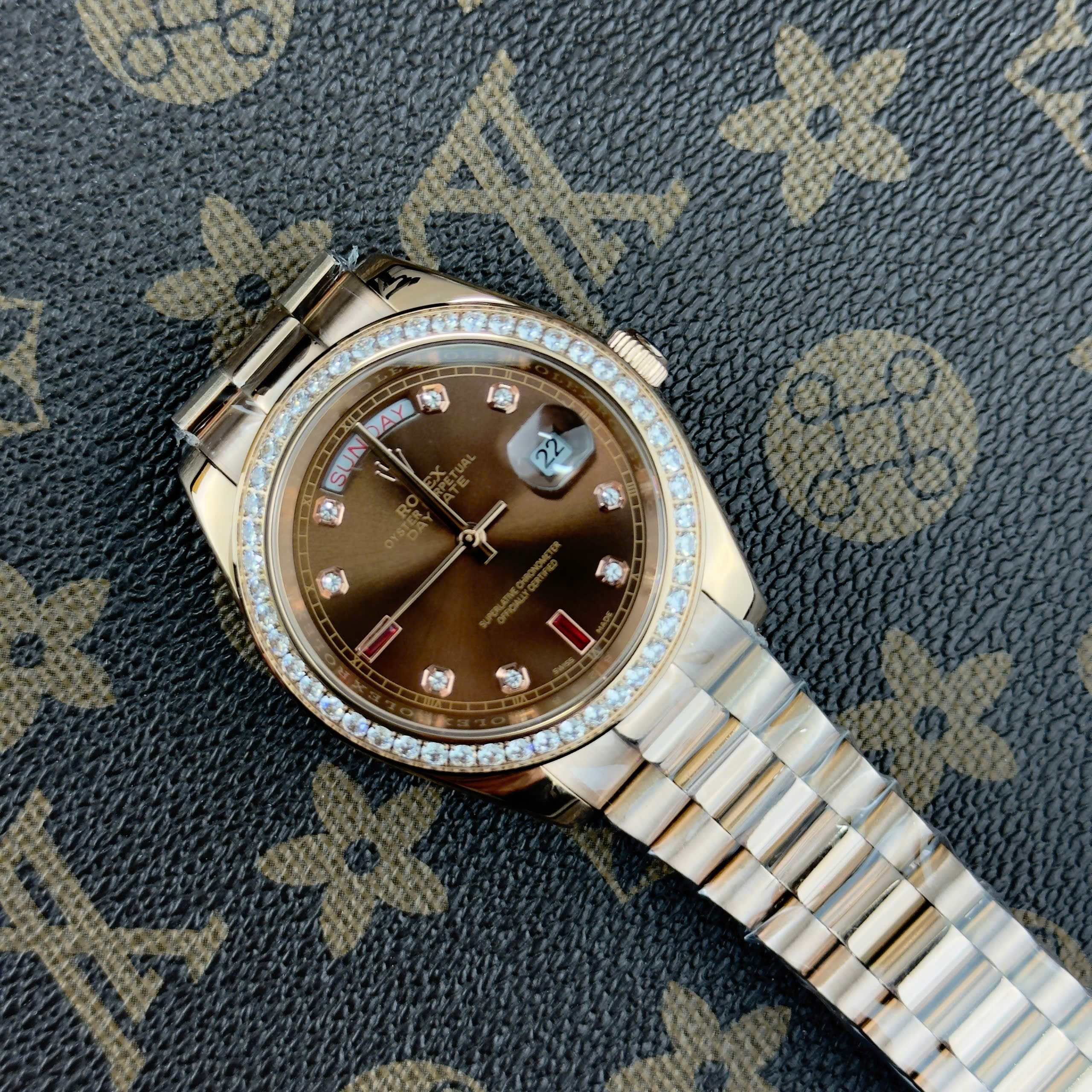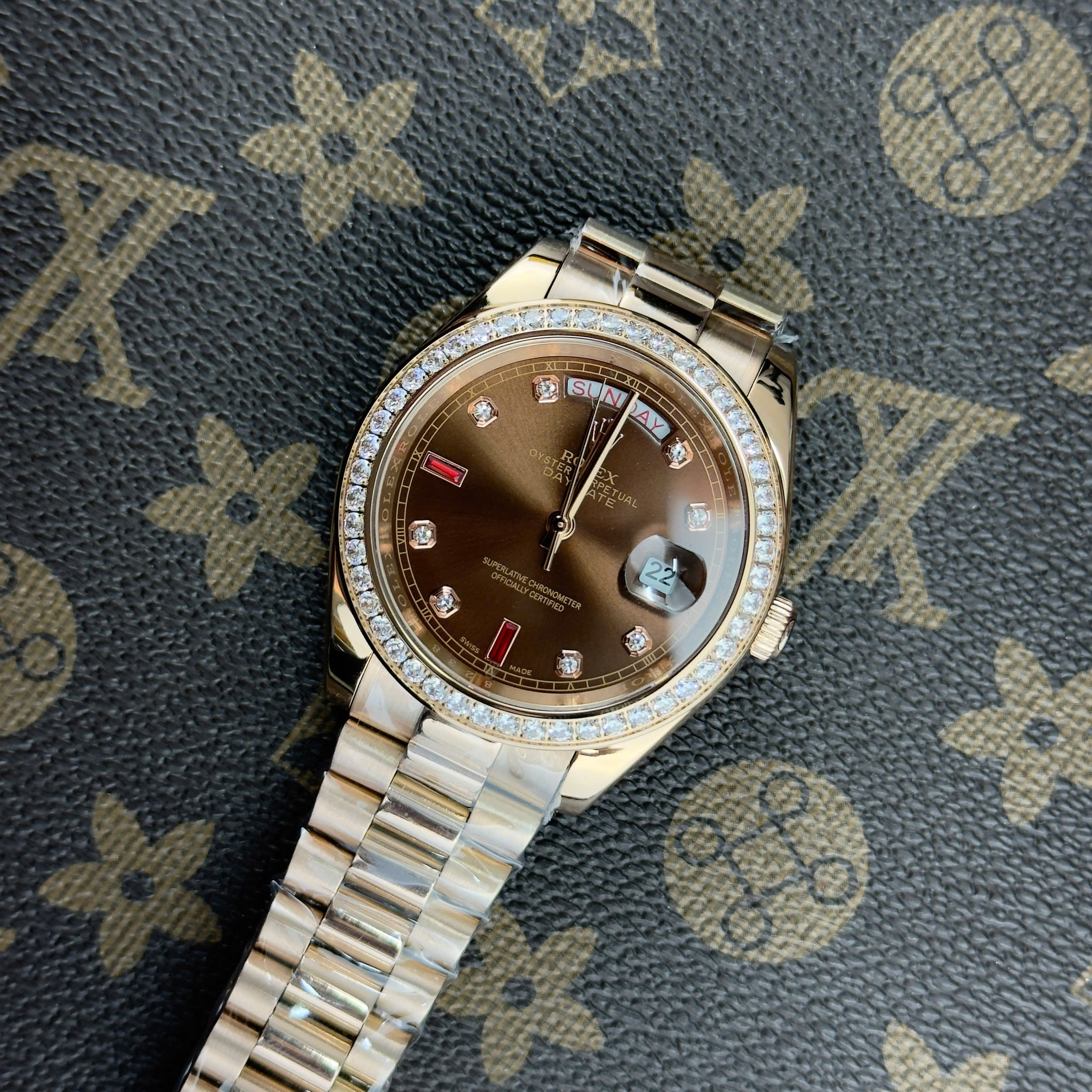 Đặt mua Đồng Hồ Rolex Day-Date vàng hồng mặt số chocolate đính đá fake cao cấp 41mm